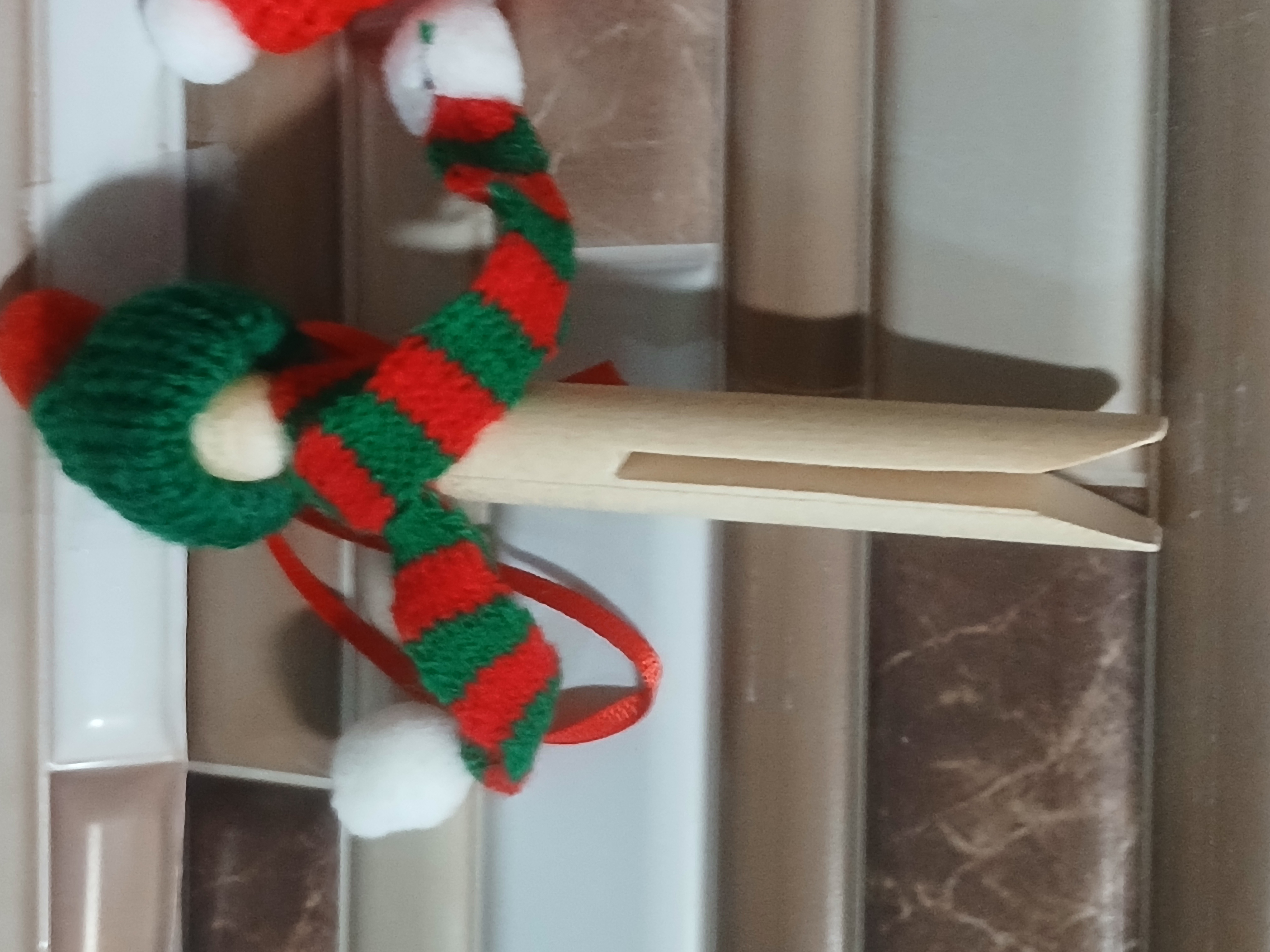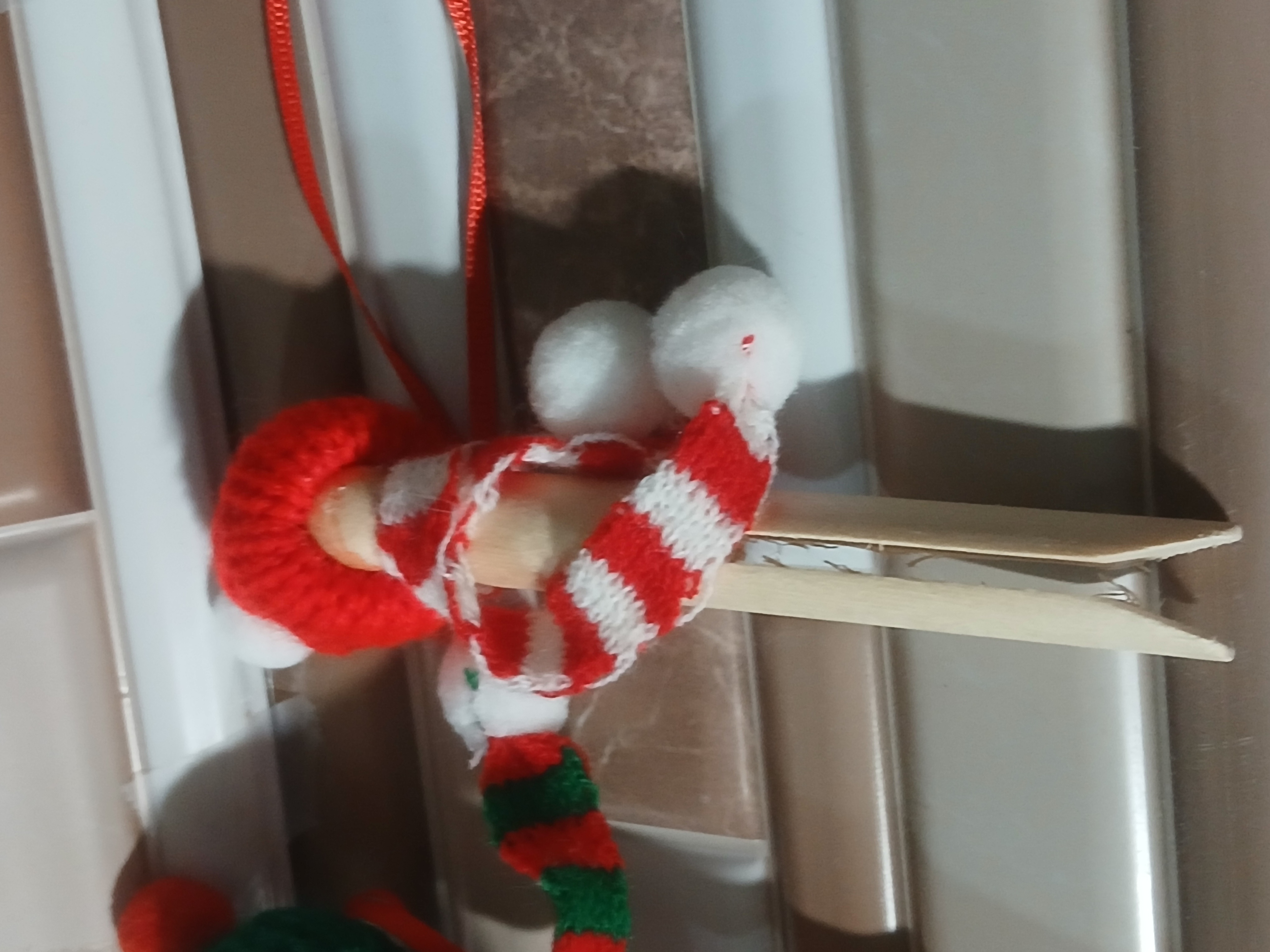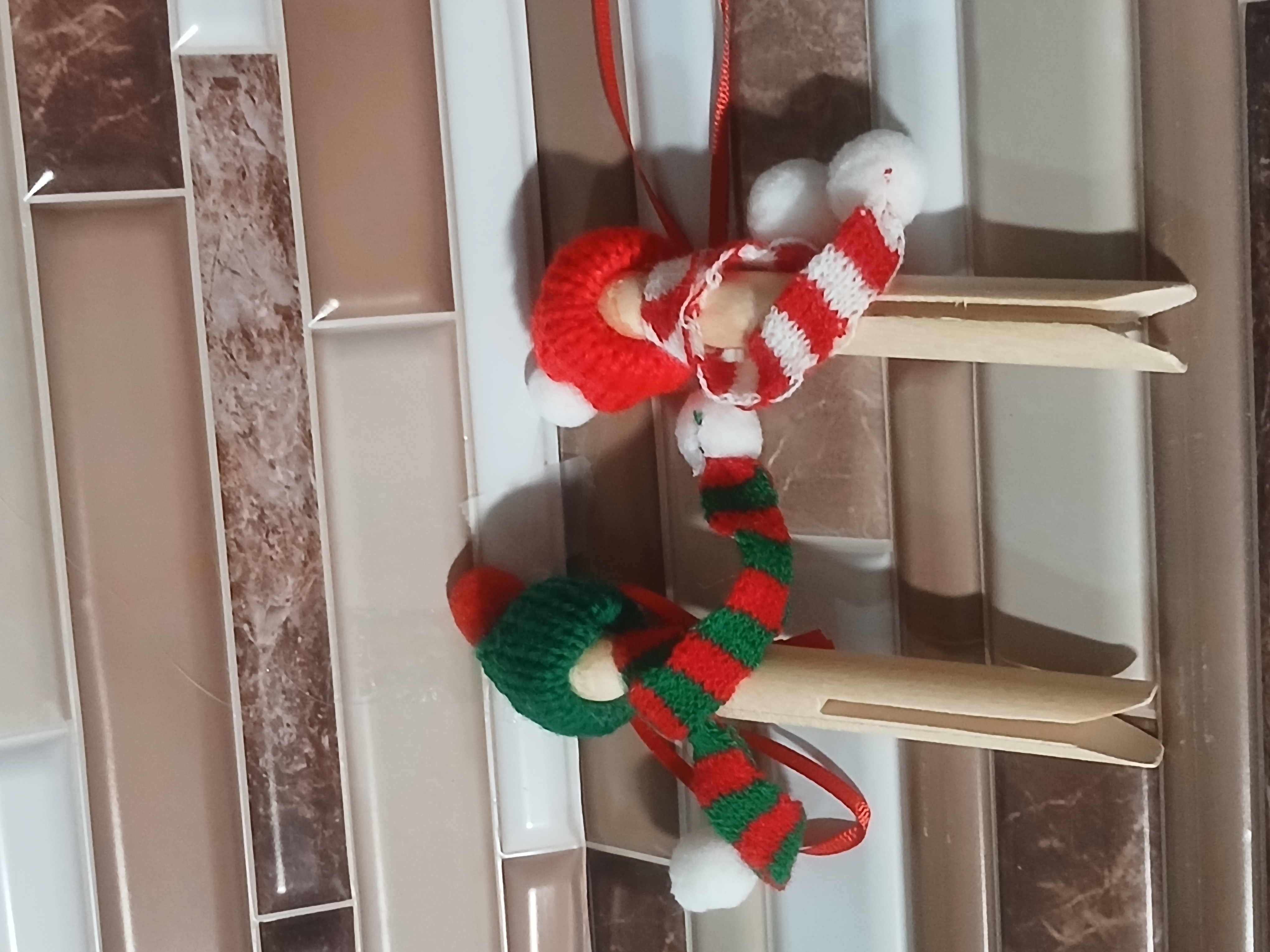 This pair of ornaments are made of old fashioned clothes pins and dressed in a christmas hat and scarf and with a red hanger will be cute on any tree and you get 2 for a very low price