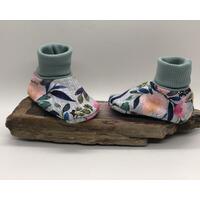 Slip-on baby booties with stay-on cuff. 3-6mo size, with soft polar fleece lining and stretchy organic cotton toes, soles, and cuffs.