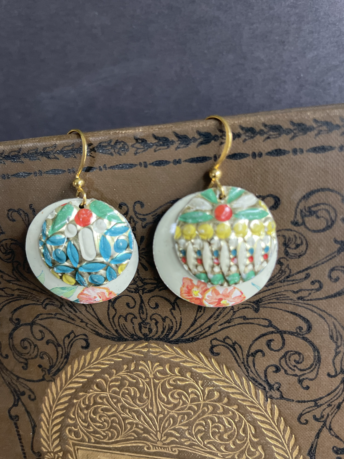 Tins are very light making them ideal for earrings as they don't weigh down your ears as the day goes on. Did you know the proper term for working with tin is "tinkering"? That made me really happy. I literally tinker in my art studio! I use old cookie tins, tea tins, and the like, break them down, and hand cut them into shapes and hand-hammer them into the 3-D shape I want them to be, finish and polish them, before putting them together like any other jewelry.