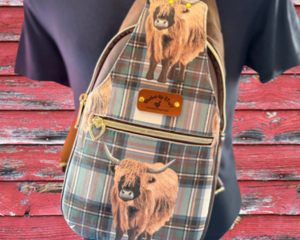 Highland Cow Sling Bag – Waxed Canvas, Faux Leather & Linen C...