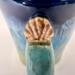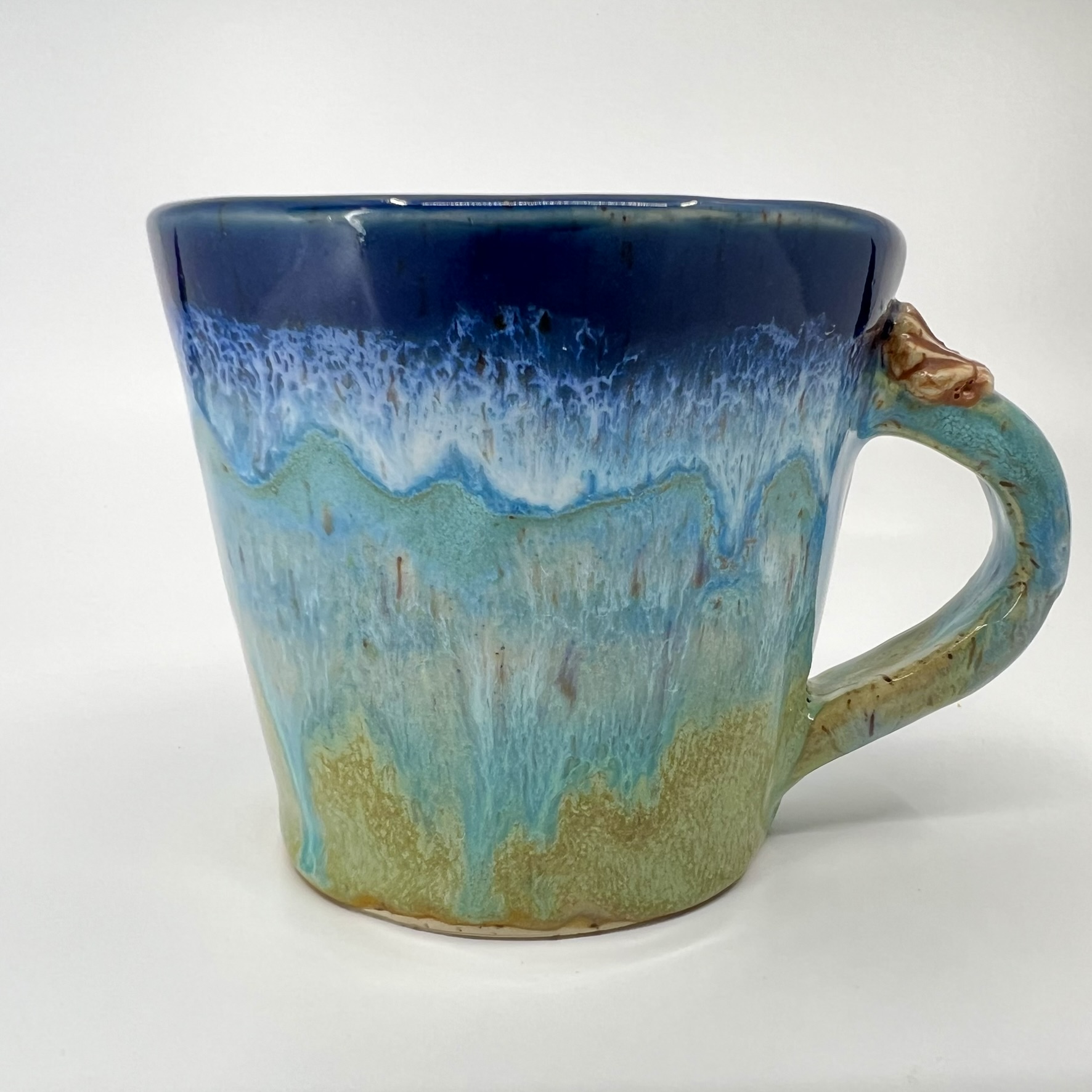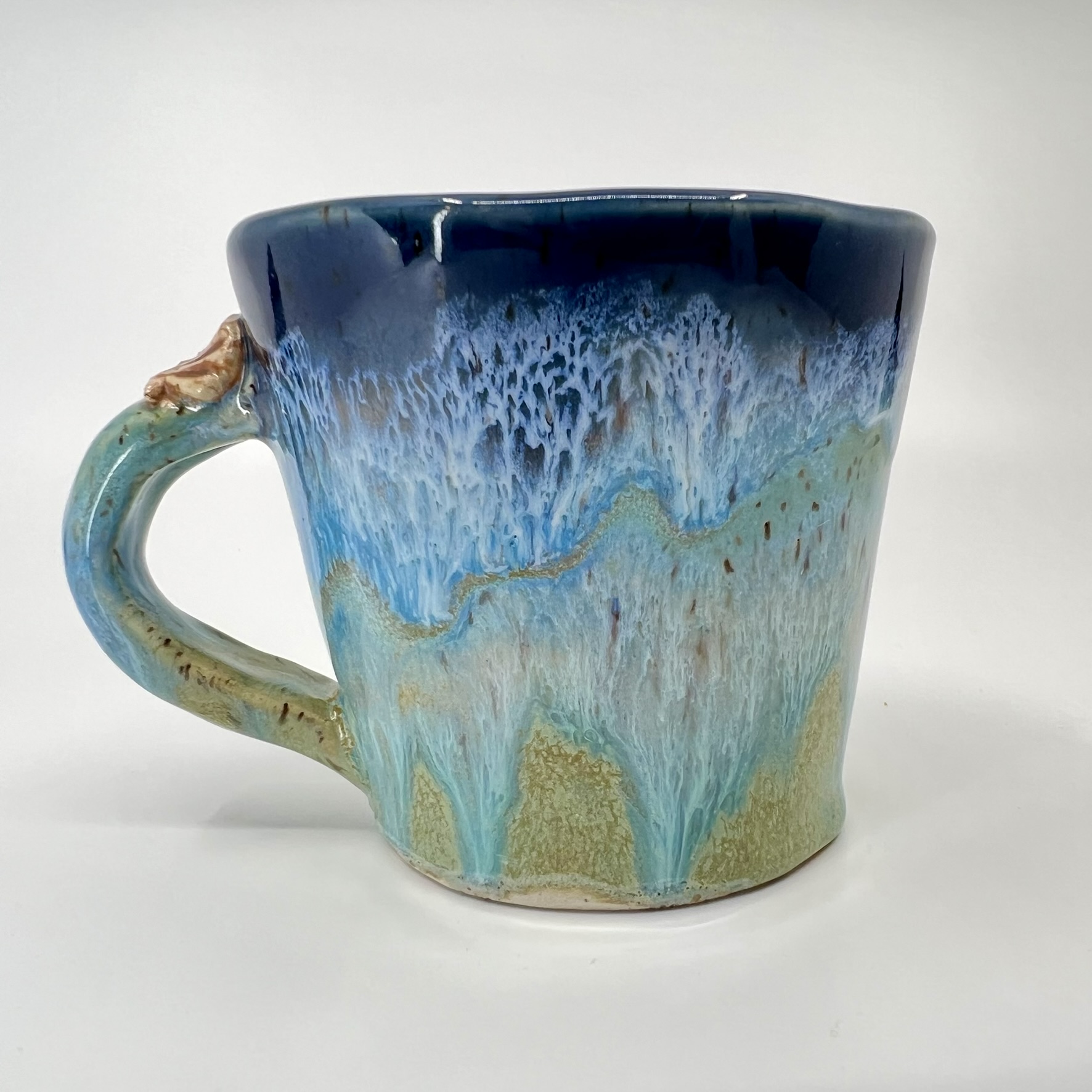 Soft layers of blue, seafoam, and sandy glaze drift together on this hand-built mug, giving it a casual coastal feel. The glossy surface has a wave-like movement to it, almost like watching the tide roll in. The speckles of the clay show through mimicking shells tumbling in the surf. The mug is finished with a small shell sprig that creates a comfortable thumb rest on the two-finger handle. The mug is dishwasher and microwave safe.