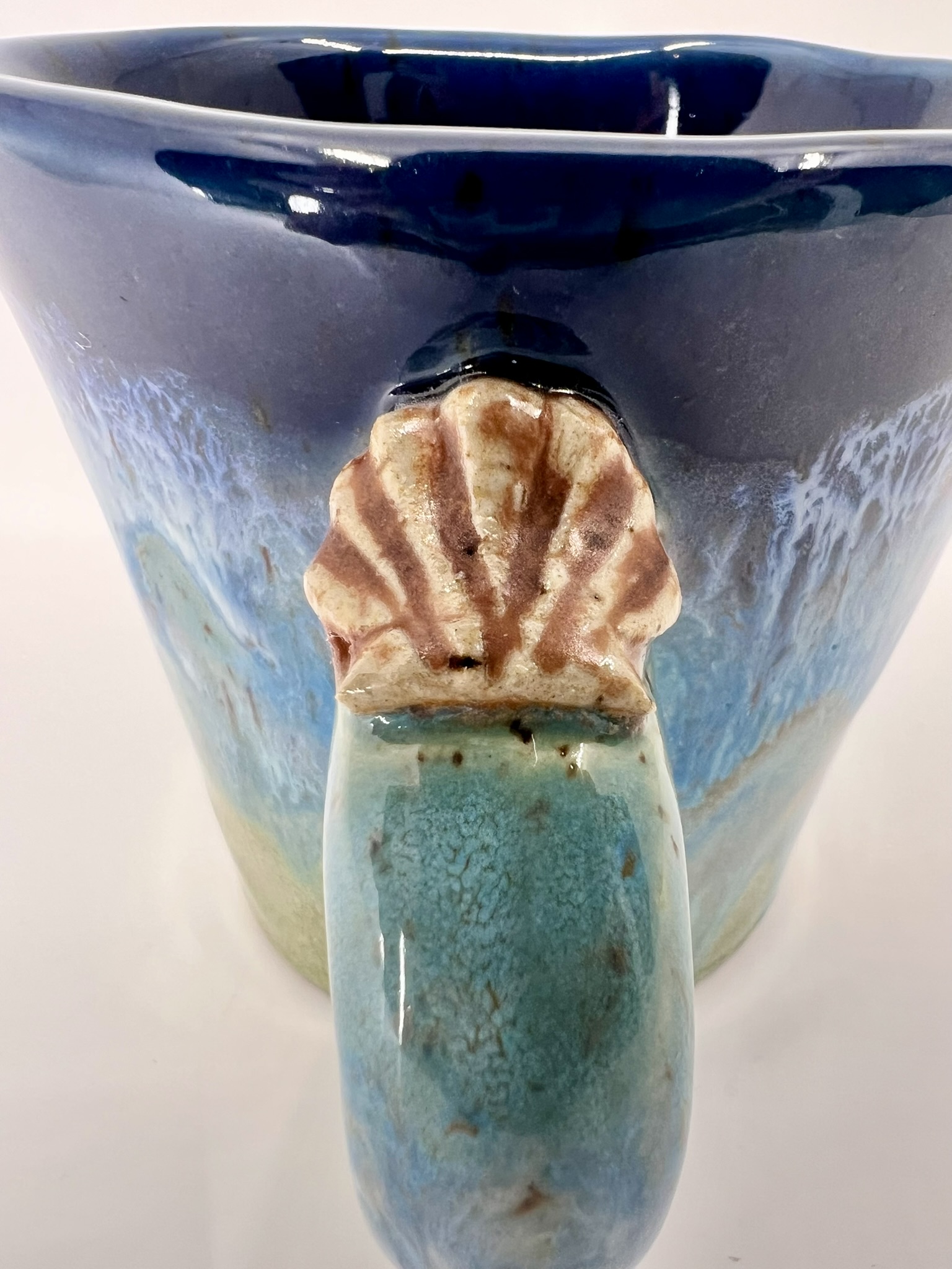 This mug begins as a slab of speckled white clay, hand-built and shaped on a wooden form. The small shell sprig is applied on the handle to serve as a thumb rest. After bisque firing, multiple layers of glaze are brushed and poured on starting with deep blue inside and on the rim with layers of pale blue and sea green to sandy beige to the bottom. During firing, the glazes flow and interact, creating soft transitions that resemble waves meeting the shore.