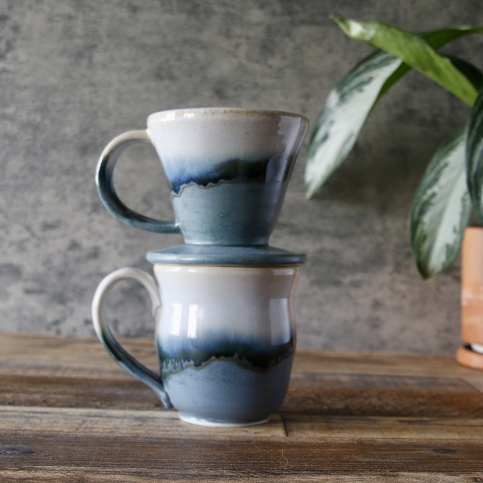 This coffee pour over set is perfect for coffee connoisseurs. It just takes a #2 cone filter, and the appropriate amount of coffee for a 10-12oz cup of coffee. The bottom of the pieces is a beautiful satiny blue-green glaze, with shiny white contrasting glaze on the top. The mug holds 10-12 oz, and has a comfy 2-3 finger handle.