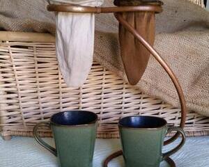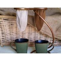 This set comes with our original handmade drip stand in either a curved or twisted style and one (1) handmade cotton coffee sock filter. Coffee mugs are not included.