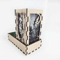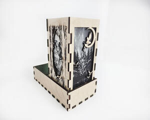 Jump into a grand adventure from the safety of your desk with our fantasy adventure lightbox. The box takes you on an adventure from a dragon infested mountain, to a ruined city, through a fantasy forest with dragons soaring above and finally to a gothic castle on a full moon. Each side is different and wholly unique with a foreground image comprised of wood and the background comprised of heavy duty velum paper to allow the light to shine through. The boxes light up, change color and can even have color changing patterns set. Each box comes with its own led, remote and base.