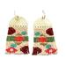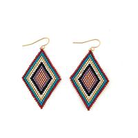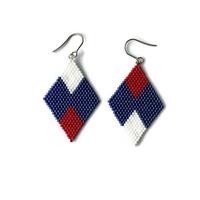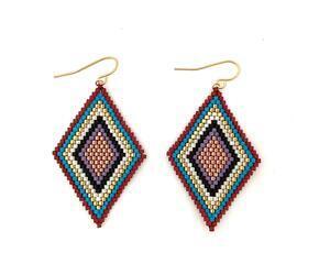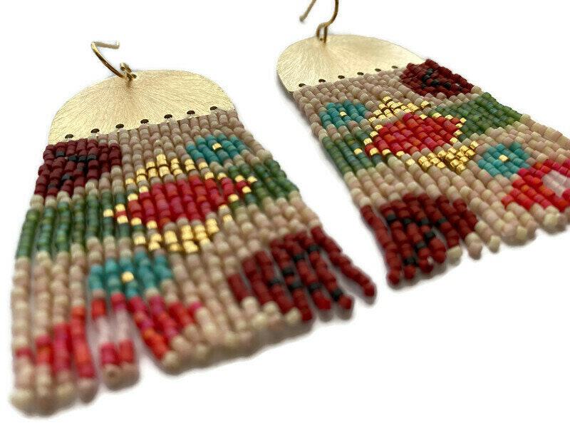 Handmade earrings with Miyuki Delica 11/0 seed beads in a fun pattern designed by Tasha Jane Designs. Approximately 2.65 inches long and 1.25 inches wide. Gold plated ear wire. Fringe is beaded on a gold finish semi-circle earring finding. Great way to add a pop of color and pattern to any outfit!