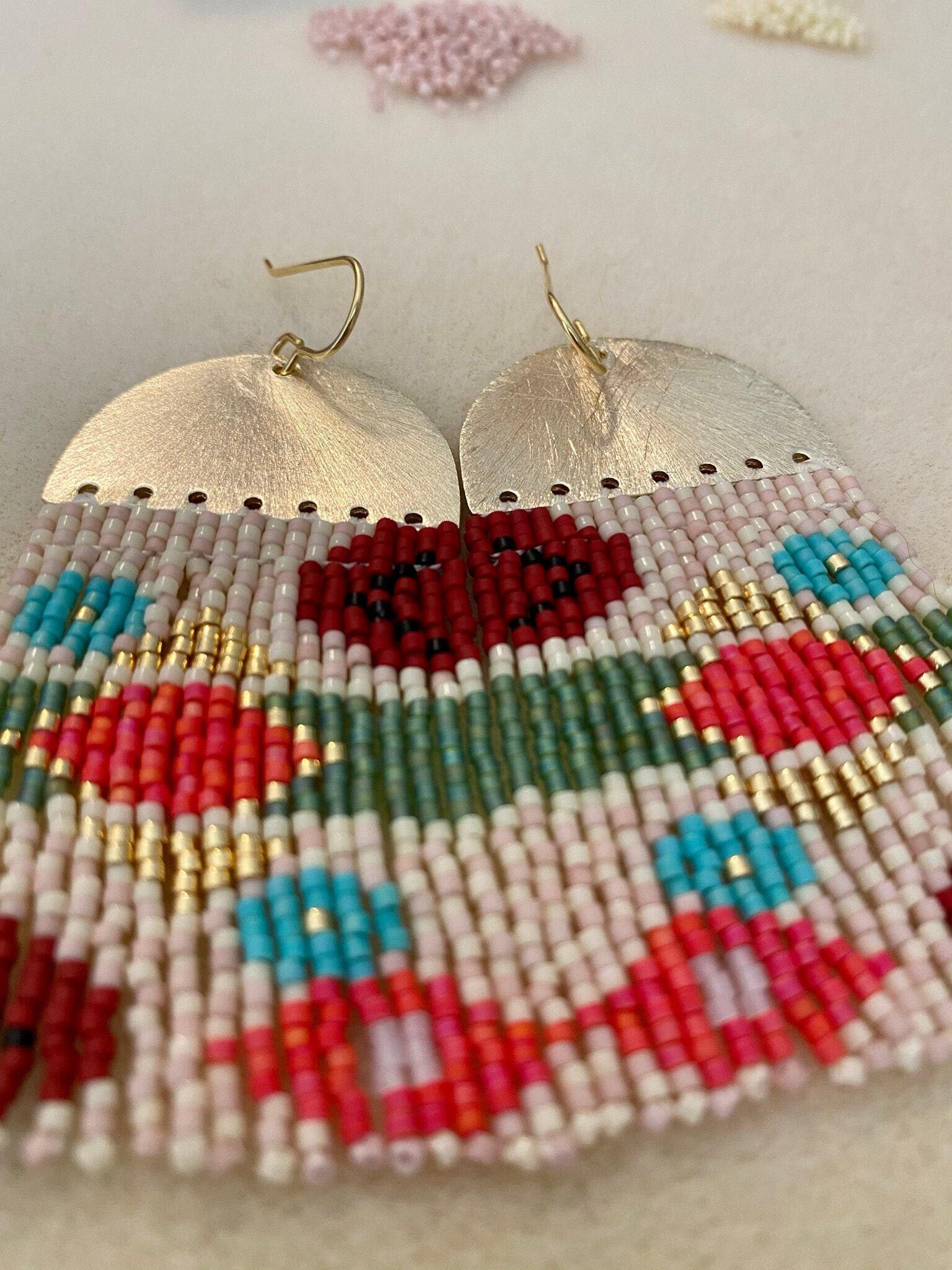 Care Instructions: Seed beads can be delicate and should be treated with care. If your earrings arrive and the fringe needs to be adjusted, it is best to lay them on a soft surface and gently grasp the top of the earring and then use a rolling up and down motion to straighten them out. It is recommended to store your jewelry in an enclosed container.