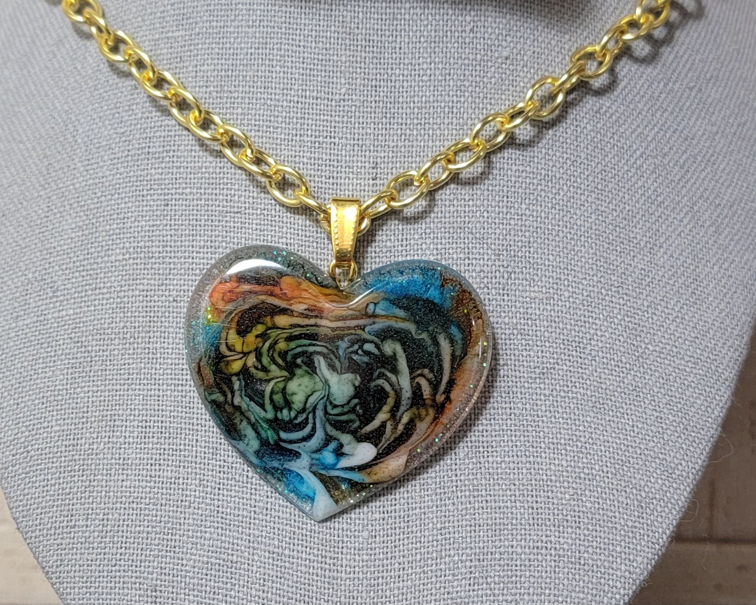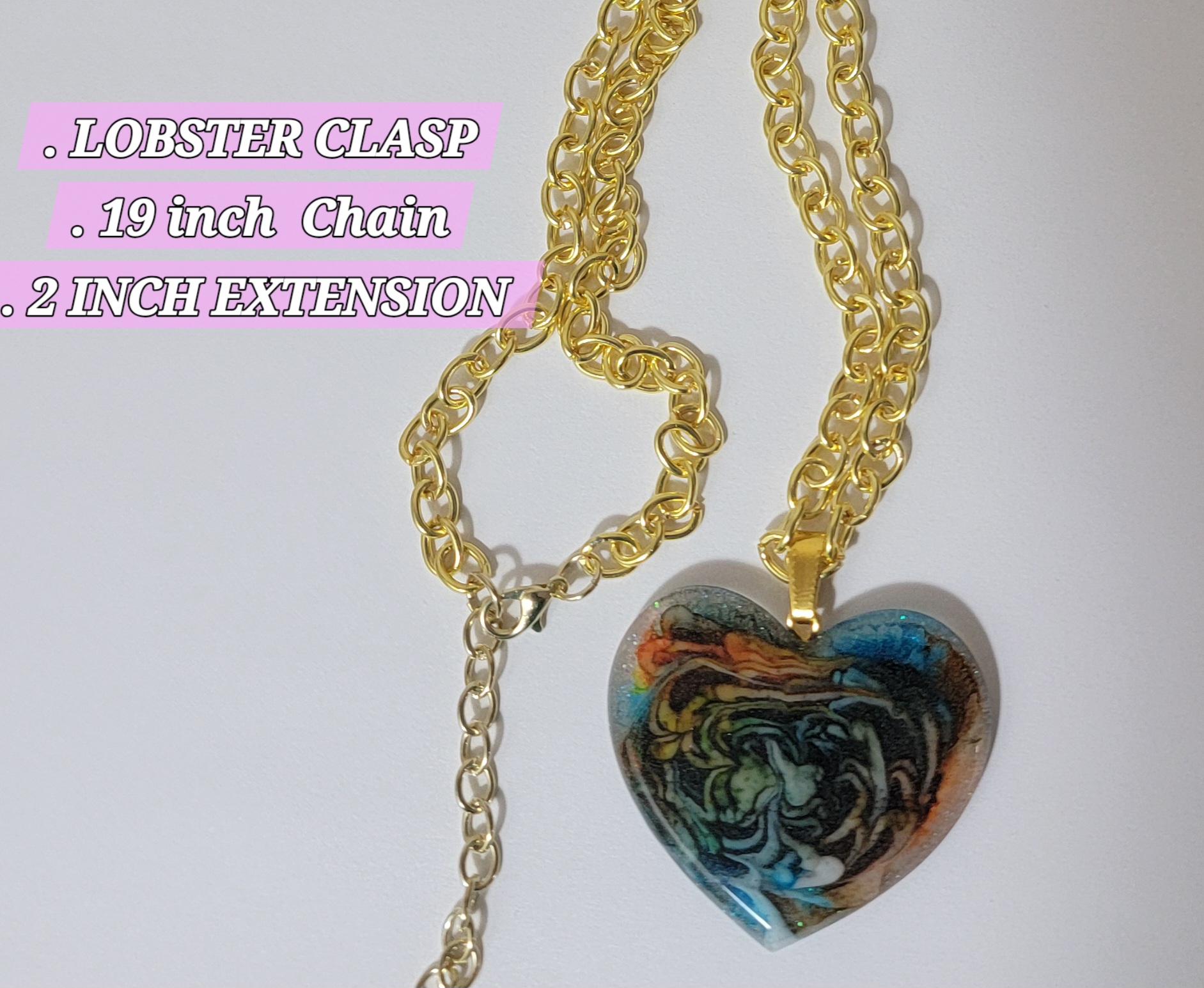 Multi-colored Heart Necklace with 19 inches/ 48 cm chain. There is a 2 inch/ 5 cm extender. the pendant is made with epoxy resin and alcohol ink.