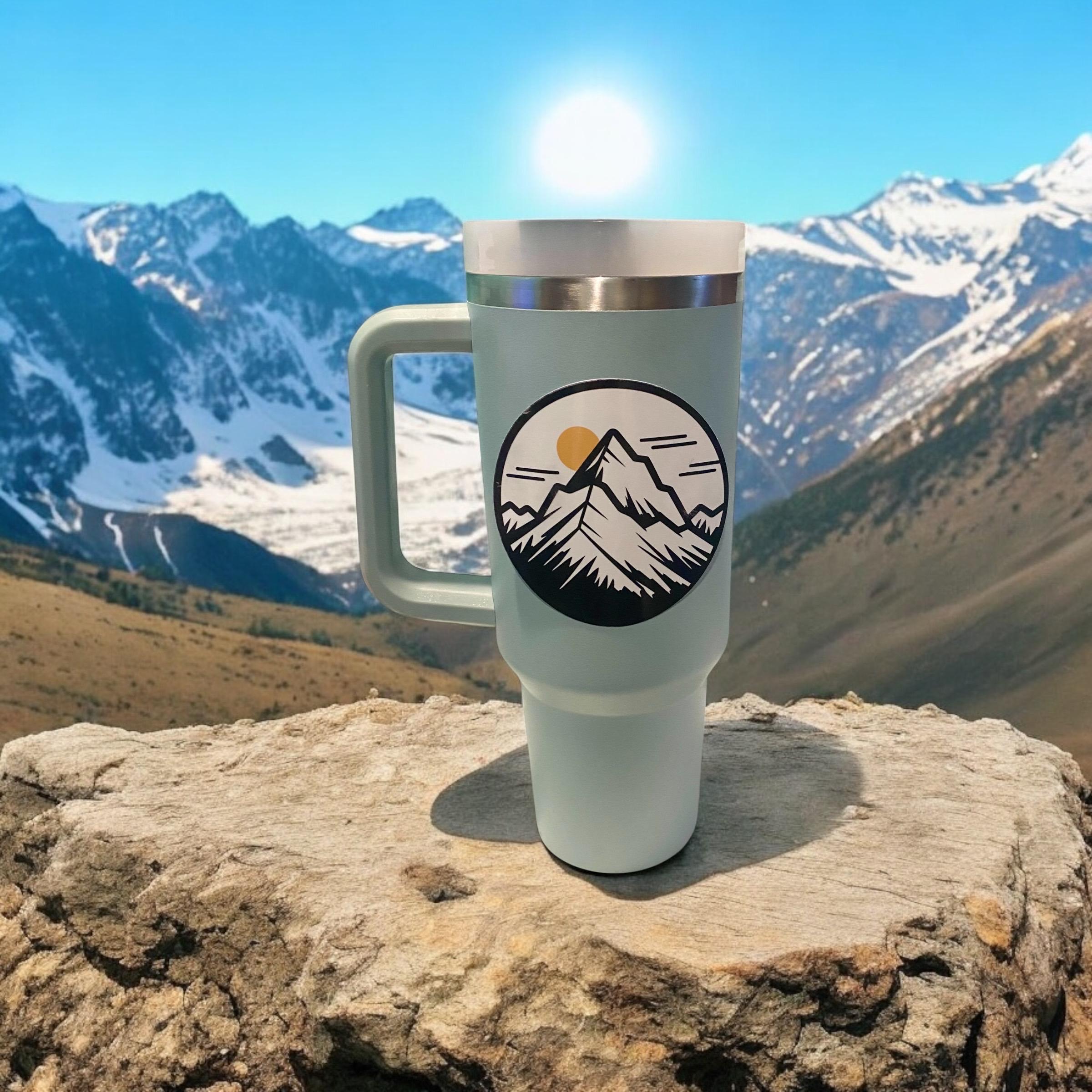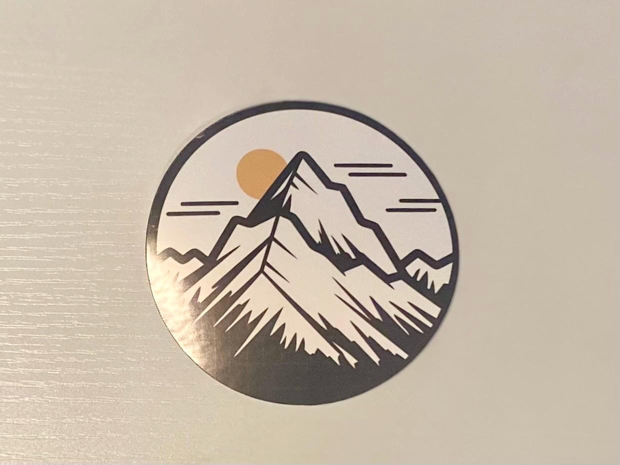 Scenery depicting colorful Montana mountain peaks and beautiful endless sky decal perfect for drink cup, laptop, phone, mountain bike or vehicle. Waterproof vinyl, 5 inch diameter.