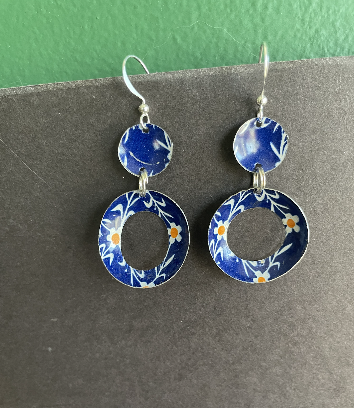 Tins are very light making them ideal for earrings as they don't weigh down your ears as the day goes on. Did you know the proper term for working with tin is "tinkering"? That made me really happy. I literally tinker in my art studio! I use old cookie tins, tea tins, and the like, break them down, and hand cut them into shapes and hand-hammer them into the 3-D shape I want them to be, finish and polish them, before putting them together like any other jewelry.