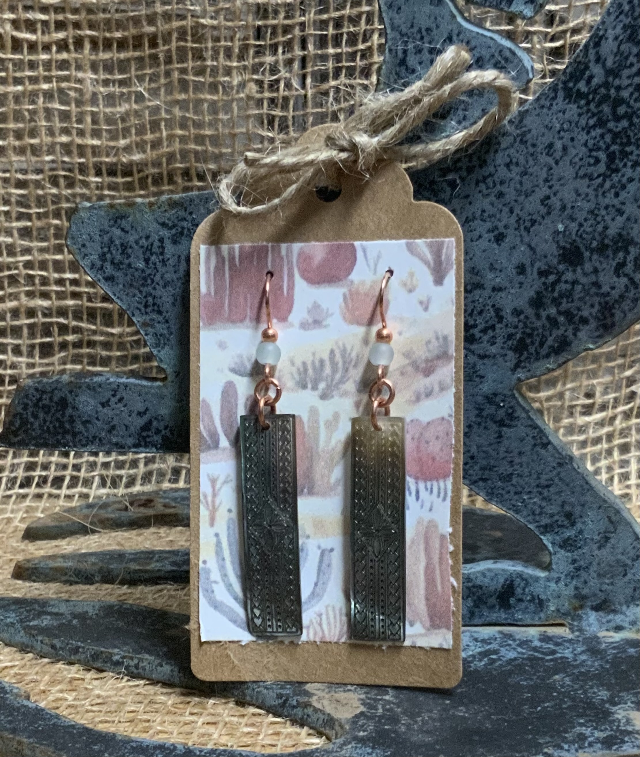 These earrings have handmade copper jump rings and ear wires with 4mm moonstone opal Beach-Style glass beads. The mother of pearl rectangle has a Polynesian tribal design etched on the surface of the shell. Giving these earrings a Hawaiian Vibe. Each pair of comes displayed on a handmade card.