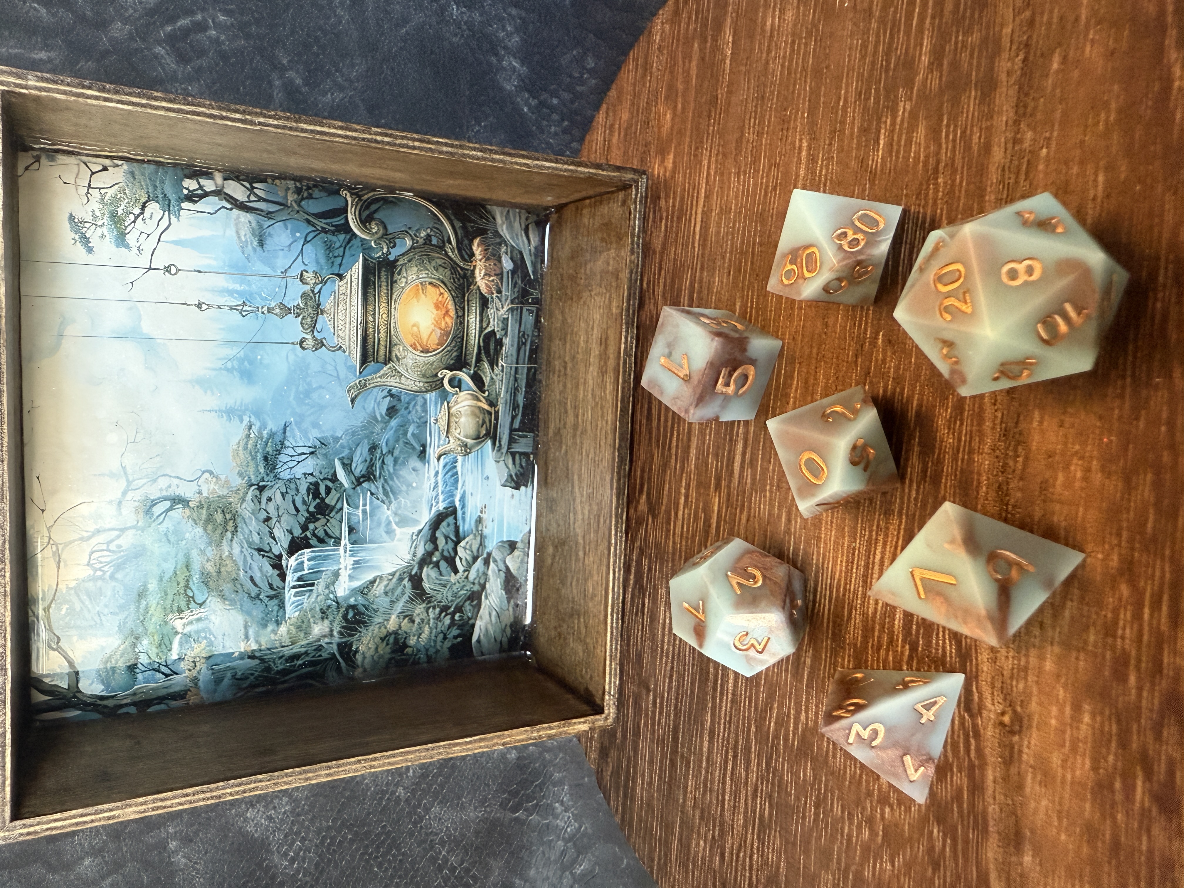 Elevate your gaming experience with this exquisite set of sharp edge dice, featuring mesmerizing swirls copper and blue. Each die is meticulously inked with copper numbers, adding a touch of elegance and readability to your rolls.The matching dice tray is a hand stained wood box and hand poured resin over the image in the bottom.