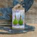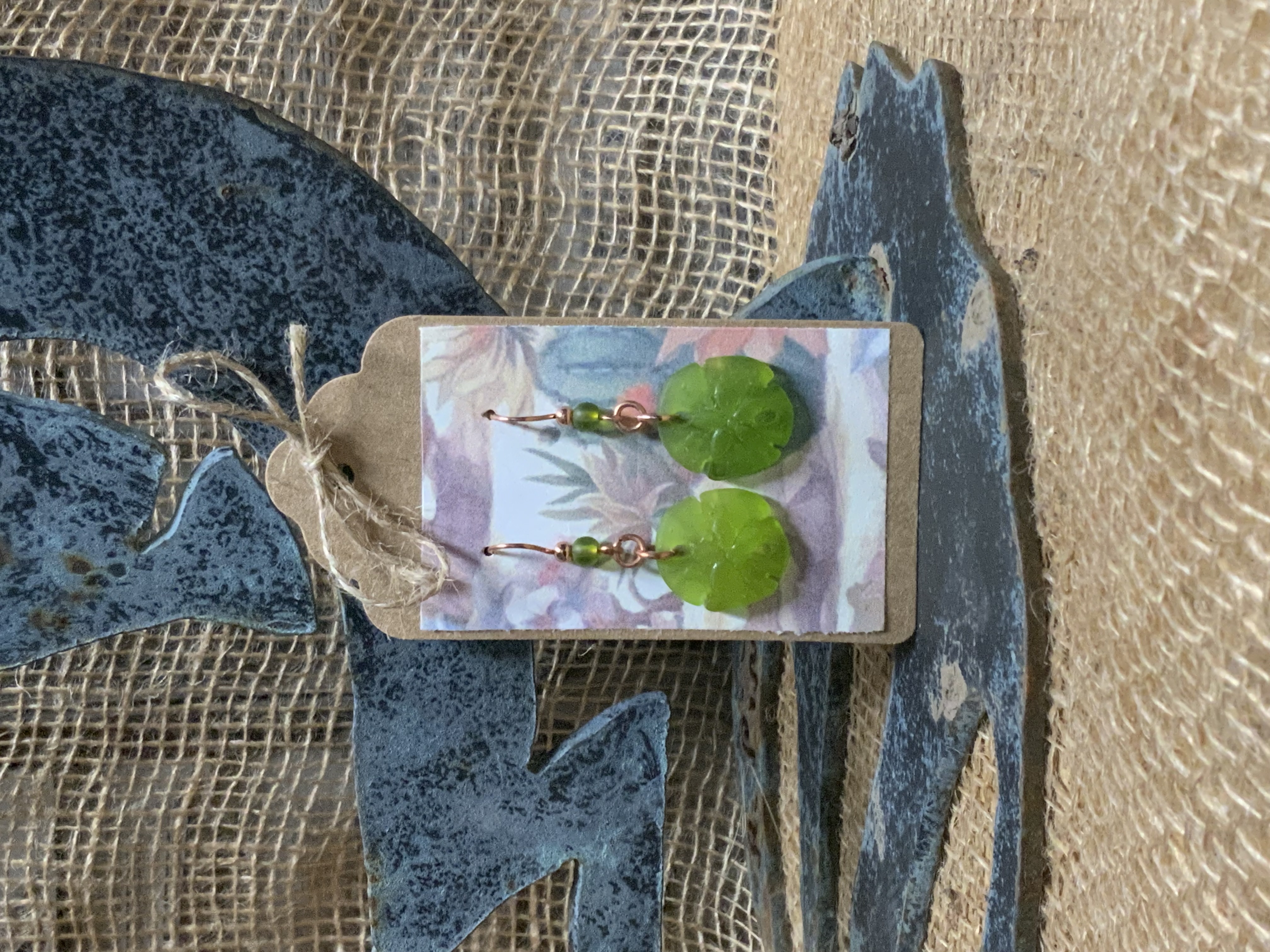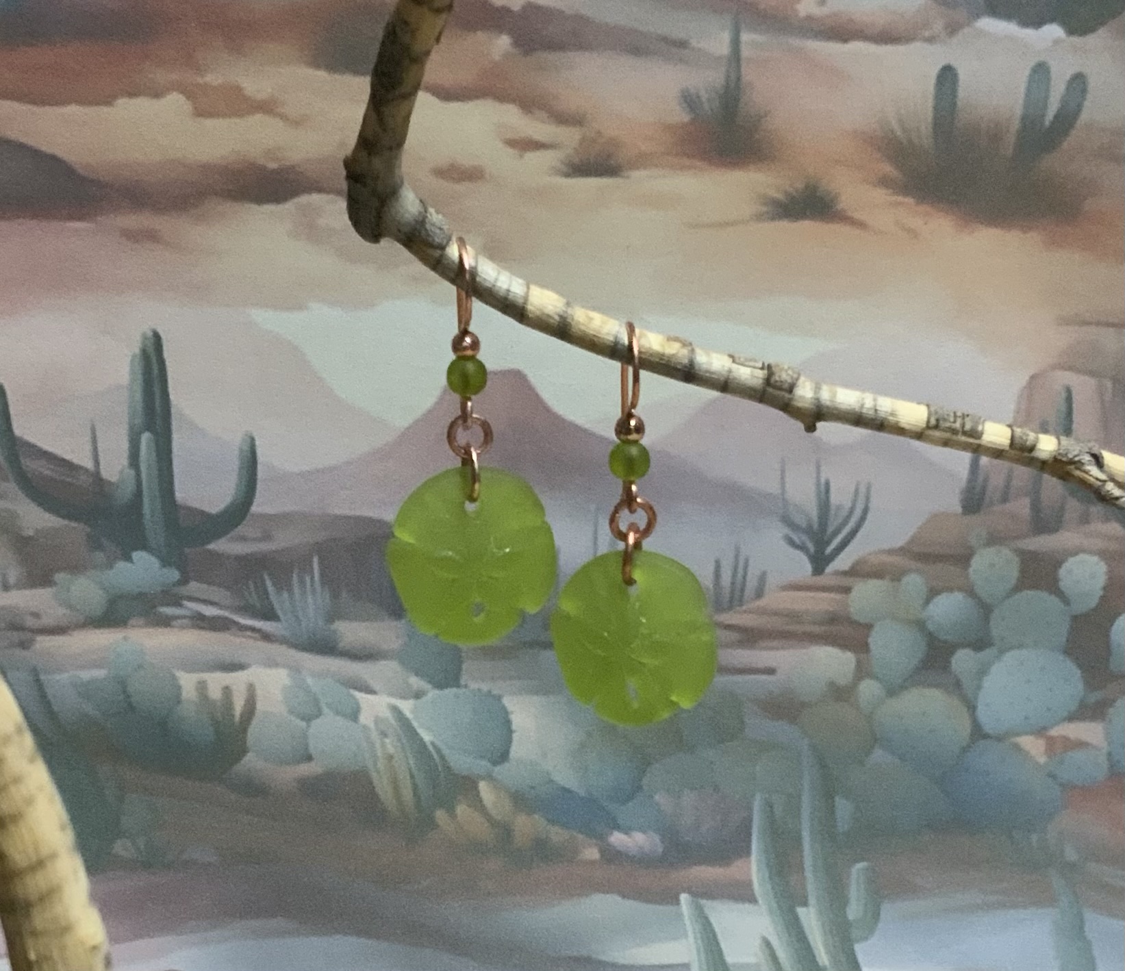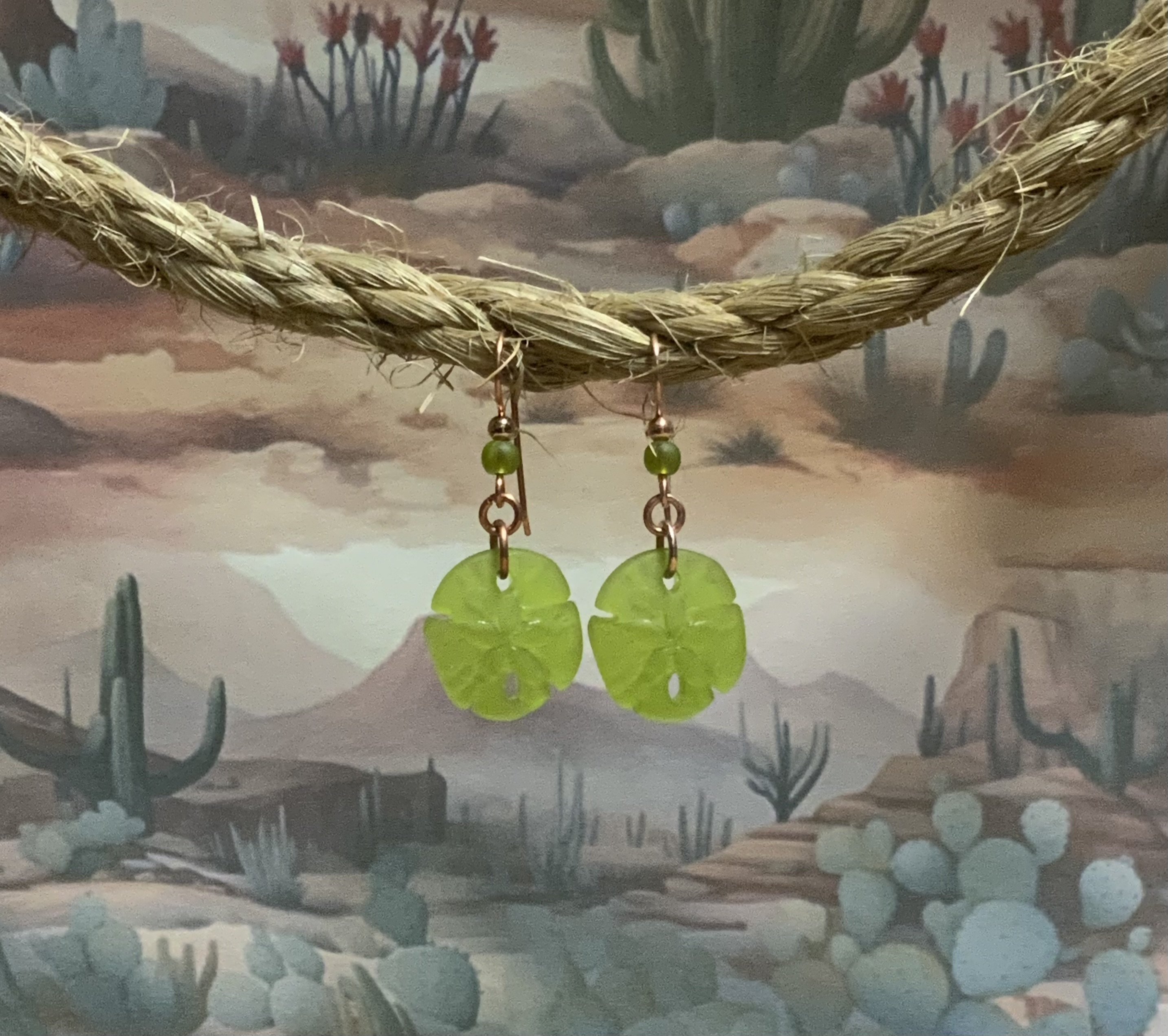 These earrings have handmade copper jump rings and ear wires with 4mm olive Beach-Style glass beads. The drop is also made with olive Beach-Style glass that has been pressed into the shape of a sand dollar. Each pair of earrings comes displayed on a handmade card.