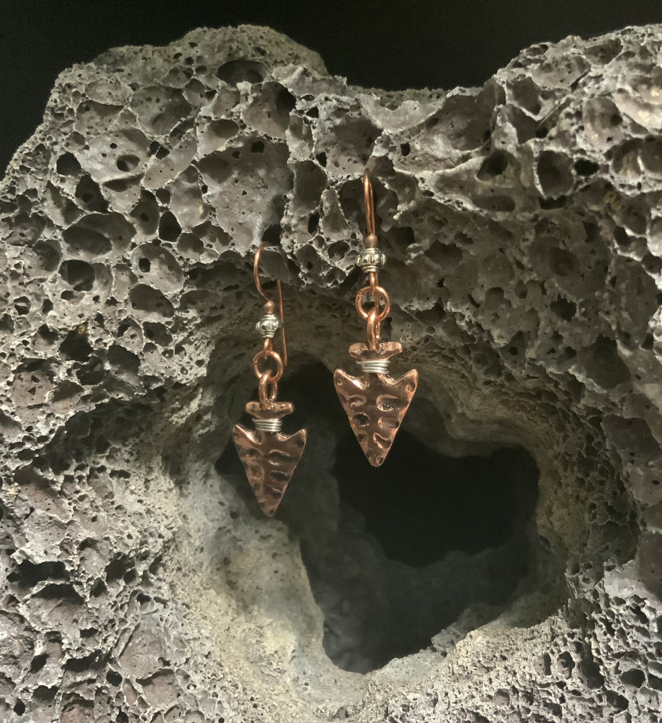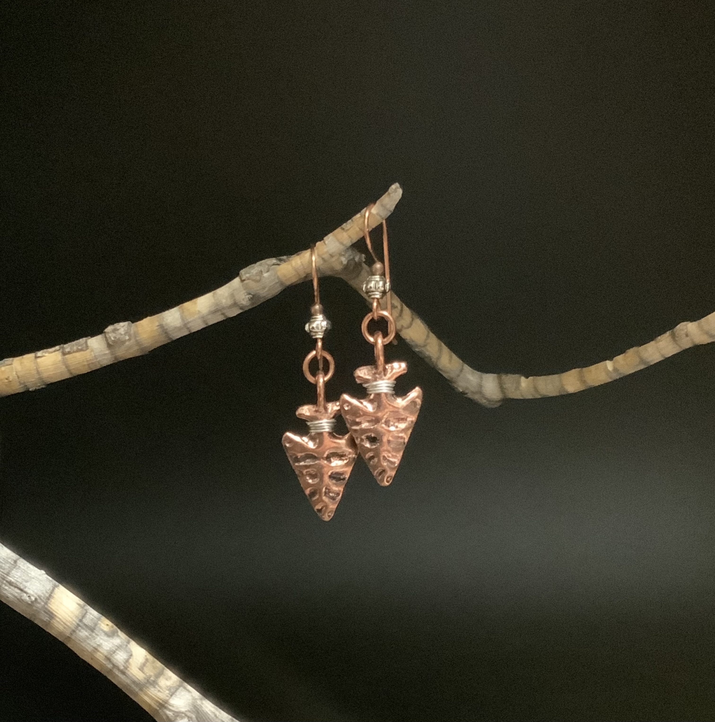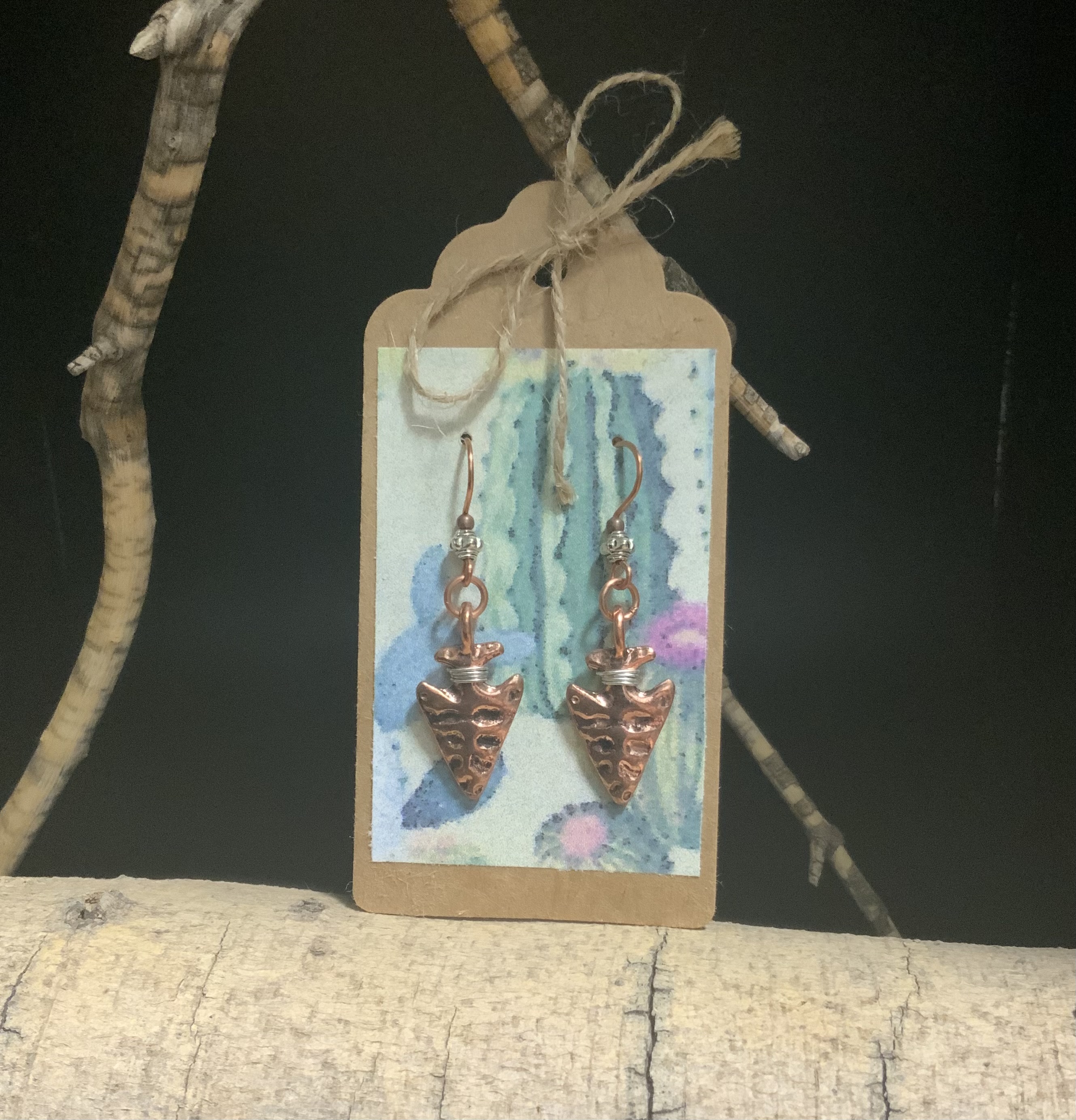 These arrowhead earrings have handmade copper ear wires with a silver color 4mm bead.The arrowhead dangle is copper plated with a silver color wrap at the top, making the arrowhead stand out. Each pair of earrings comes displayed on a handmade card.