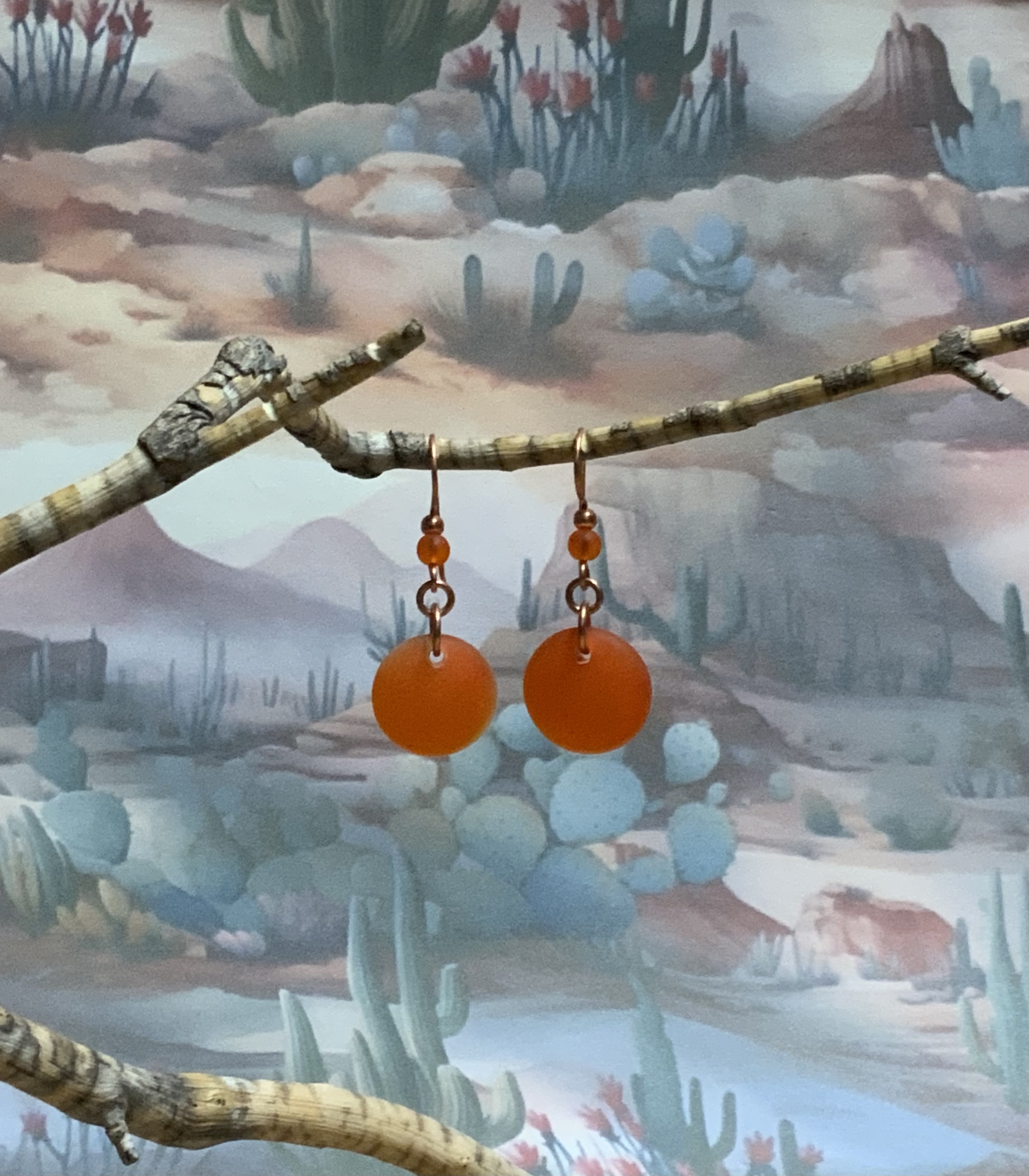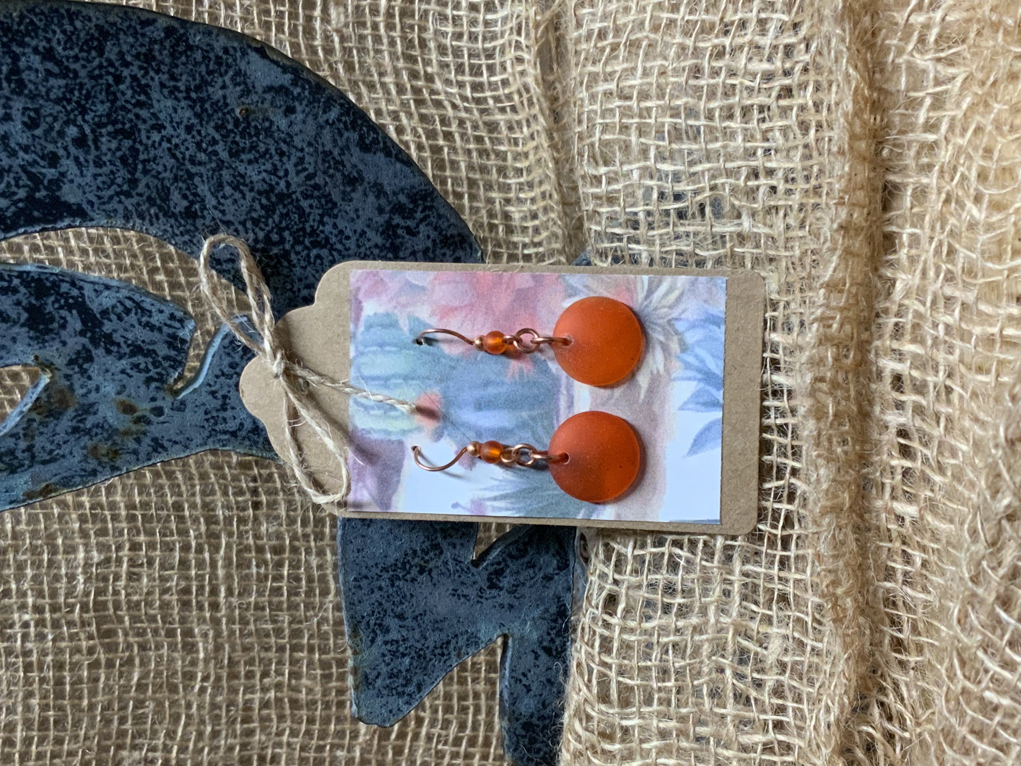 These earrings have handmade copper jump rings and ear wires with 4mm tangerine Beach-Style glass beads.The tangerine concave coin dangles are a tumbled glass. It mimics the weathered appearance of authentic sea glass. Capturing the essence of costal beauty. Each pair of earrings comes displayed on a handmade card.