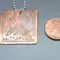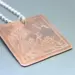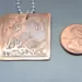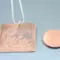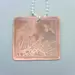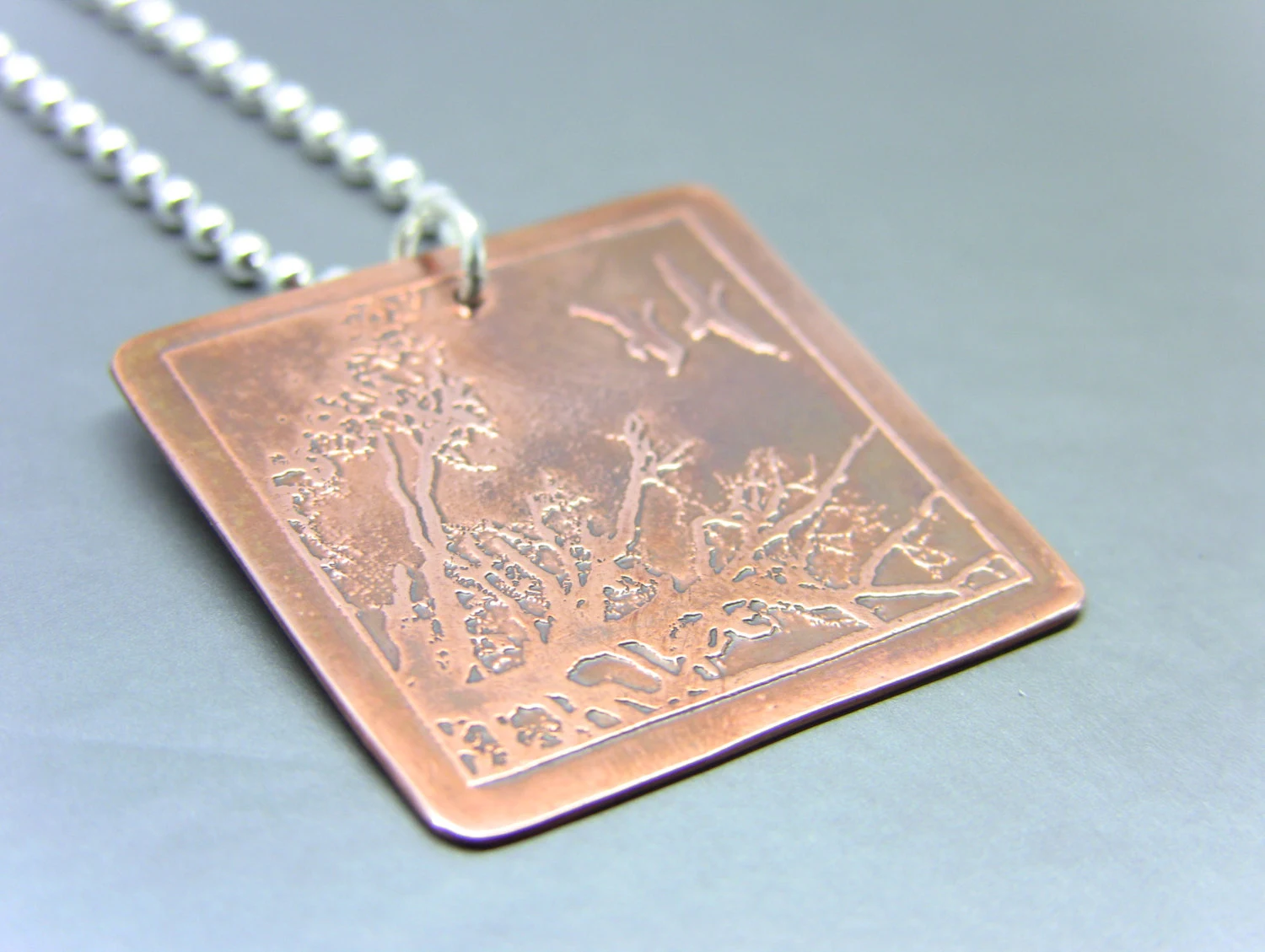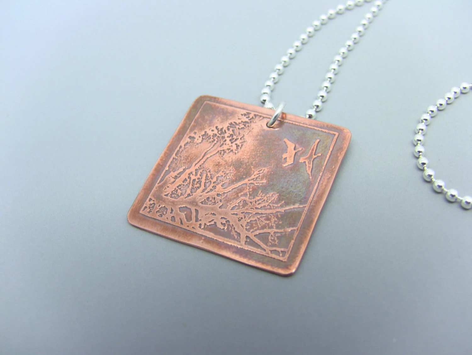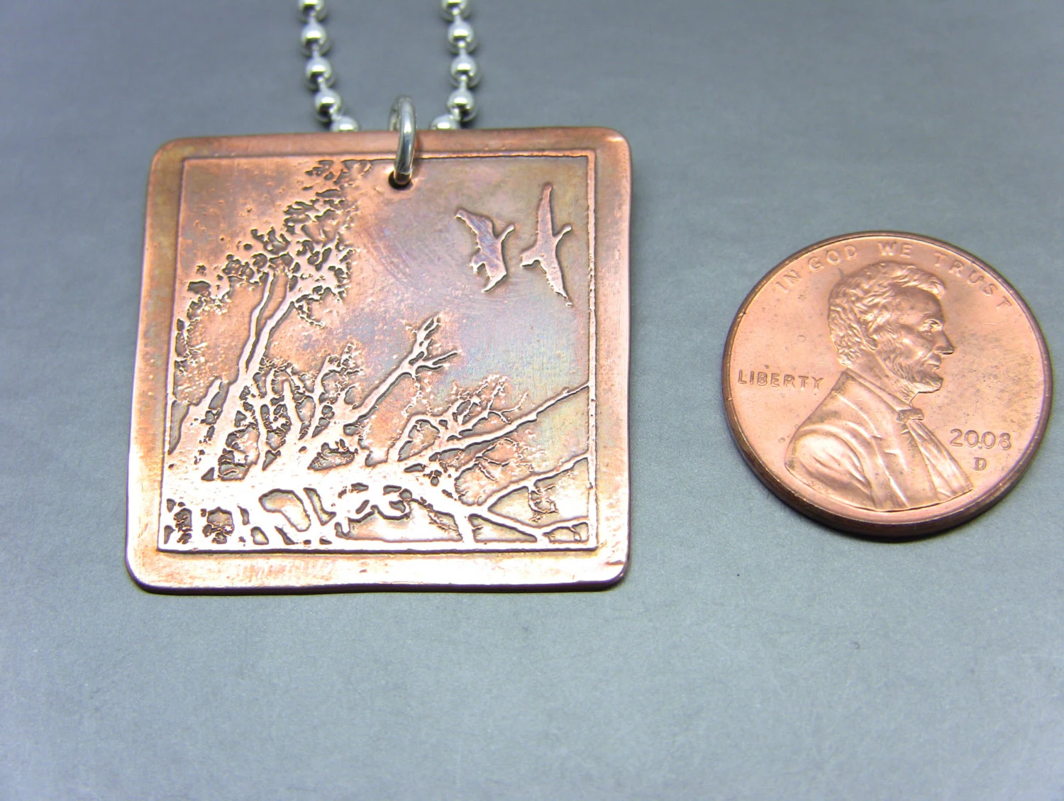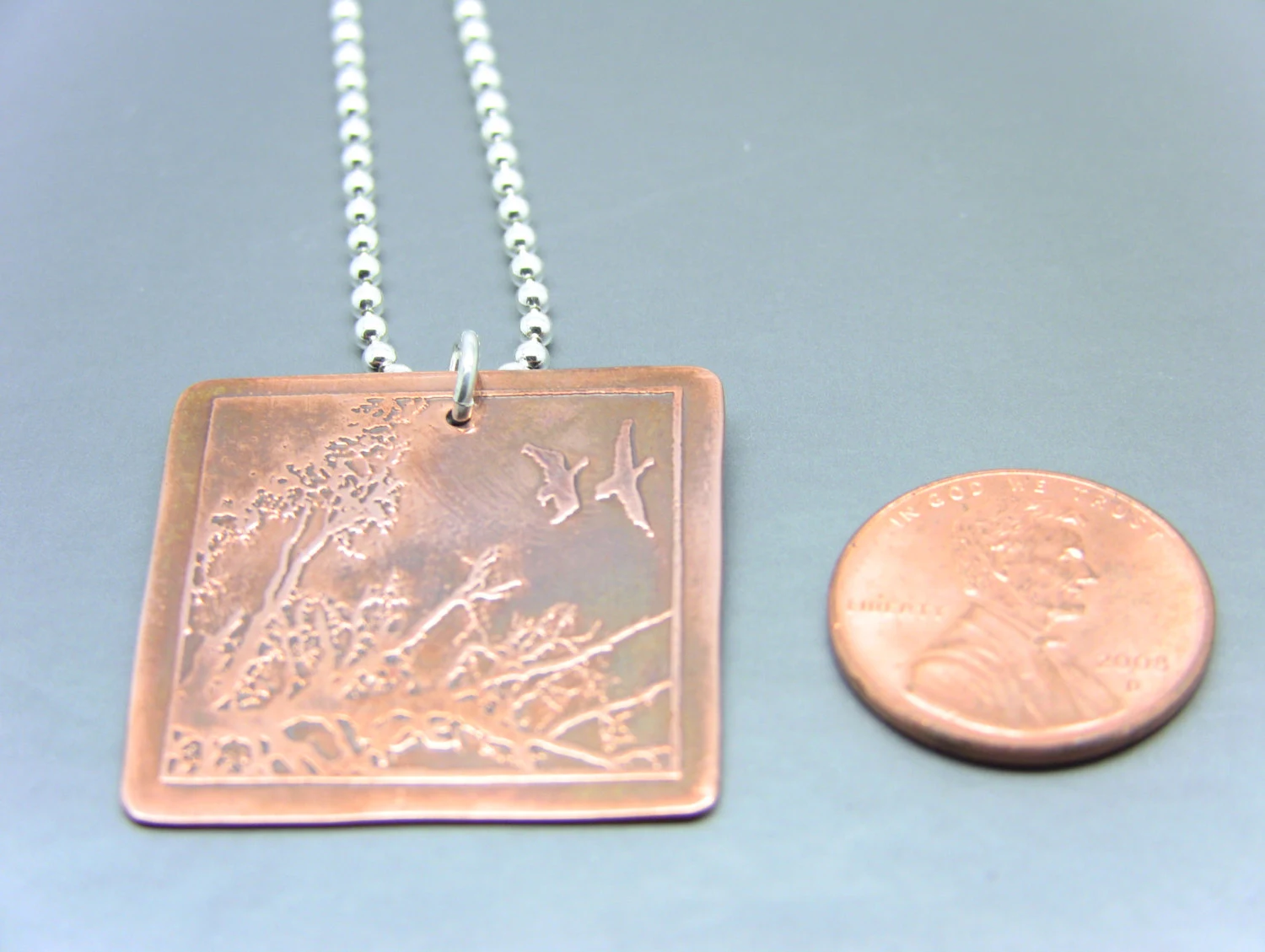 This simple, but fun necklace features a copper pendant with birds flying near a tree. I hand-cut this piece and then etched it using a chemical etching process. The piece was treated with a light patina and polished. The pendant hangs from a 18" sterling silver bead chain with spring ring clasp. The square pendant is approx 1-1/8" square.