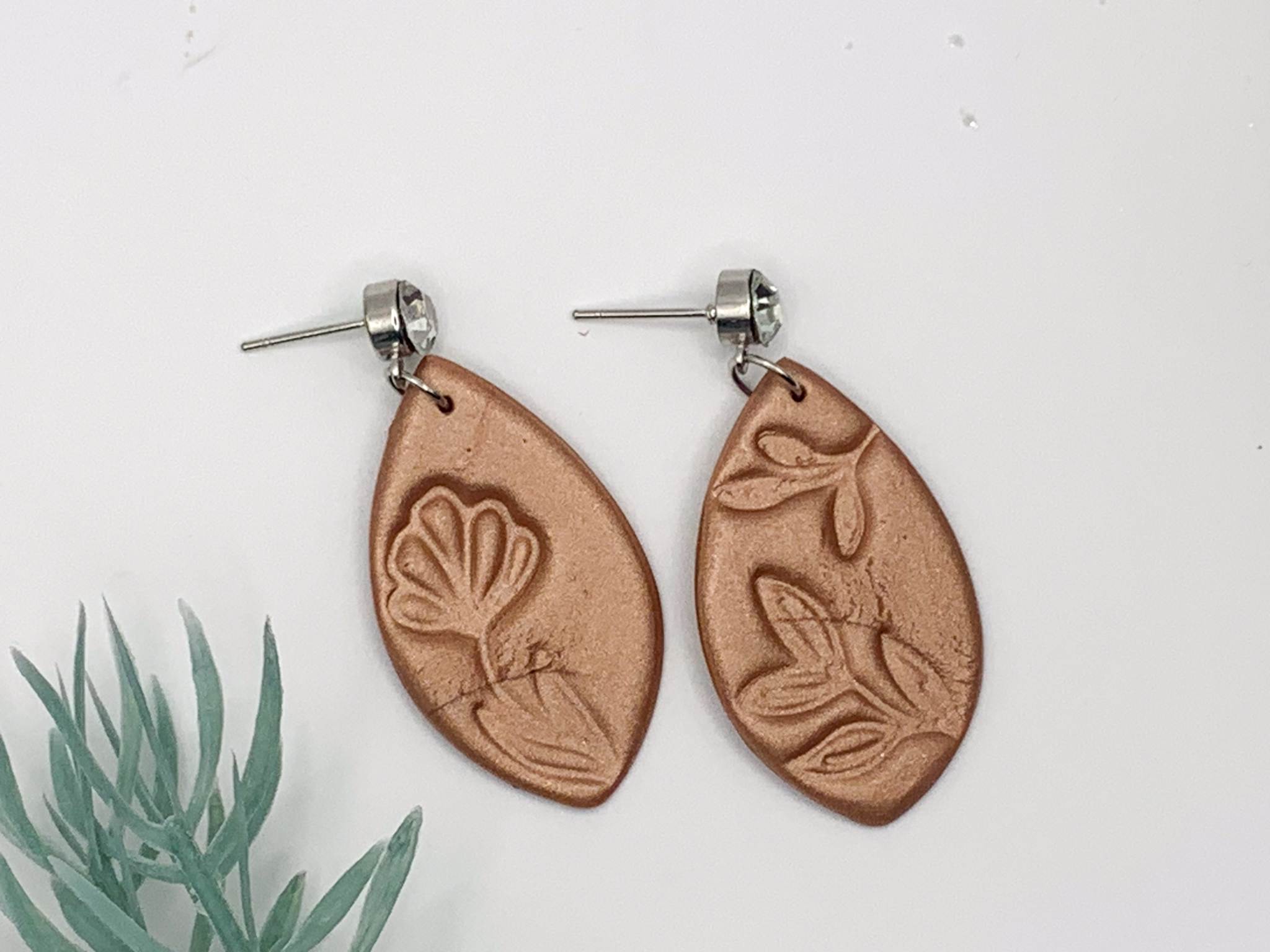 Delicate and earthy! These teardrop-shaped copper earrings feature embossed floral details for a soft, nature-inspired finish.