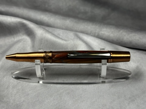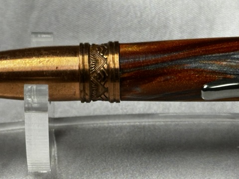 A smooth-writing premium copper pen made from a stunning epoxy hybrid blank featuring flowing metallic gold, bronze, and slate-gray swirls. The body has incredible depth and movement as the colors shift under light, giving this piece a molten, shimmering look.