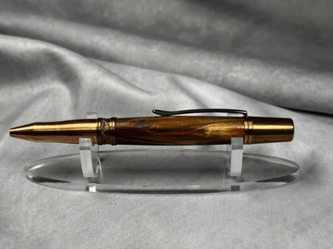 The hardware is solid copper with a brushed aged finish that pairs perfectly with the warm metallic tones in the blank.