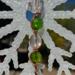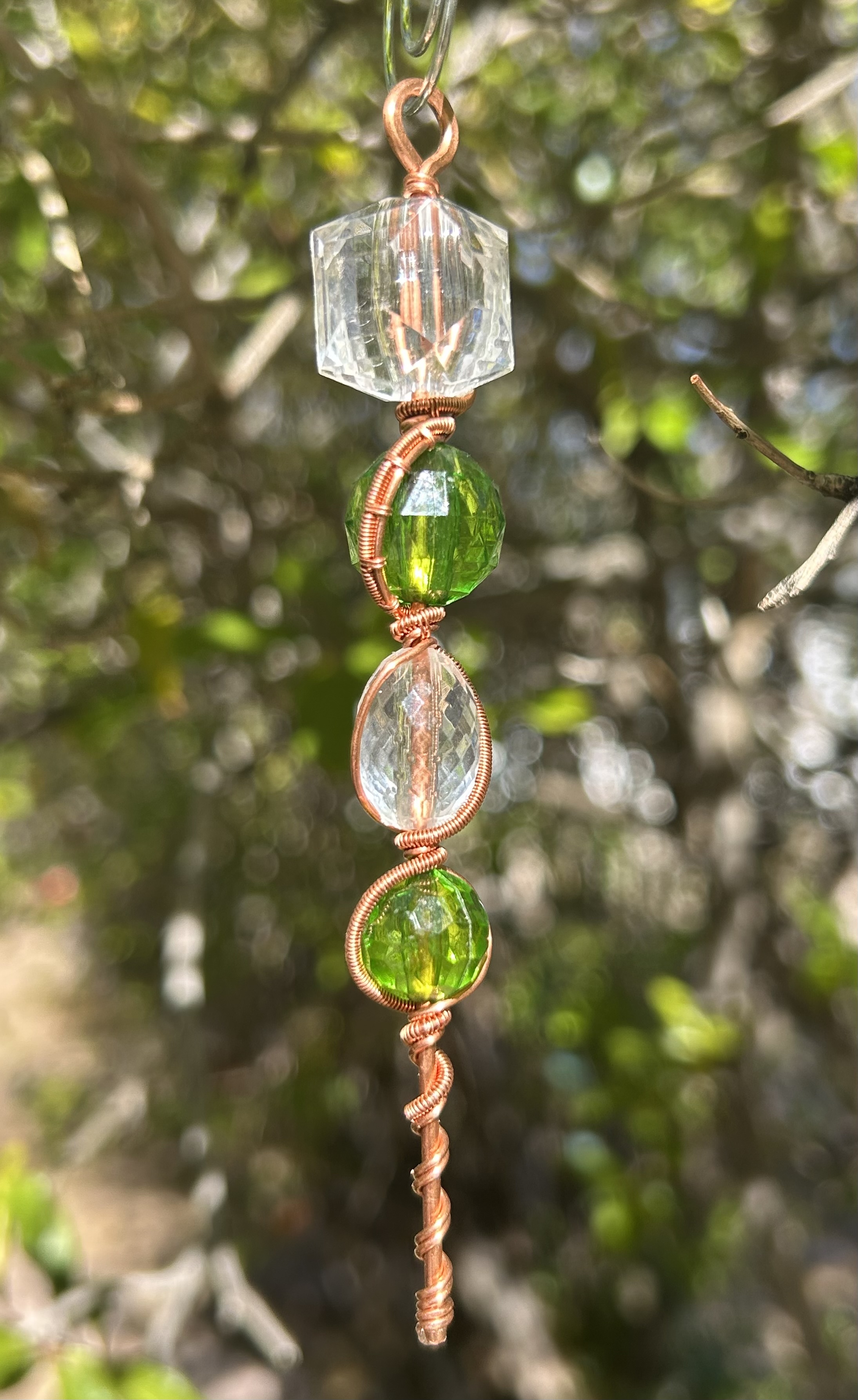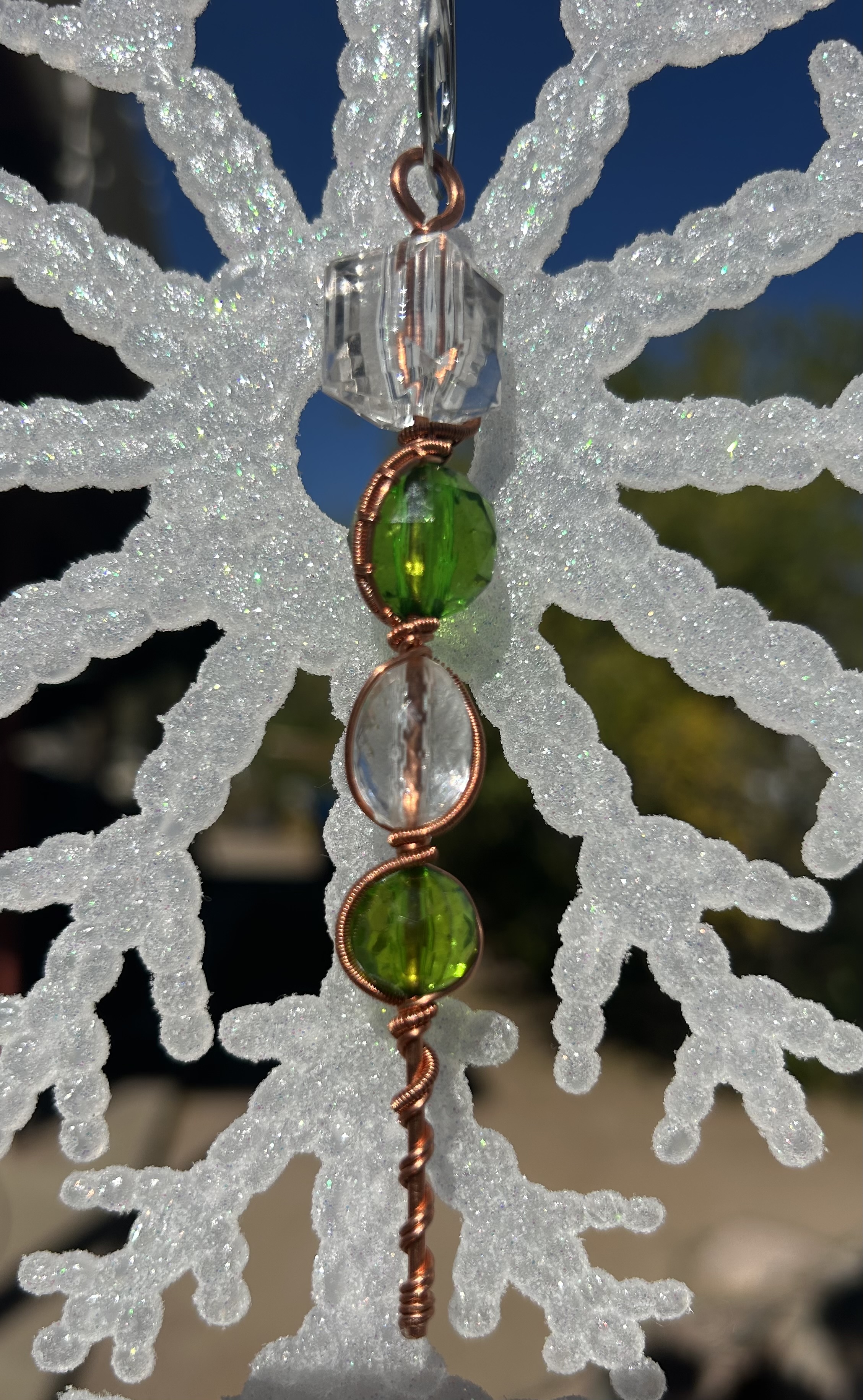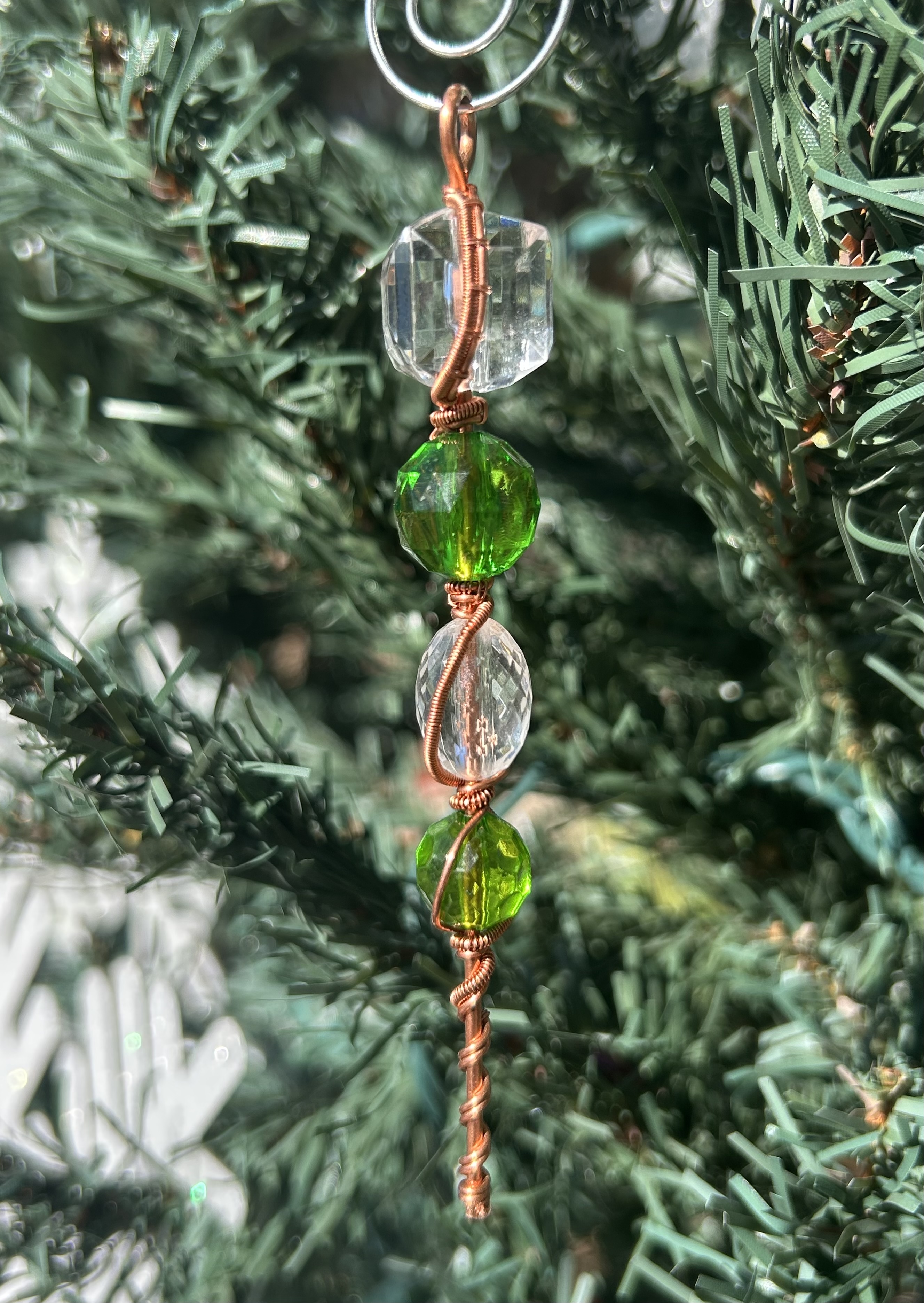 This handmade icicle ornament is wire wrapped with bare copper wire. The clear and green beads enclosed in the wrap are acrylic. Wire hanger is included. Each ornament comes displayed on a handmade card.