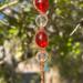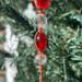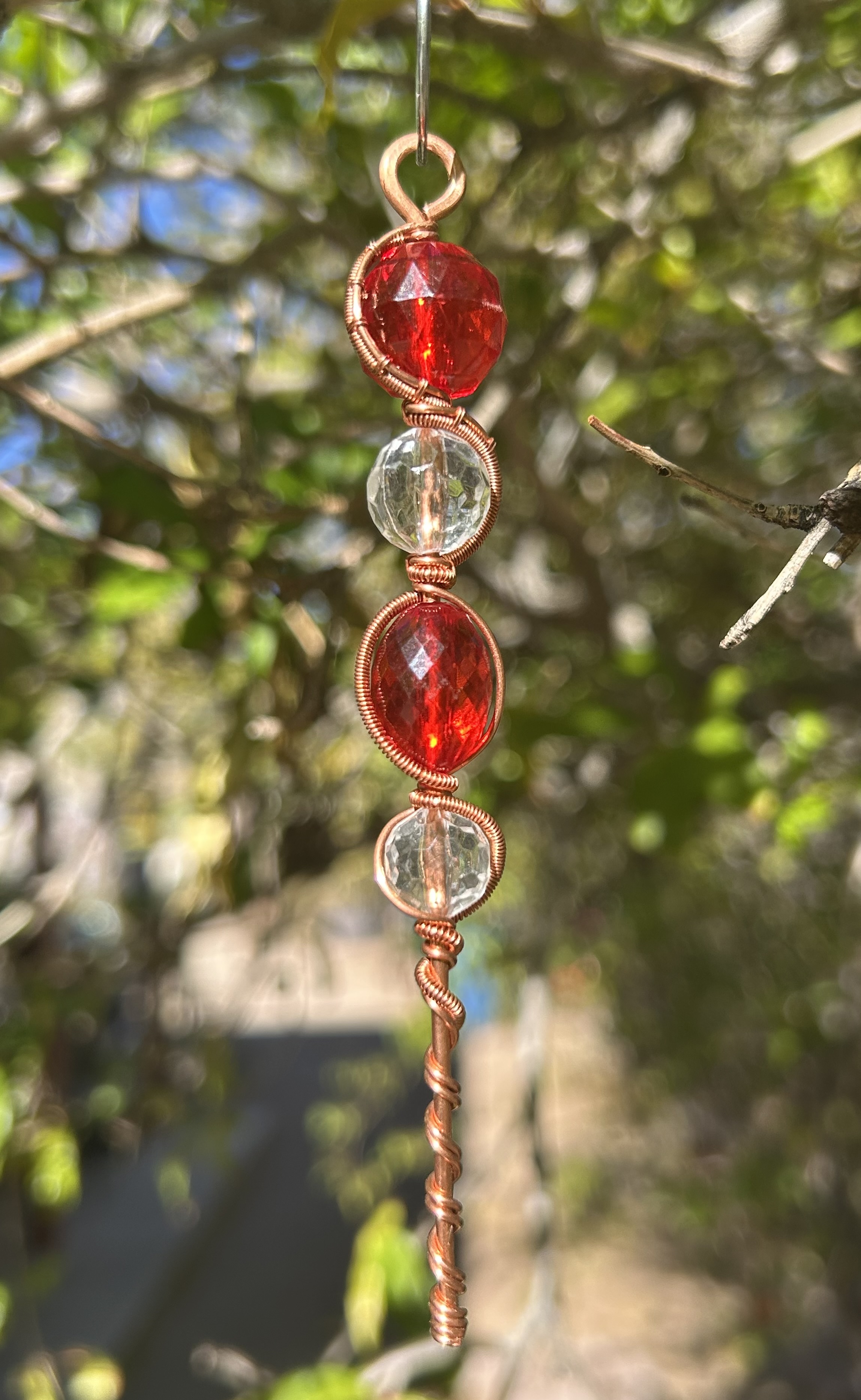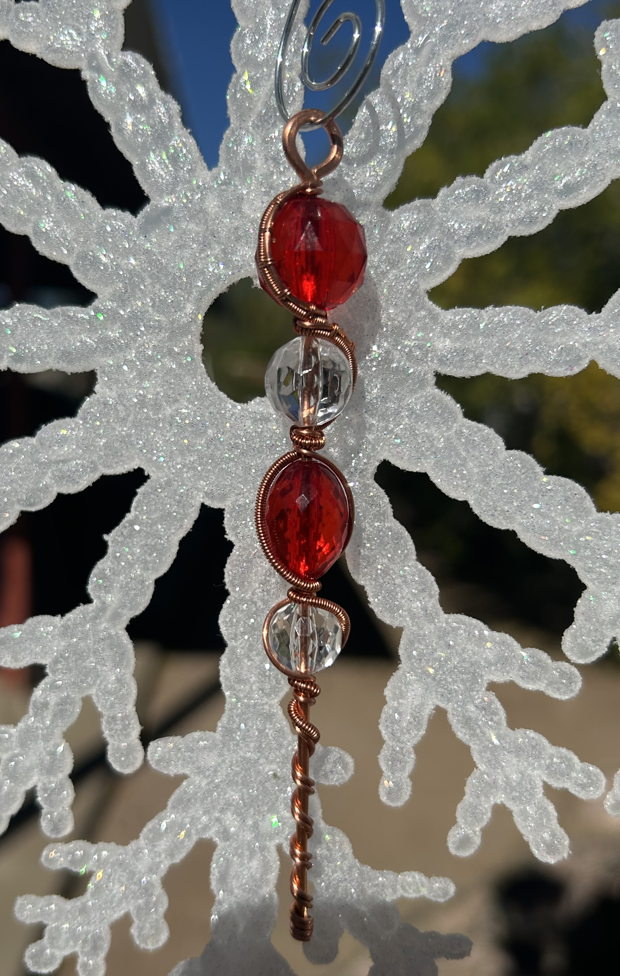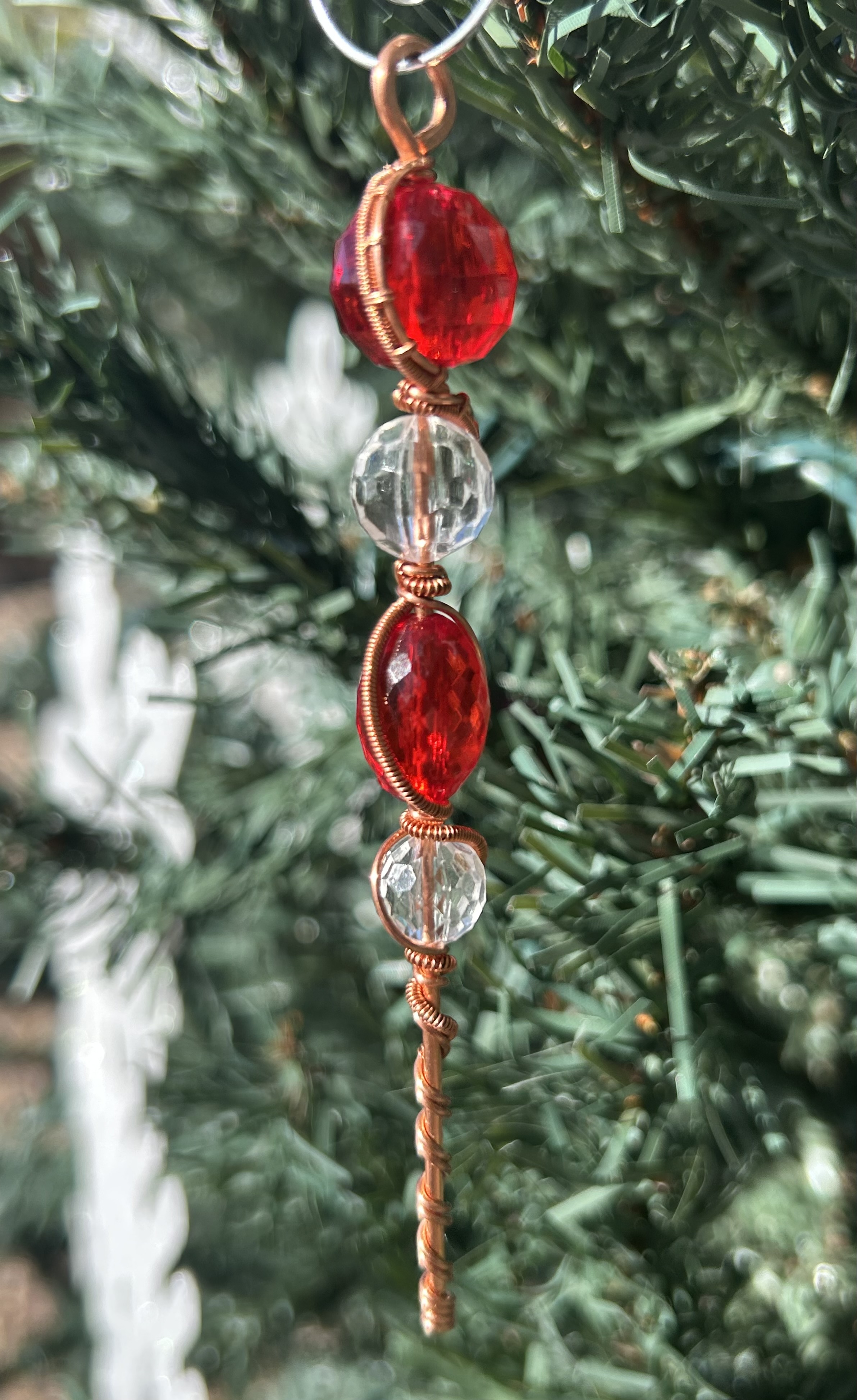 This handmade icicle ornament is wired wrapped with bare copper wire. The clear and red beads enclosed in the wrap are acrylic. Wire hanger is included. Each ornament comes displayed on a handmade card.
