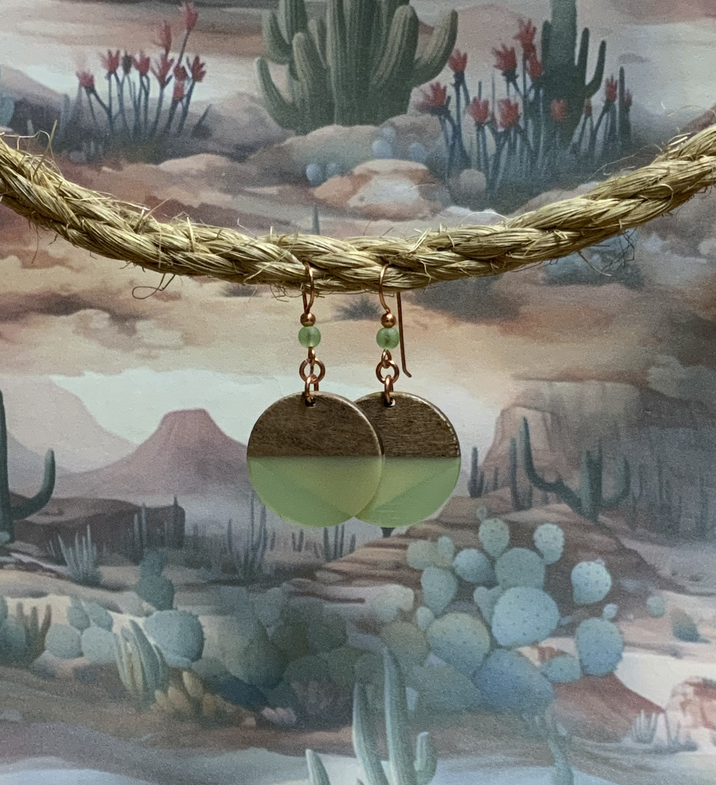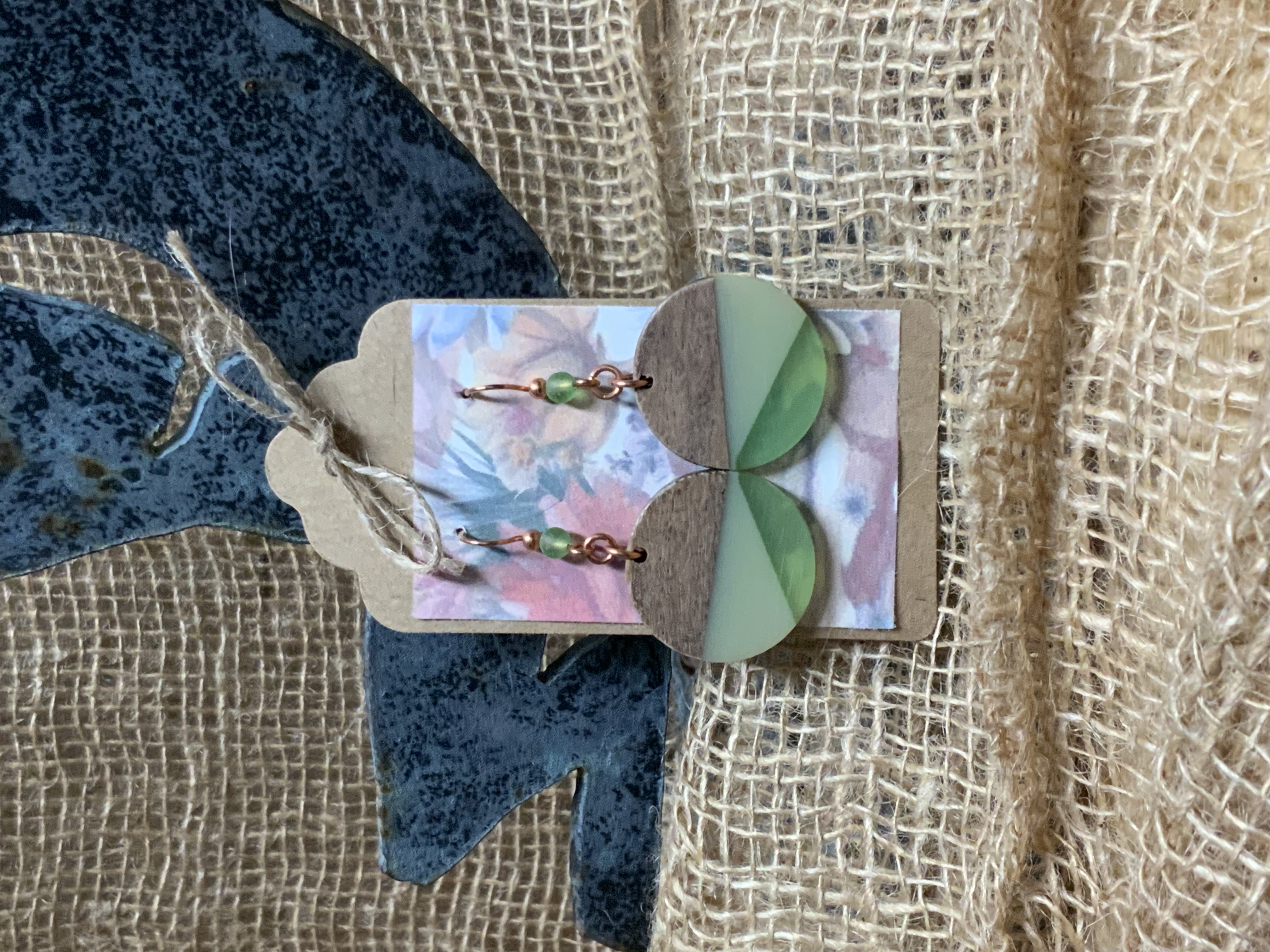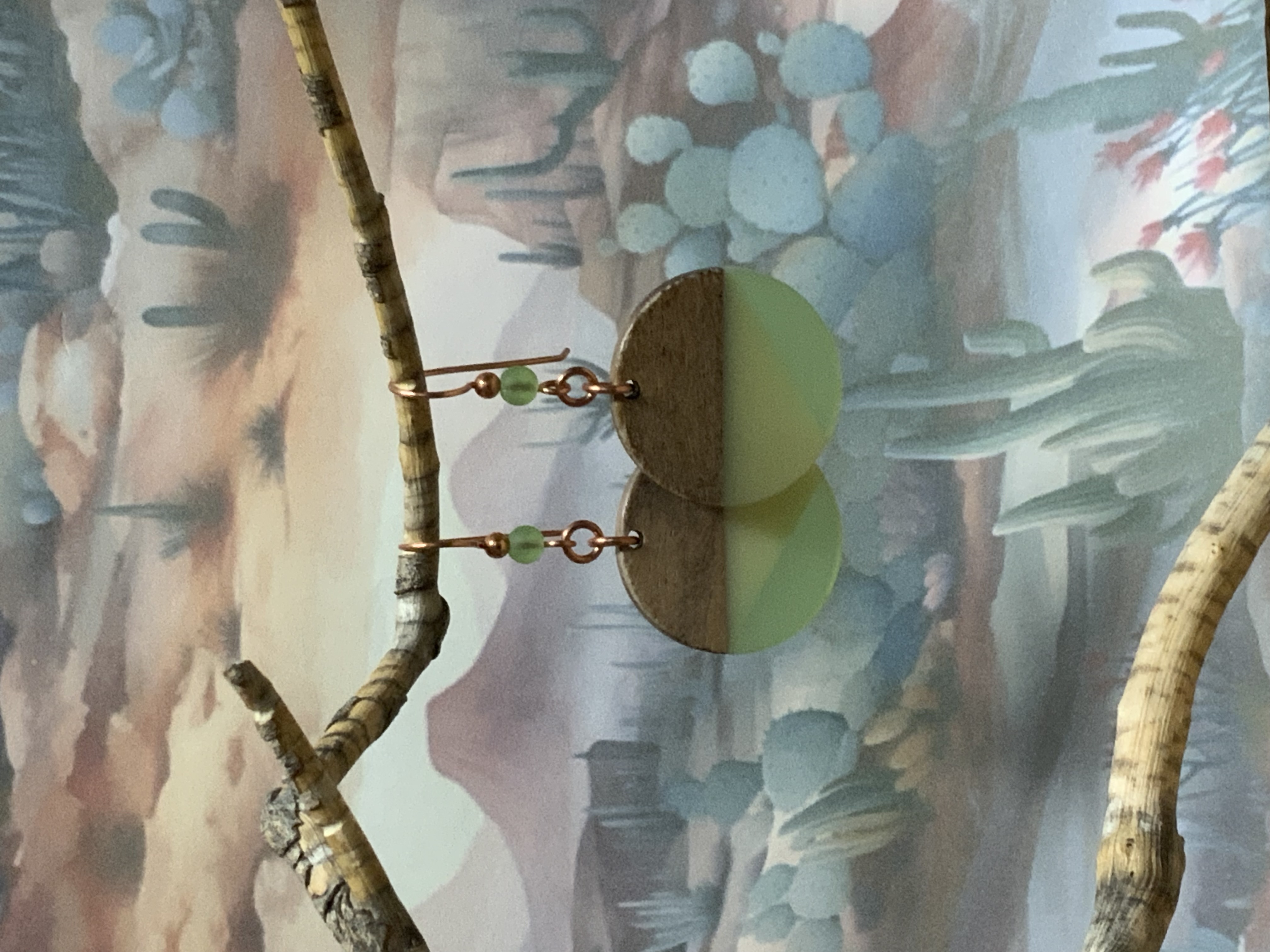 These earrings have handmade copper jump rings and ear wires with 4mm peridot Beach-Style glass beads. The bold coin drop has light hued green resin paired with patterned walnut wood. Very lightweight. Each pair of earrings comes displayed on a handmade card.
