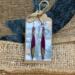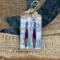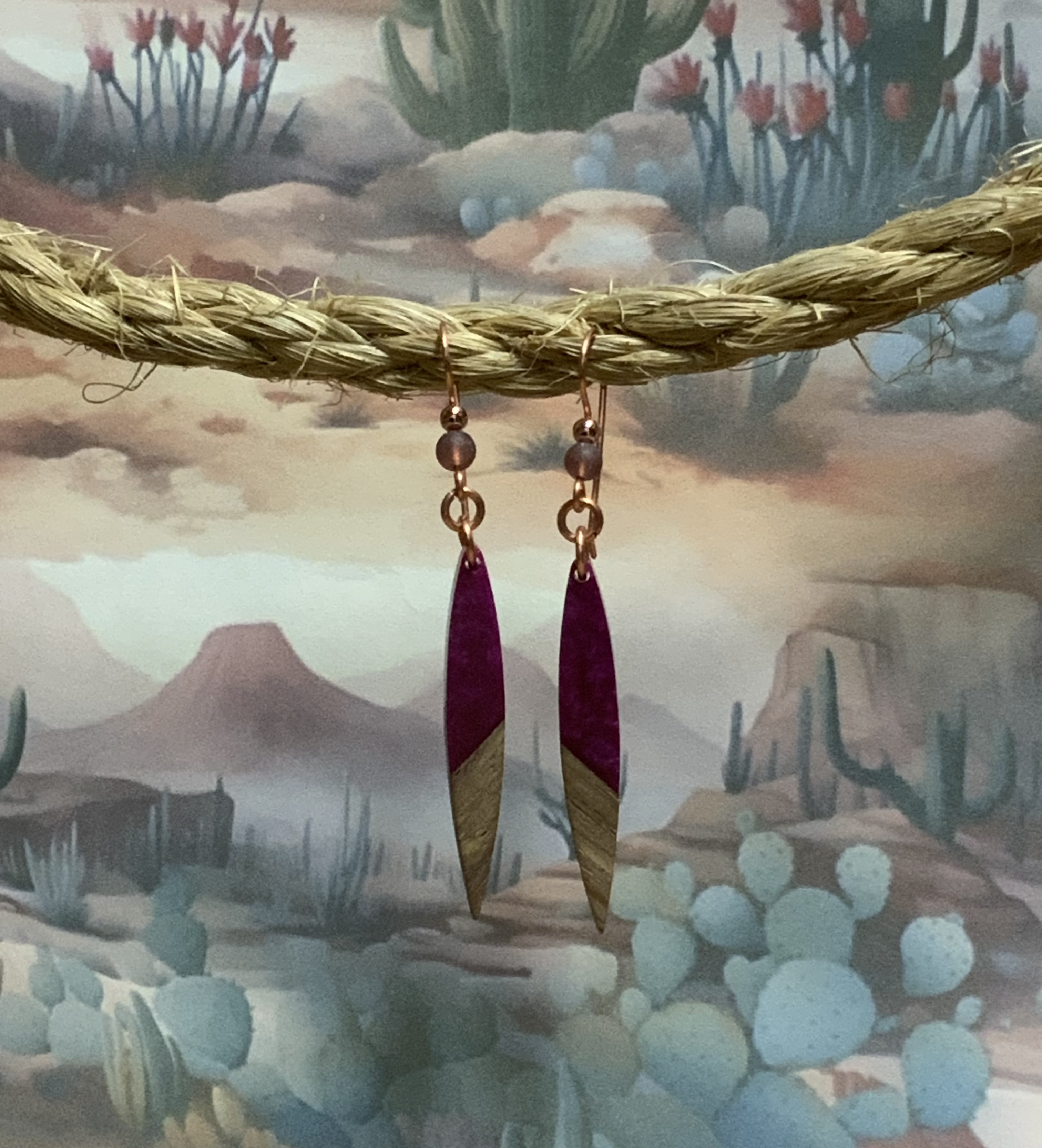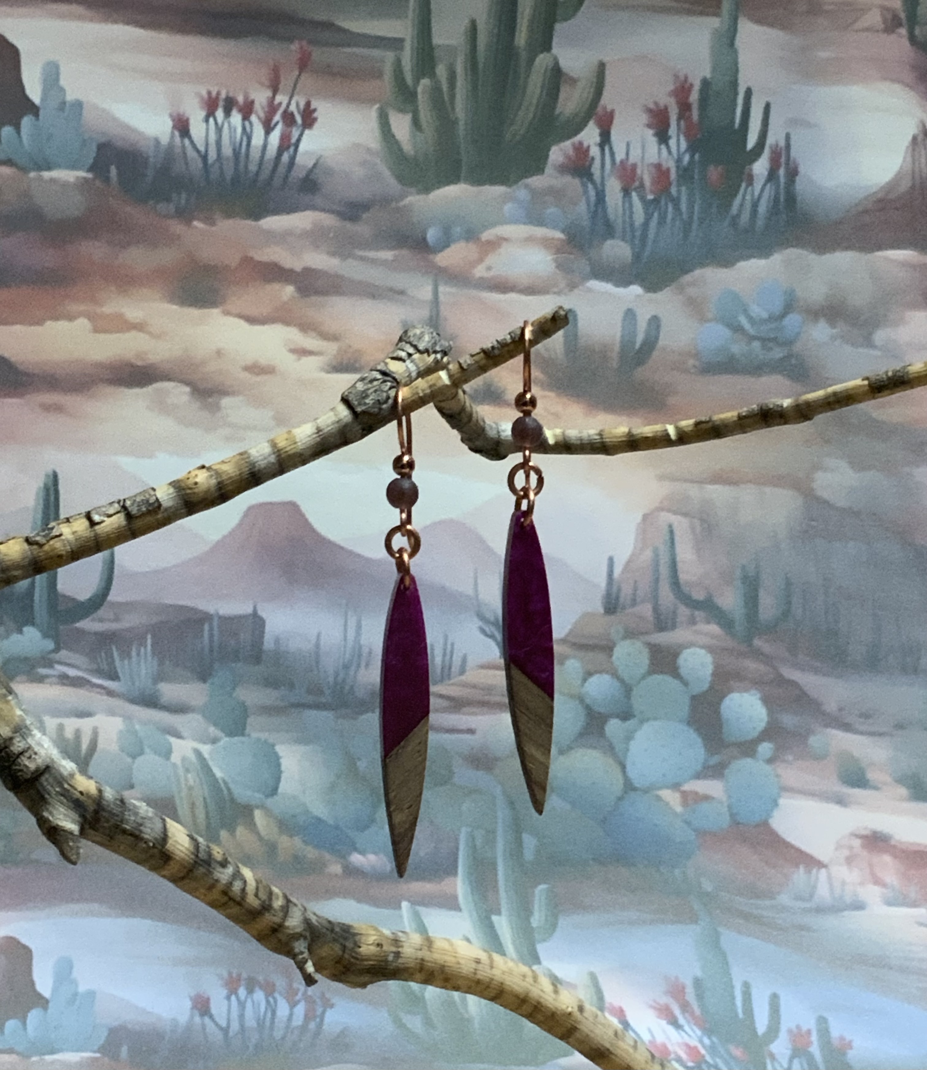 These earrings have handmade copper jump rings and ear wires with 4mm amethyst Beach-Style glass beads. The dagger shaped drop is made of walnut wood and plum resin. Giving these earrings a rock n’ roll vibe. Each pair of earrings comes displayed on a handmade card.