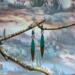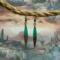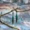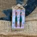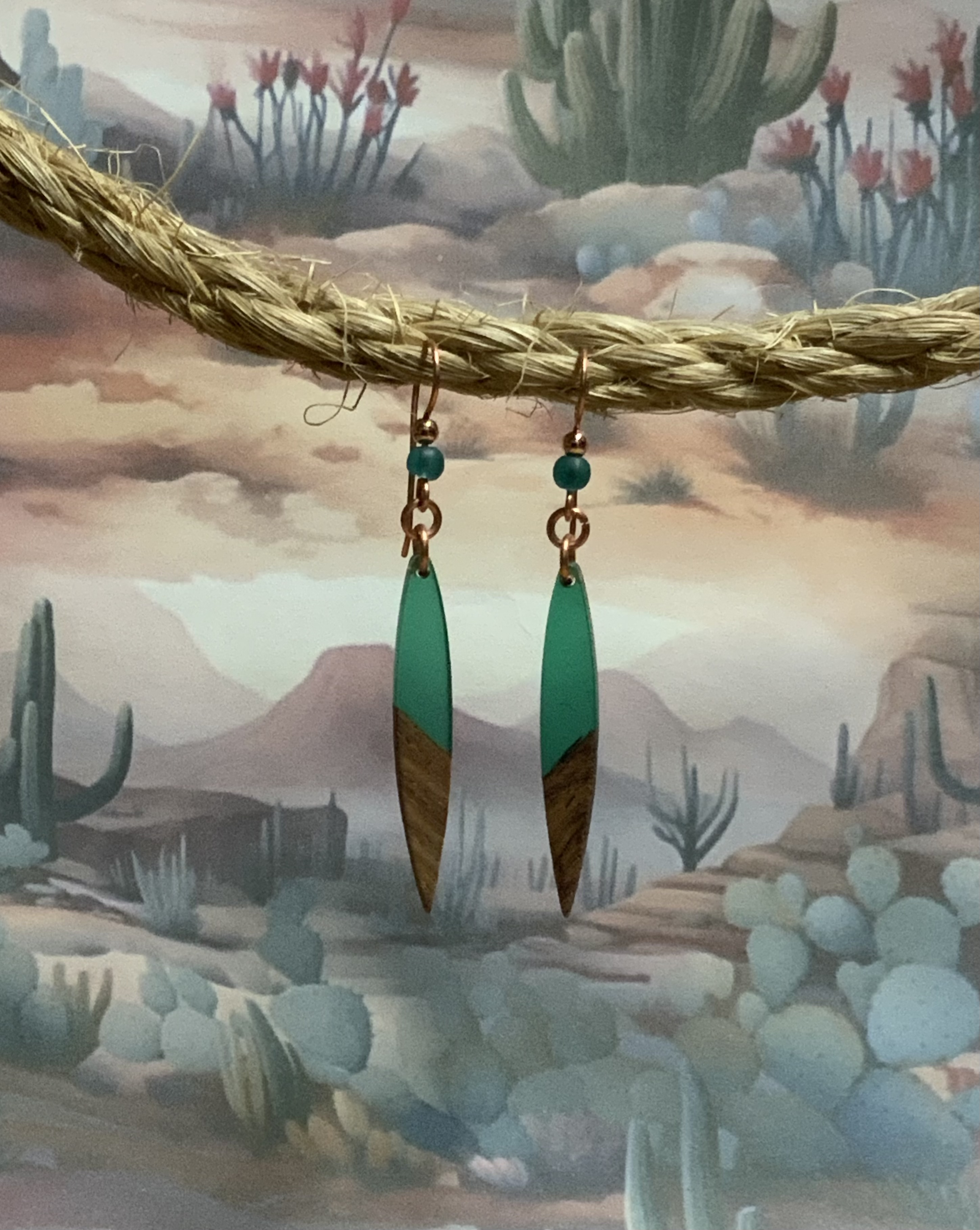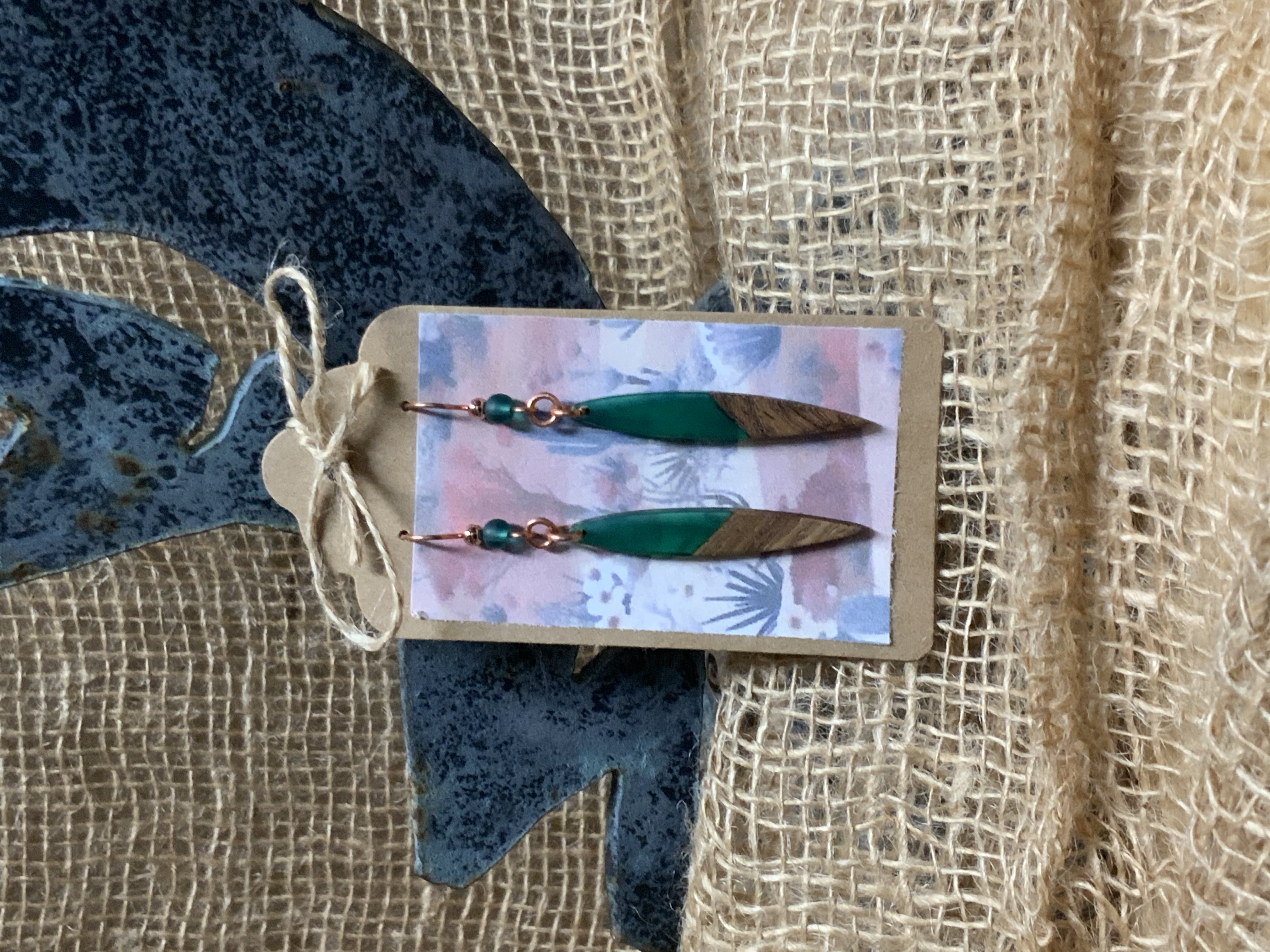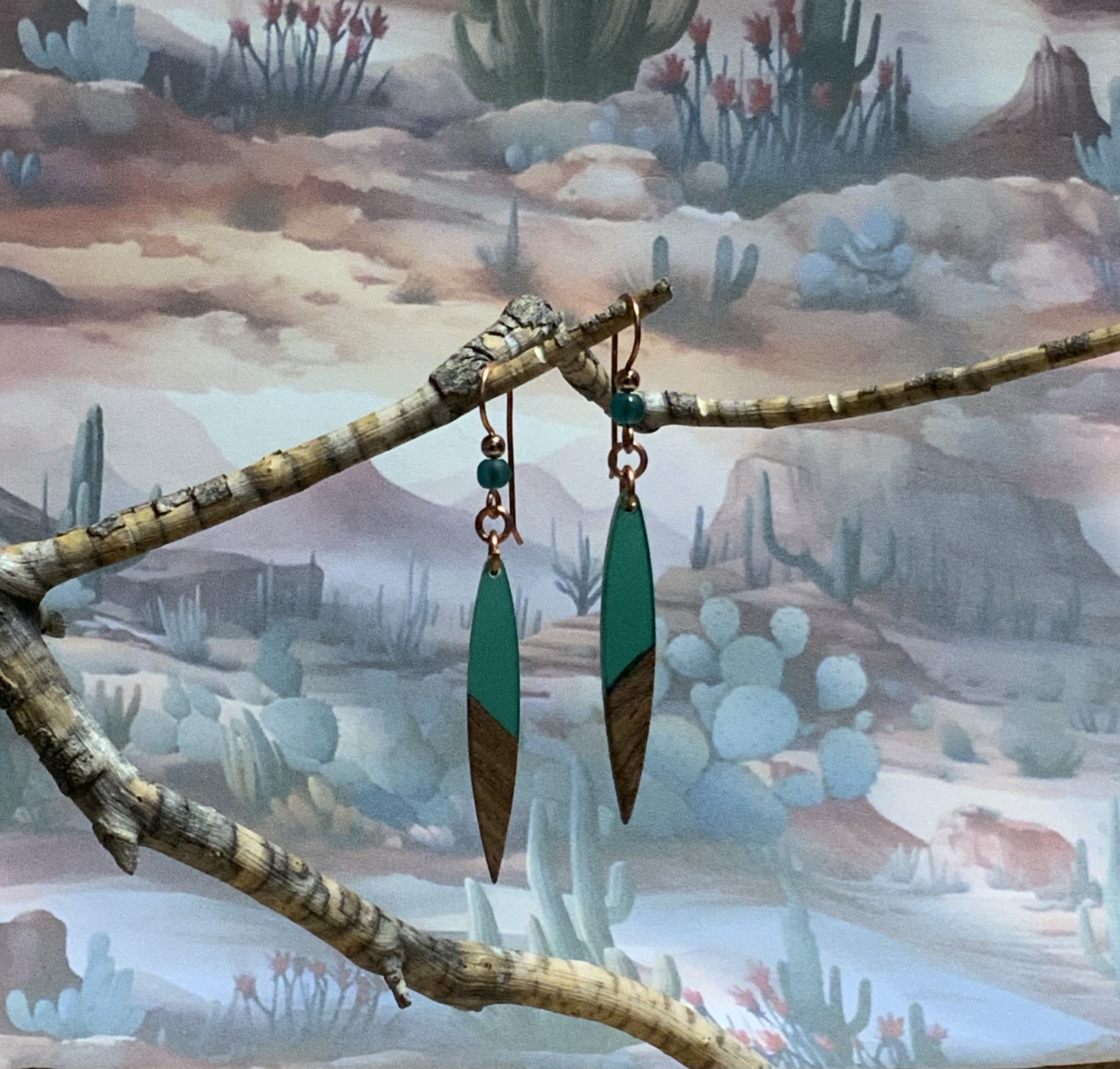 These earrings have handmade copper jump rings and ear wires with 4mm peacock blue Beach-Style glass beads. The dagger shaped drop of emerald green resin meeting the walnut wood, give these earrings an alpine look. Each pair of earrings comes displayed on a handmade card.