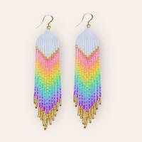 Pastel magic and playful color…our Cotton Candy Dream Earrings are handwoven featuring a soft pink backdrop that flows into a vivid rainbow chevron, finished with shimmering gold fringe for a luxe, boho-chic vibe. The perfect mix of sweet and bold, they’re a joyful celebration of self-expression and fun.