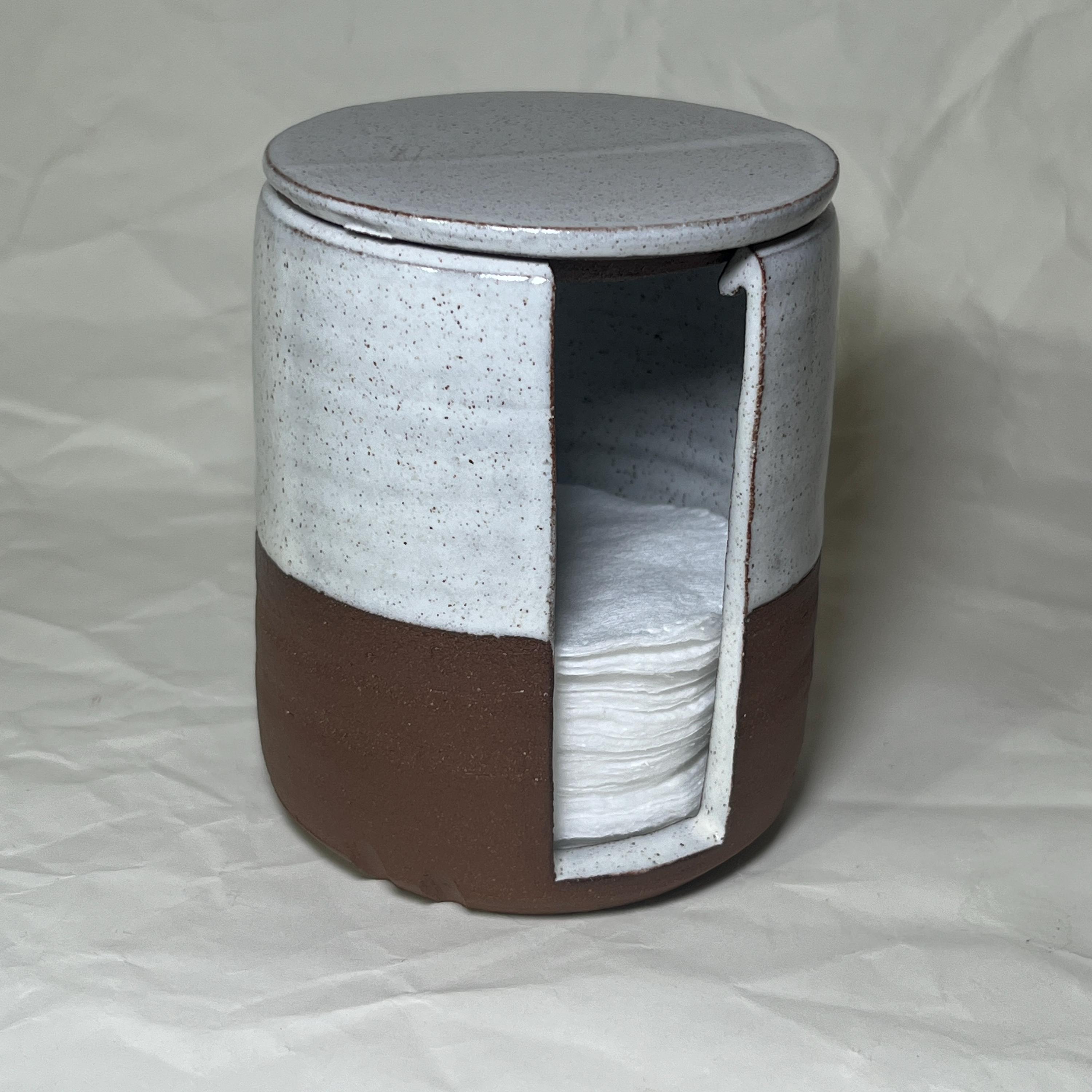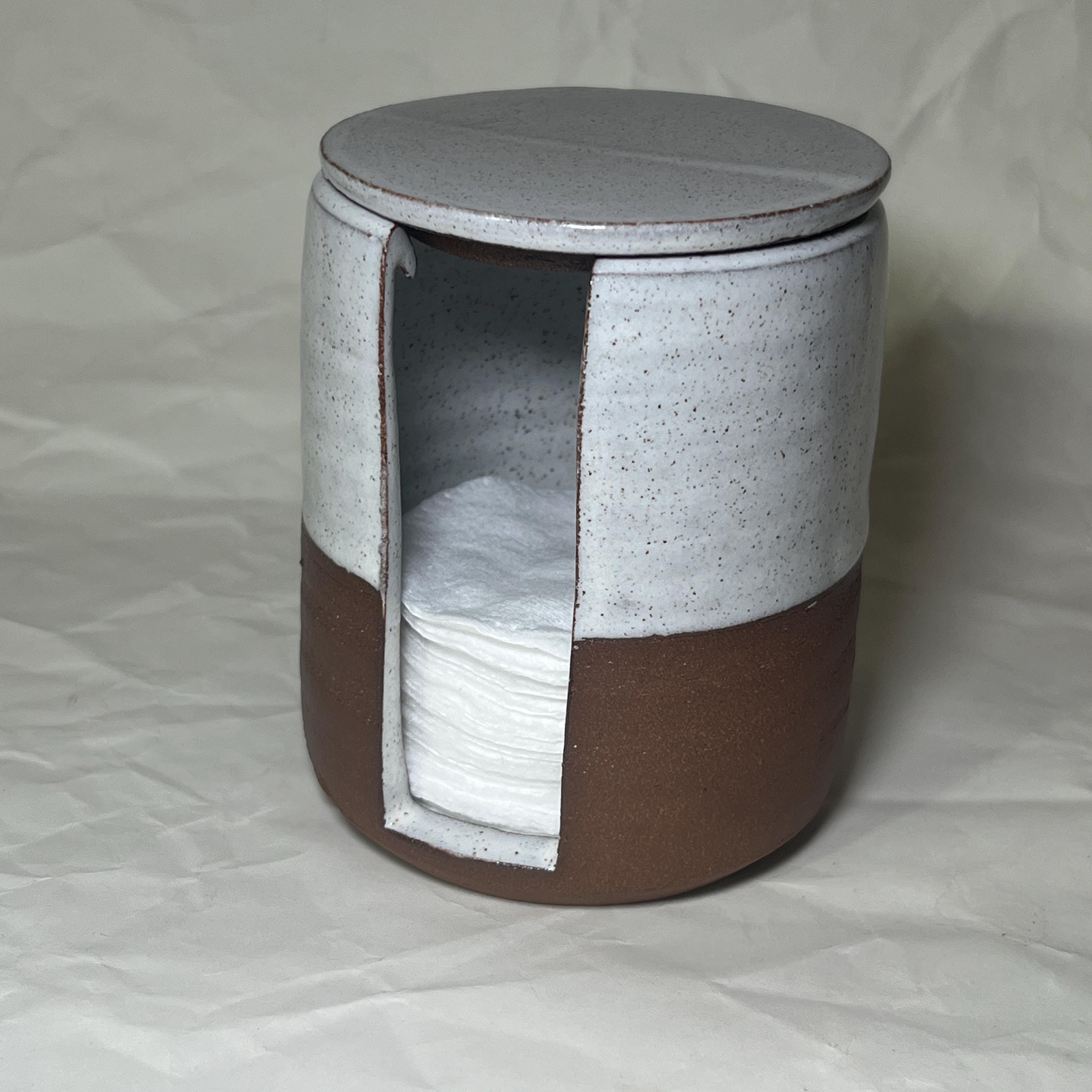 Add elegance to your bathroom or vanity with this handmade ceramic cotton pad caddy. Designed with a front slit for easy access, this piece makes it simple to store, refill, and grab fresh cotton rounds. Crafted from red stoneware clay and finished with a soft speckled white glaze, it’s a practical yet beautiful way to keep your essentials close at hand.