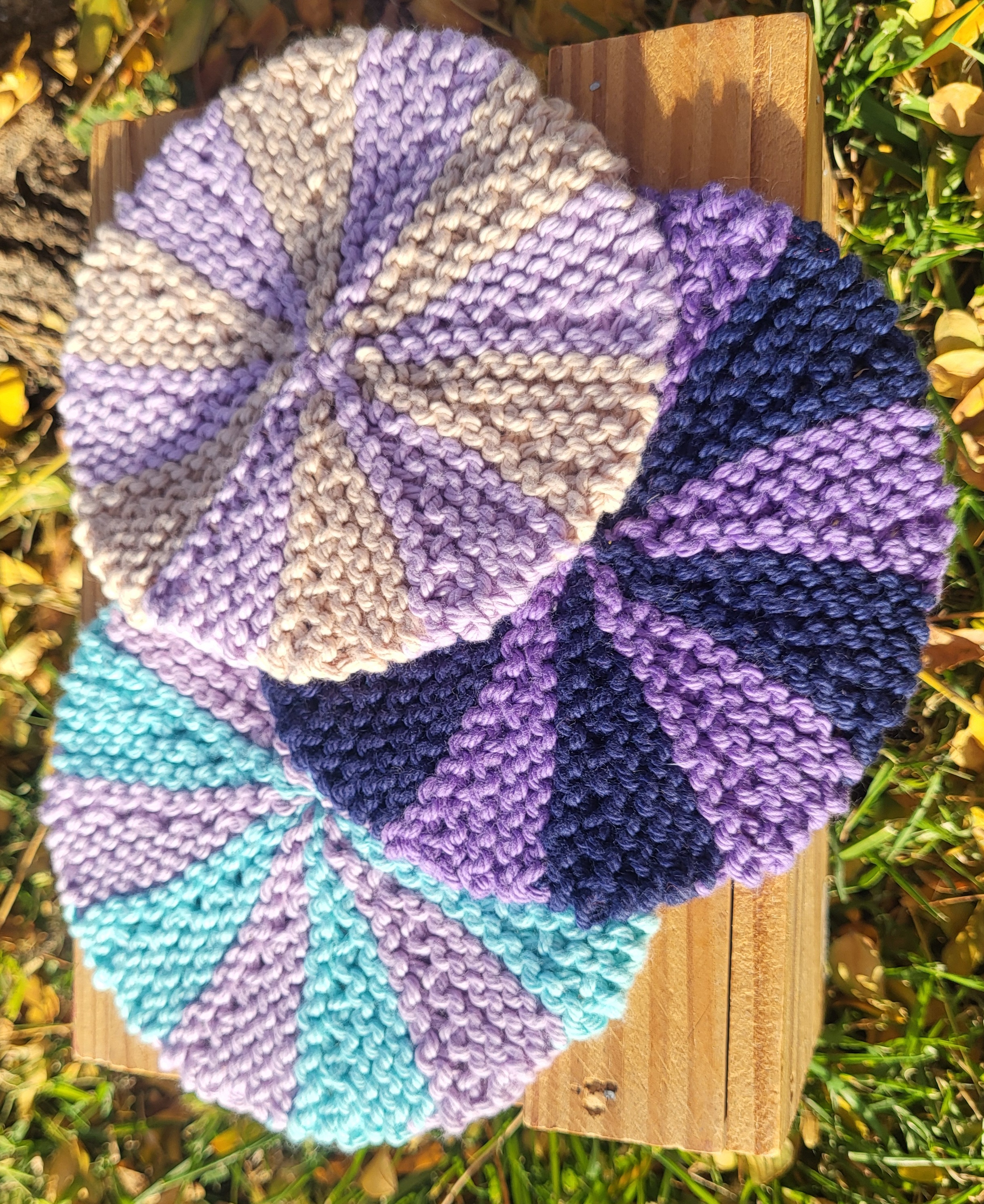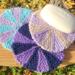 These soft cotton washcloths are perfect in the bath, and soft enough for your face! They also make great dishcloths, or even hot pads for pans! The set has 3 cloths in coordinating purples, blues and grays. Each cloth is about 5 inches across. (Soap not included!)