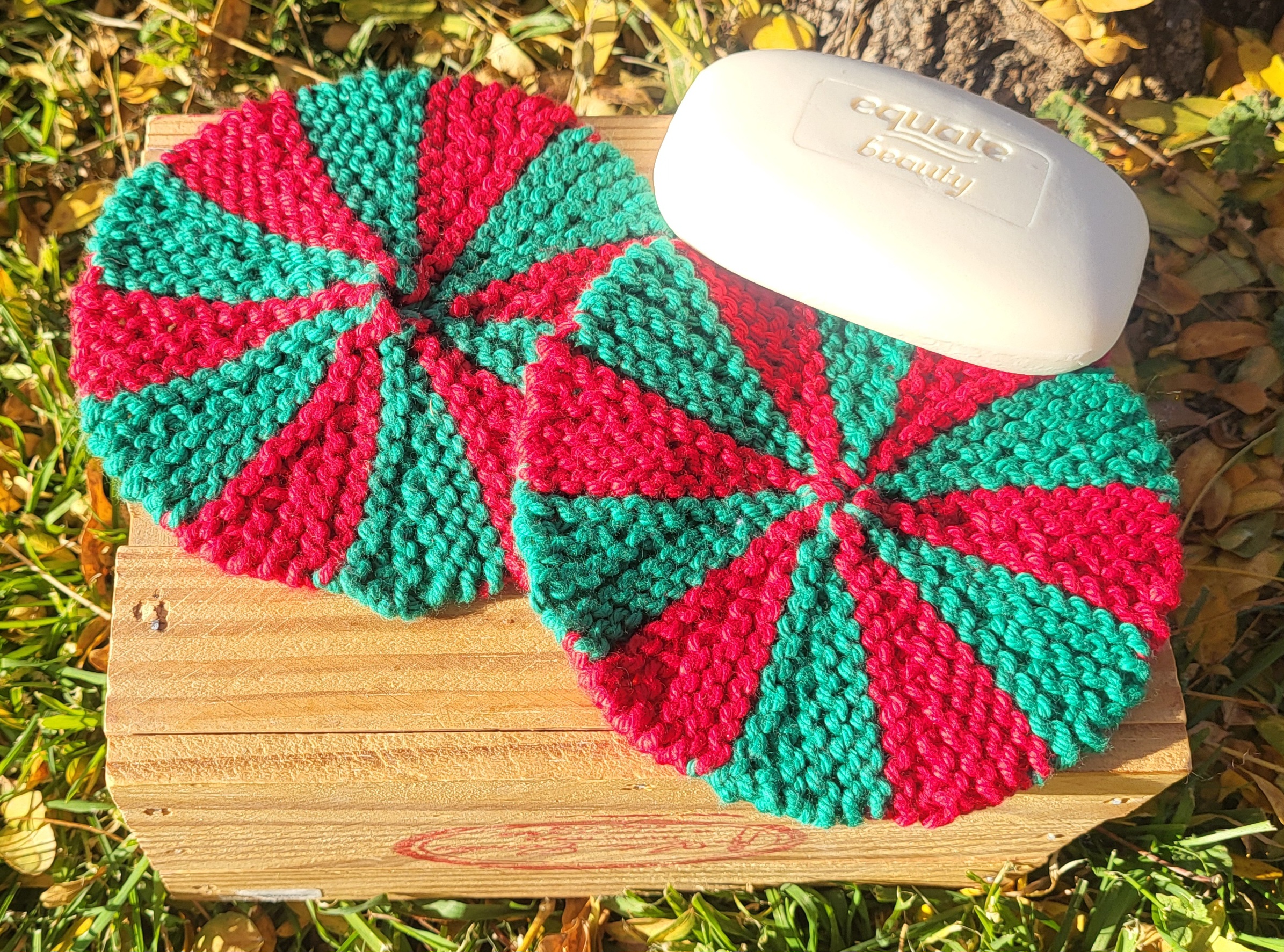 These soft cotton washcloths are perfect in the bath, and soft enough for your face! They also make great dishcloths, or even hot pads for pans! The set has 2 cloths in Christmas green and red. Perfect to put out for your holiday decor! Each cloth is about 5 inches across. (Soap not included!)