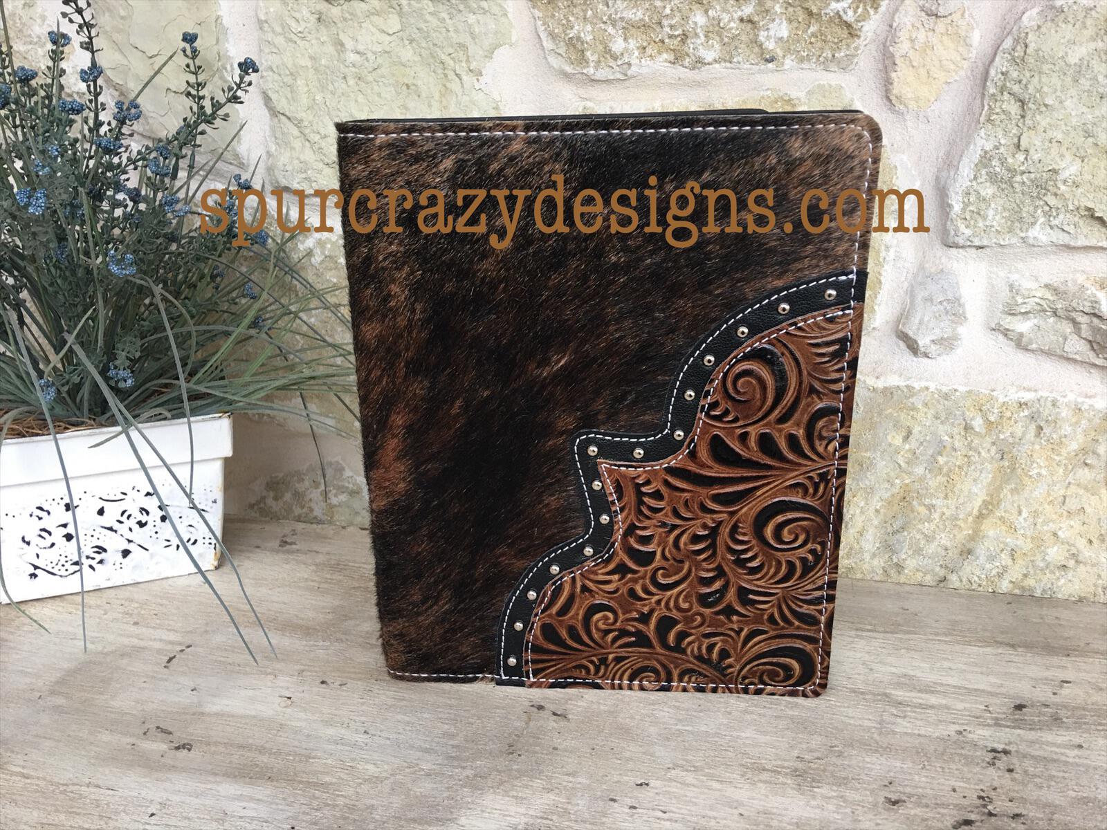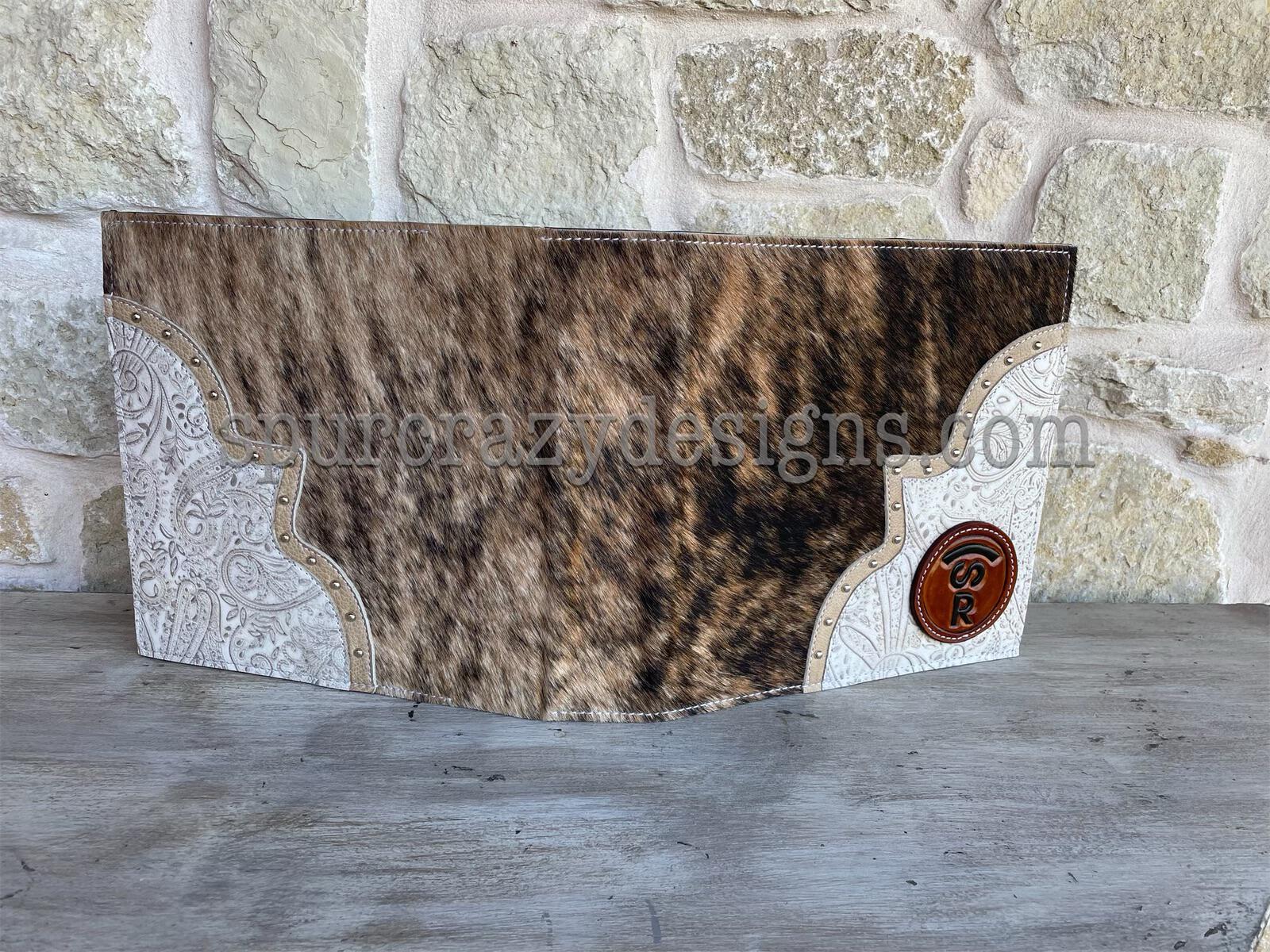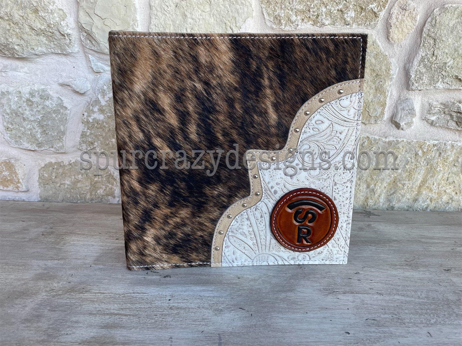 2-inch three ring binder, trimmed in brindle or salt and pepper cowhide and embossed leather, fully covered on front and/or back. Your brand or monogram will be hand tooled and attached at the bottom right corner. Several lovely colors and styles of embossed leather to choose from. A stylish way to store important documents or photos! These make a great gift for birthdays, weddings, and anniversaries. Created by Spur Crazy Designs.