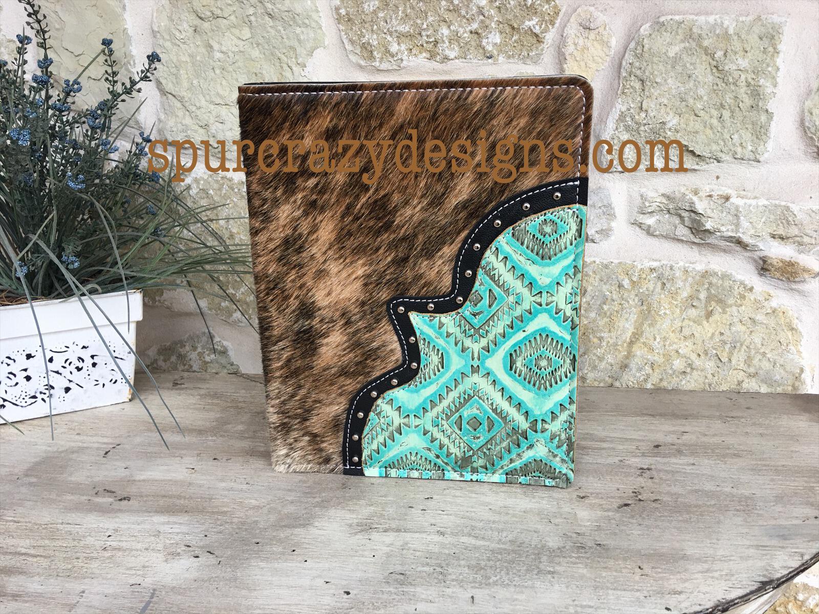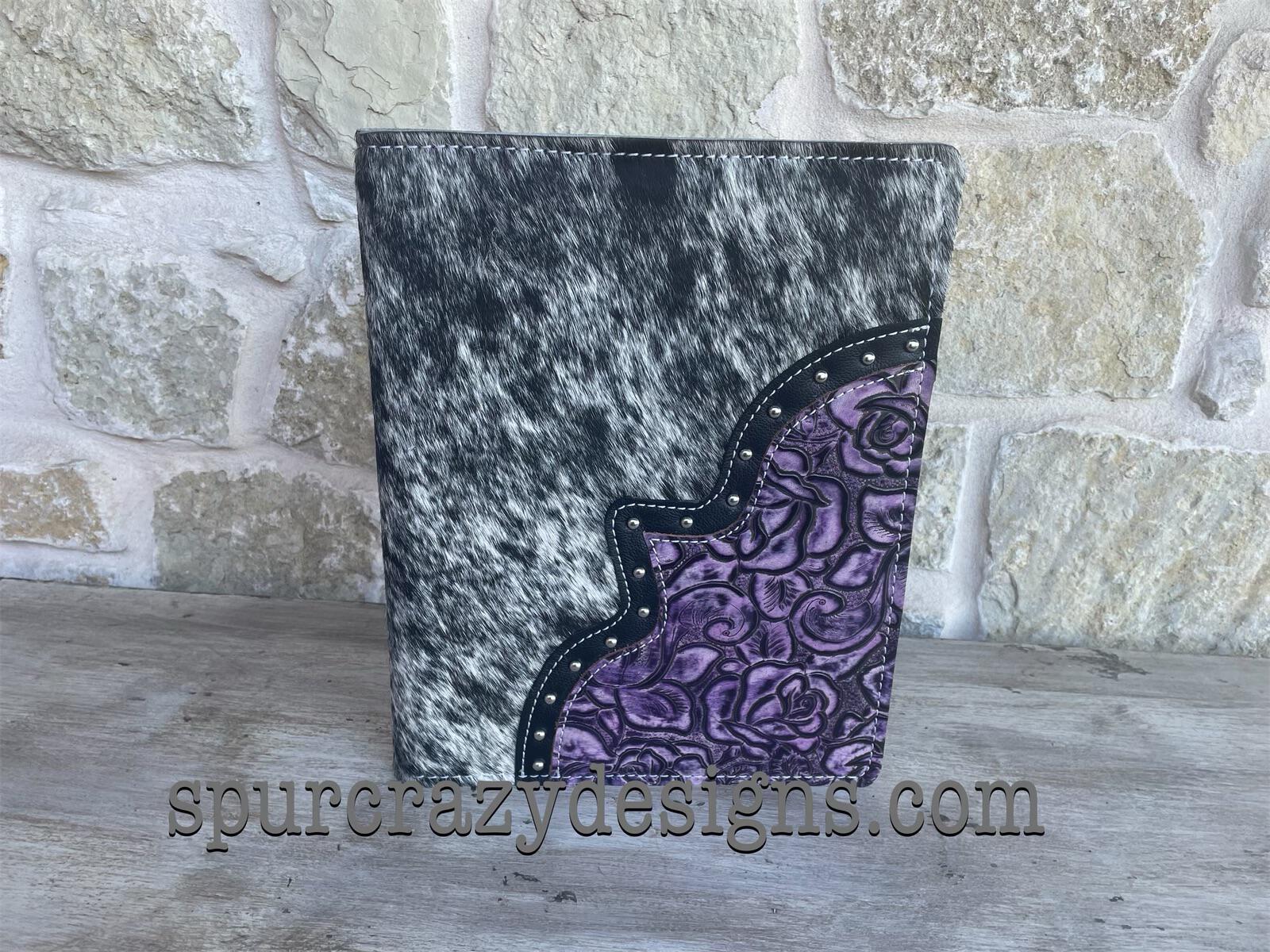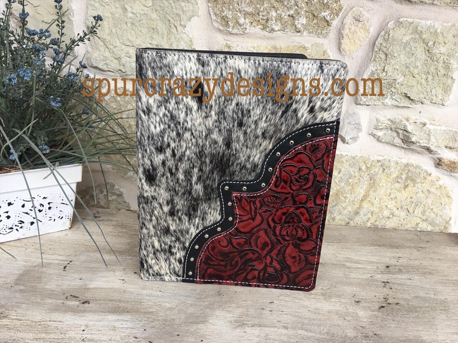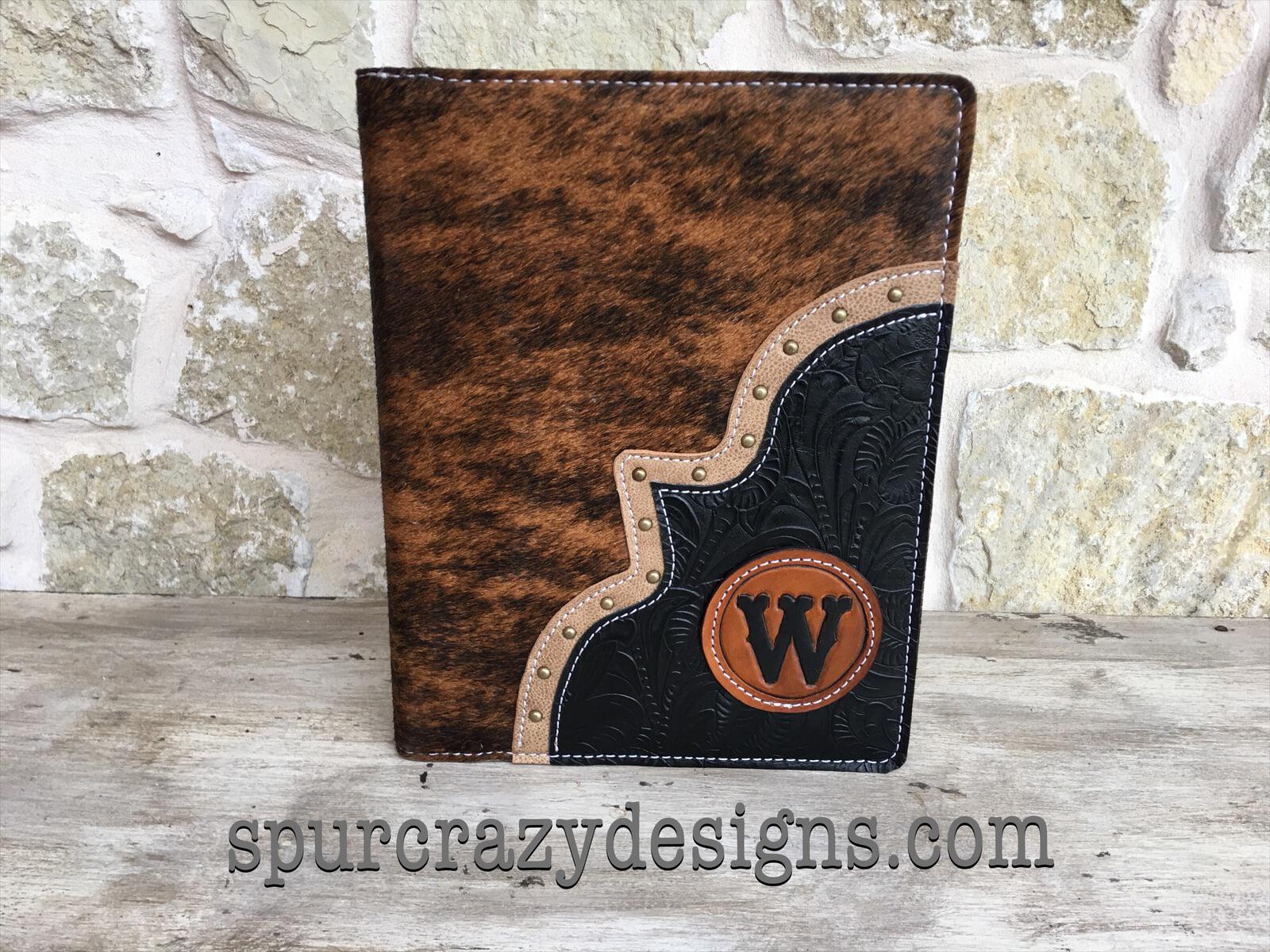 2-inch three ring binder, trimmed in brindle or salt and pepper cowhide and embossed leather, fully covered on front and/or back. Your brand or monogram will be hand tooled and attached at the bottom right corner. Several lovely colors and styles of embossed leather to choose from. A stylish way to store important documents or photos! These make a great gift for birthdays, weddings, and anniversaries. Created by Spur Crazy Designs.