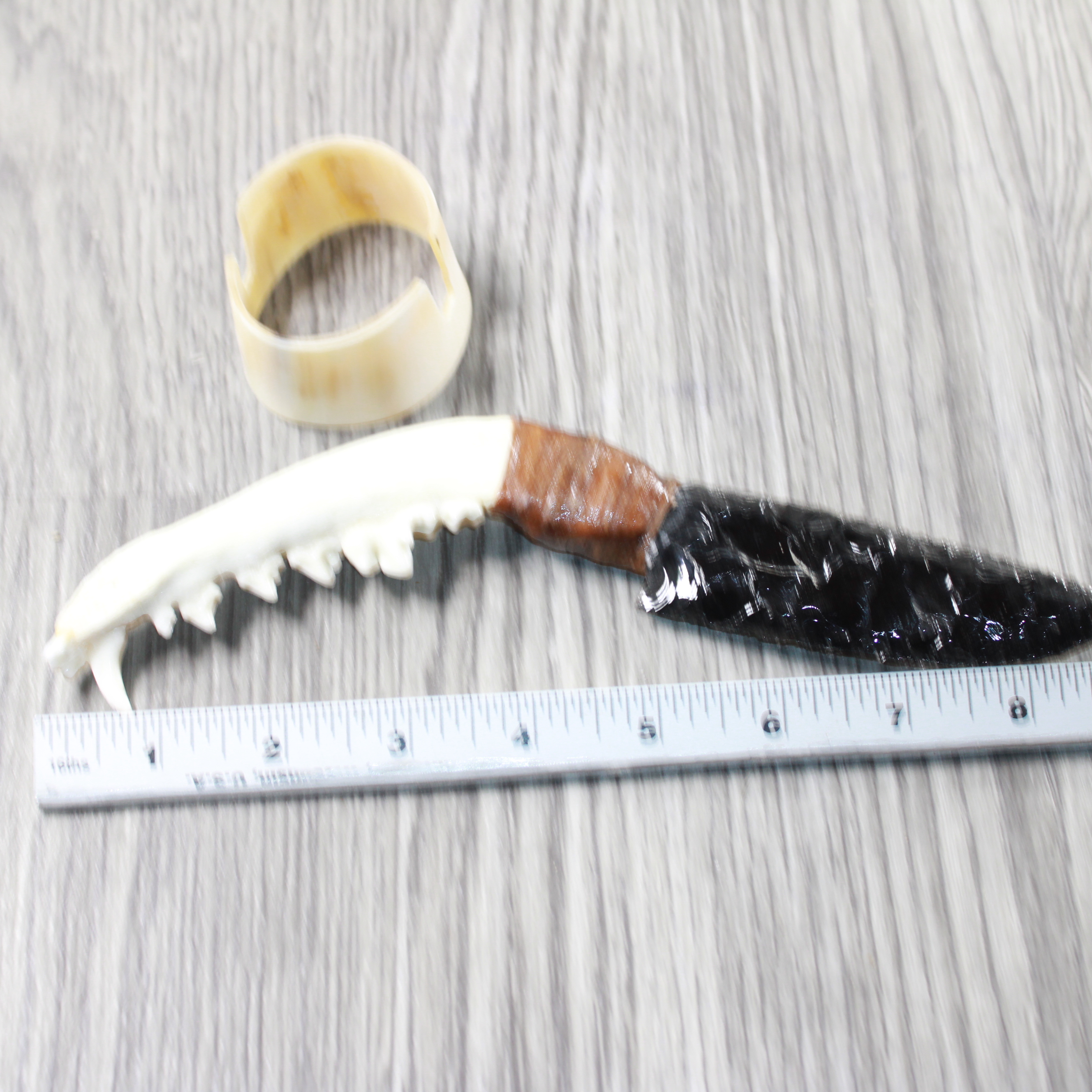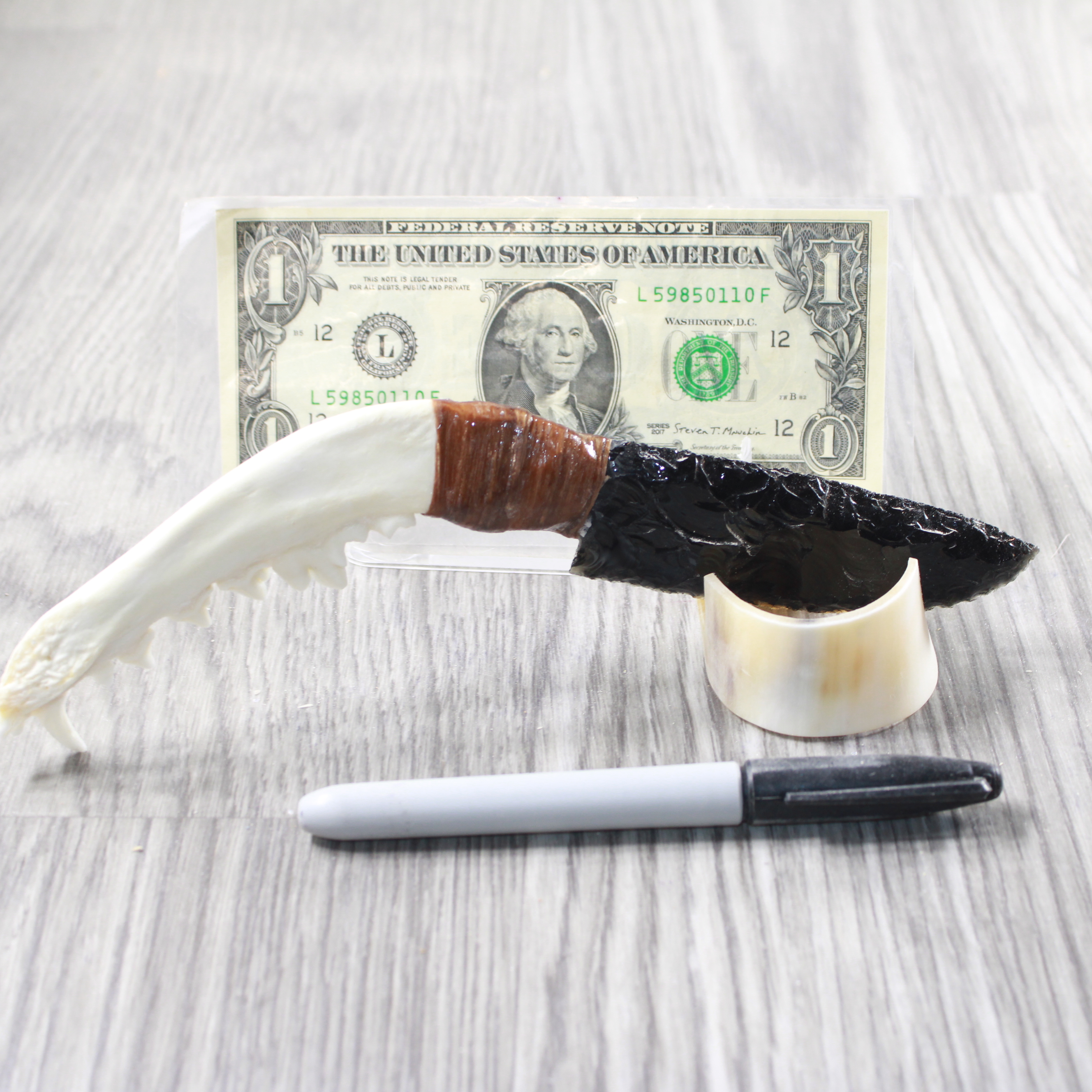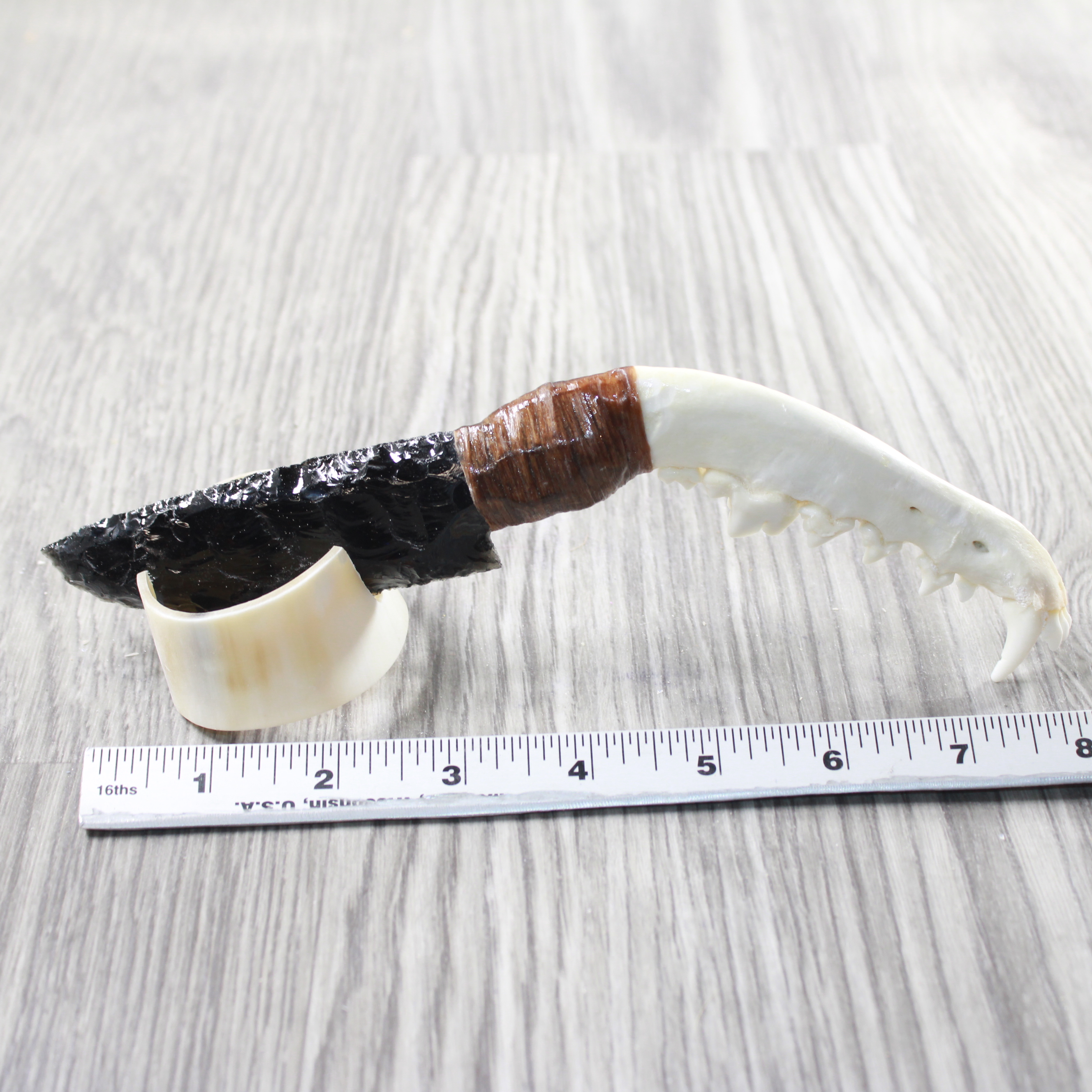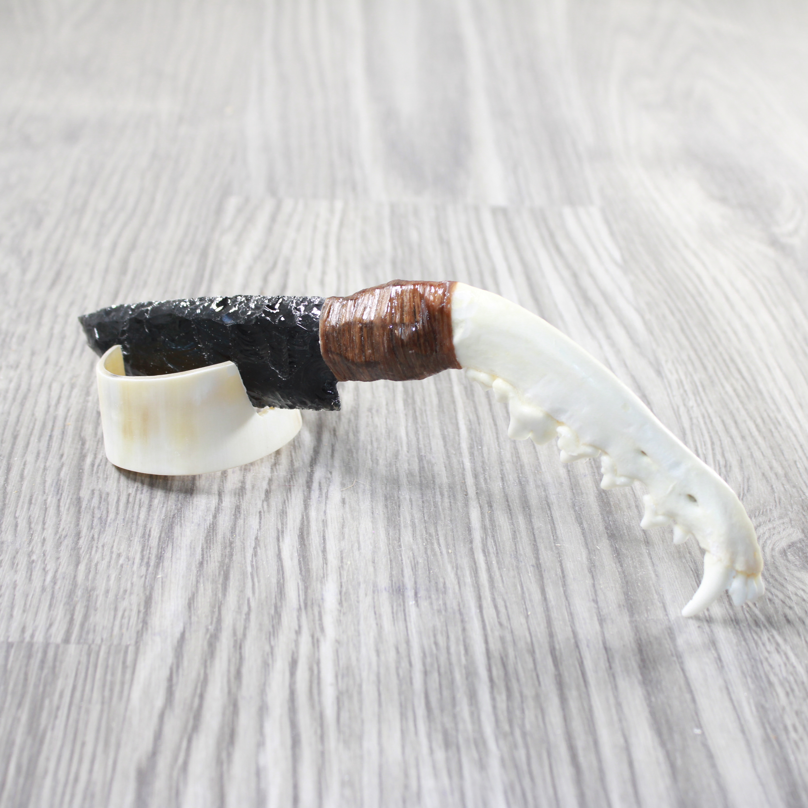 The handle is made from a coyote jawbone.