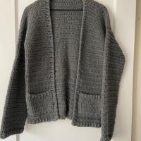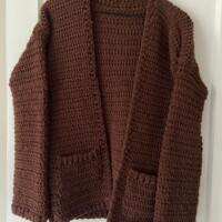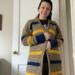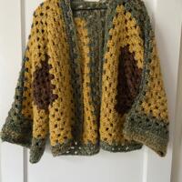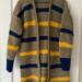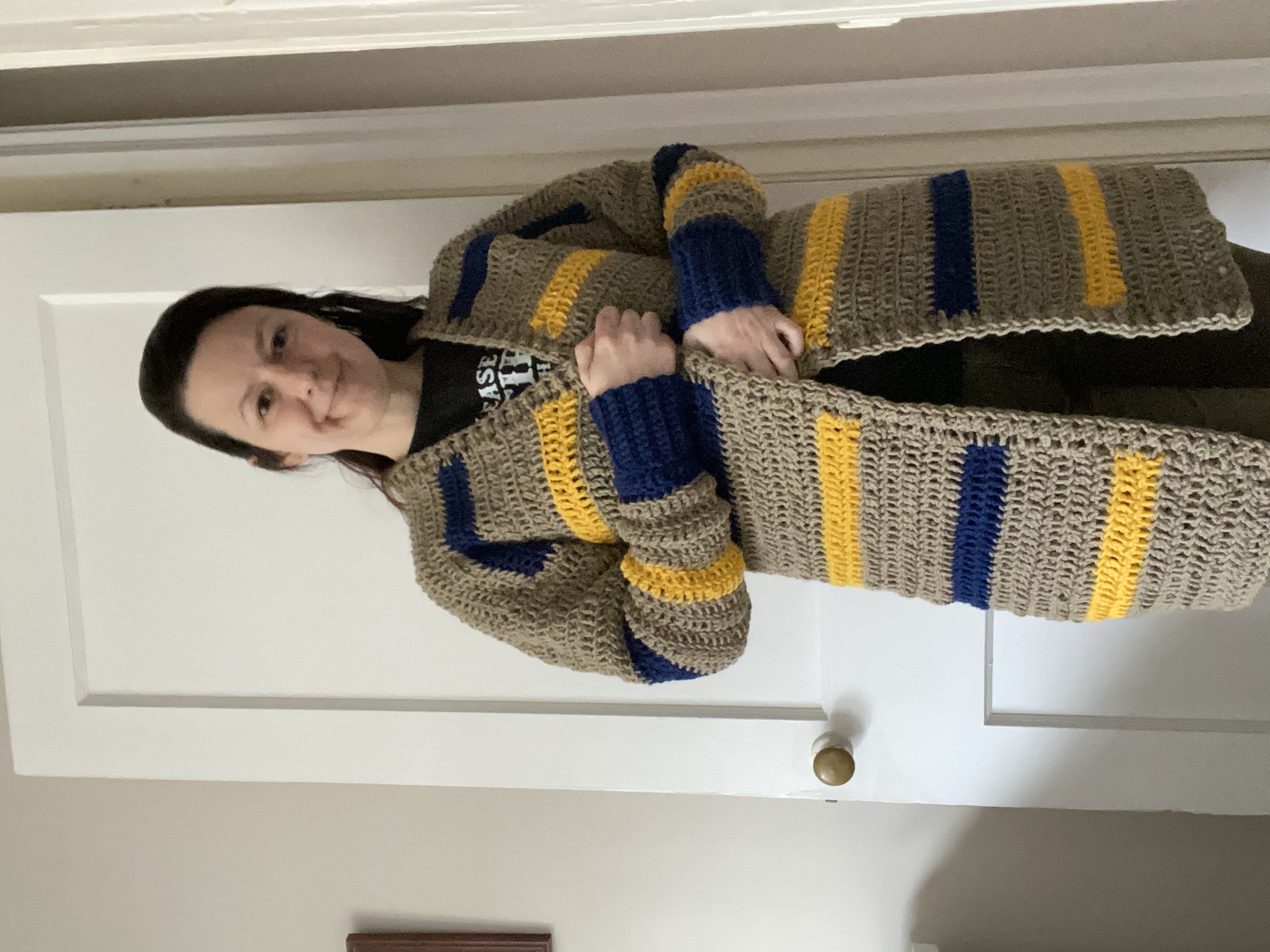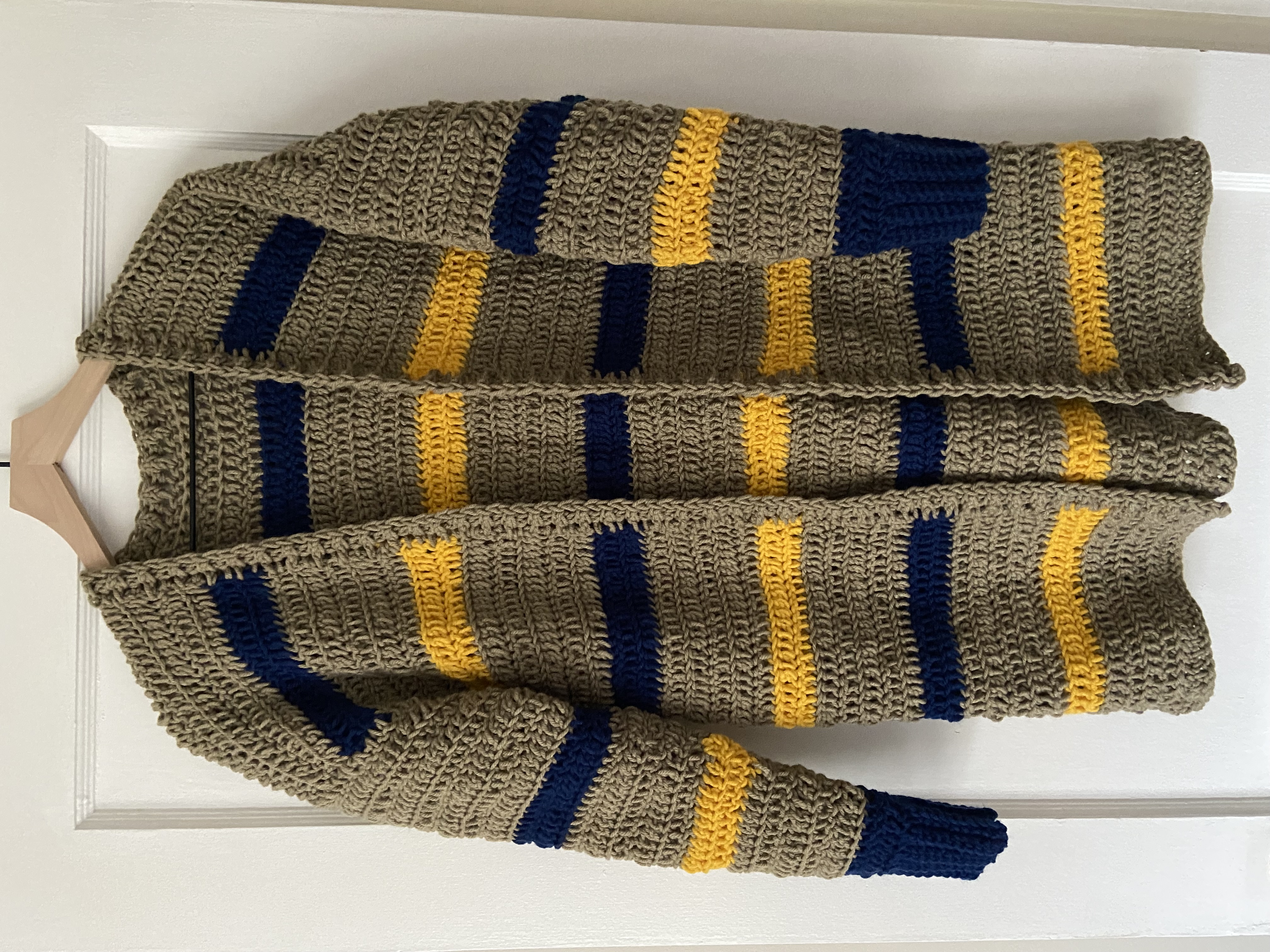 Keep yourself cozy and warm with this hand crocheted cardigan, in taupe with navy blue and yellow stripes. This cardigan is 22in wide and 31in long.