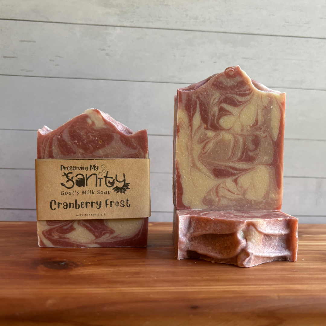 Handmade in small batches in my Minnesota kitchen, this Cranberry Frost soap contains Olive Oil, Locally Sourced Minnesota Goat’s Milk, Unrefined Organic Coconut Oil, RSPO Certified Sustainable Palm Oil, Food-Grade Sodium Hydroxide, Castor Oil, Fragrance Oil (Paraben & Phthalate Free), Sunflower Oil, Mica.