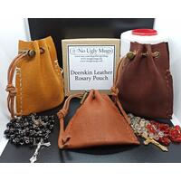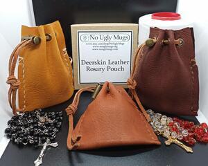 This heavy duty pouch measures approximately 3 1/4" wide by 3 1/4" high (Some variation in size may occur.) Hand cut, hand stitched using a saddle stitch, this pouch has a smooth, supple feel on the outside and the interior is suede-like to keep your rosary safe and protected. We use one of the best threads for sewing leather, Ritza Tiger premium braid 1.0 mm polyester thread, when we hand stitch our heavier Crazy Horse Rosary pouches.