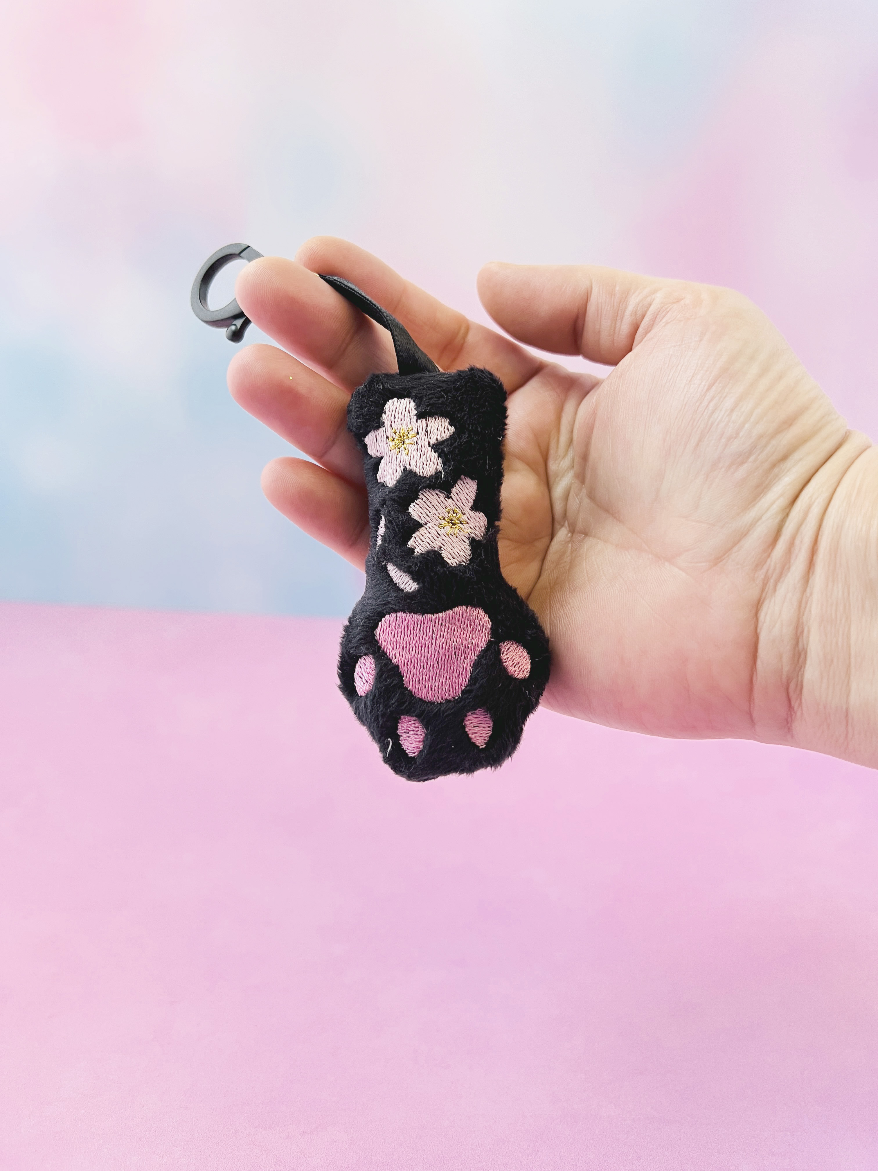This is a brand-new version of my bestselling Cat Paw Plush Bag Charm, now with a soft sakura twist! Made from plush black minky fabric, this creepy cute paw features sweet pink embroidered toe beans and delicate pink sakura cherry blossom details for the perfect blend of spooky and soft.