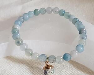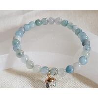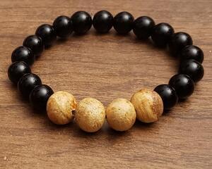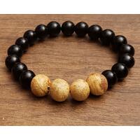 Stainless steel crescent moon surrounded by black onyx and white quartz beads. Stretchable band fits most wrists.