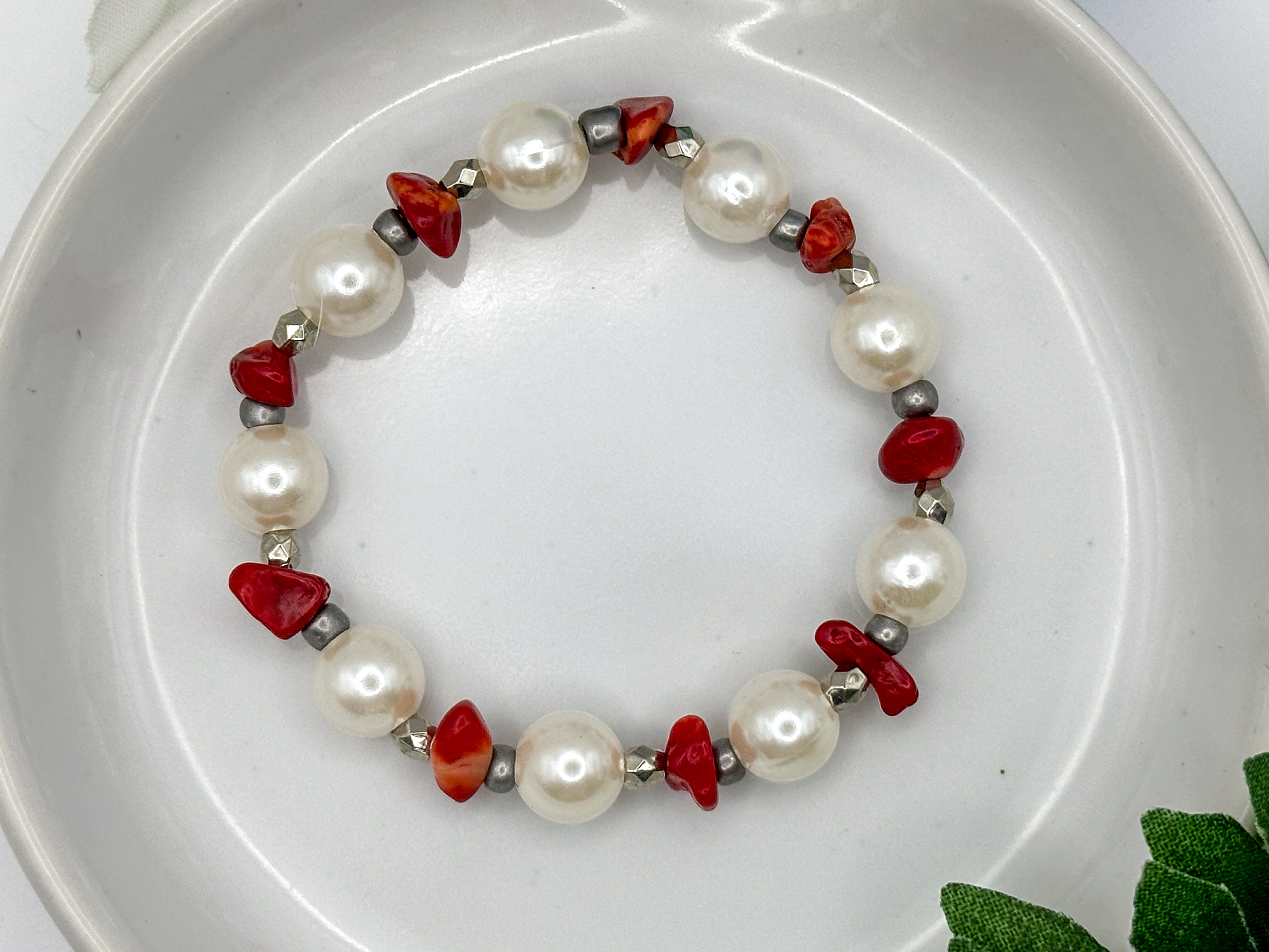 Crimson Hearth Bracelet – Luminous Pearls with Red Coral Accents