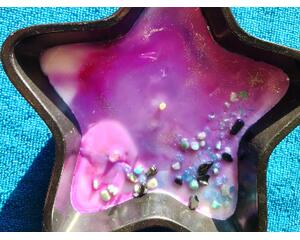 3. Adding Decorative Elements: Once the wax is poured into the mold, I embellish it with carefully selected seashells, sparkling crystals, dried botanicals and a sprinkle of glitter. These decorative touches are meticulously arranged to create a beautiful and eye-catching finish.