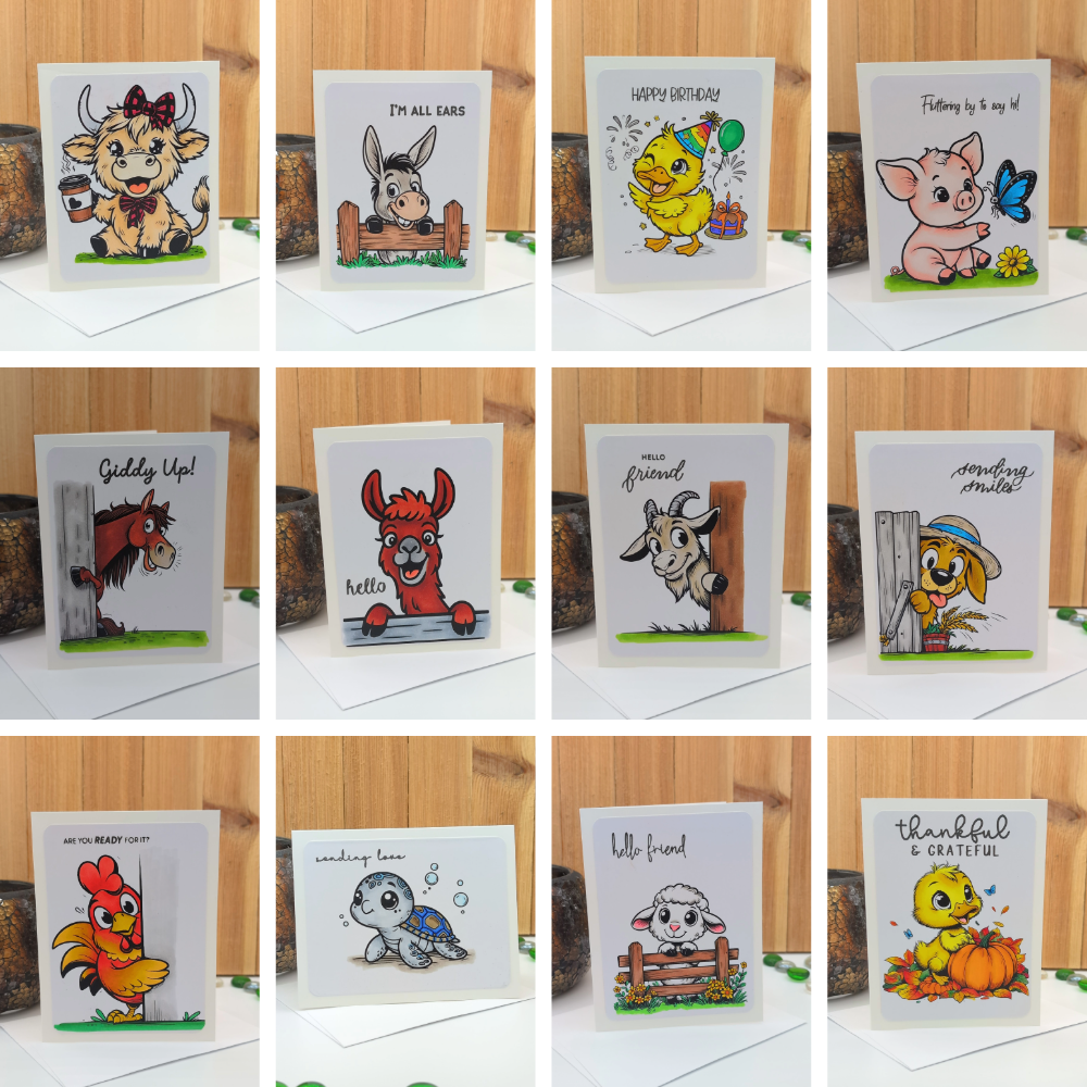 Bring a barnyard of joy to your mailbox with “Critters & Giggles: Farm Friends Edition”—a delightful 12-pack of handmade greeting cards featuring charming farm animals. Each card is lovingly colored with alcohol markers, showcasing playful expressions and rustic whimsy. Designed for all occasions—birthdays, thankfulness, thinking of you, or just because—this versatile set includes mostly blank interiors, giving you space to personalize your message. Whether you're sending a smile or stocking up for heartfelt moments, these cards are a cheerful way to connect.