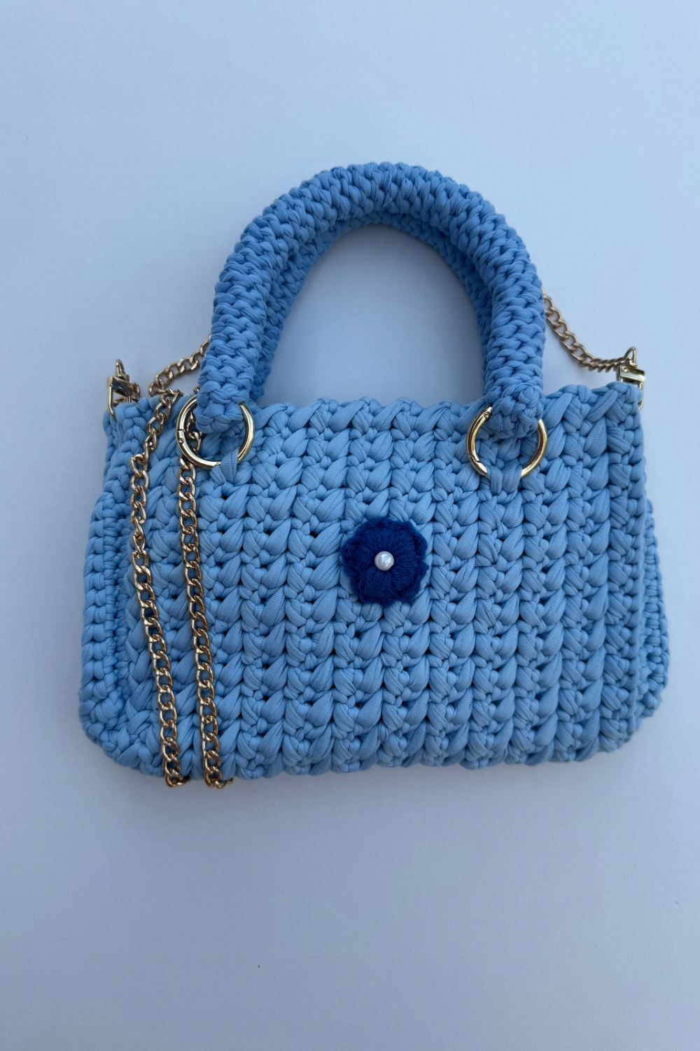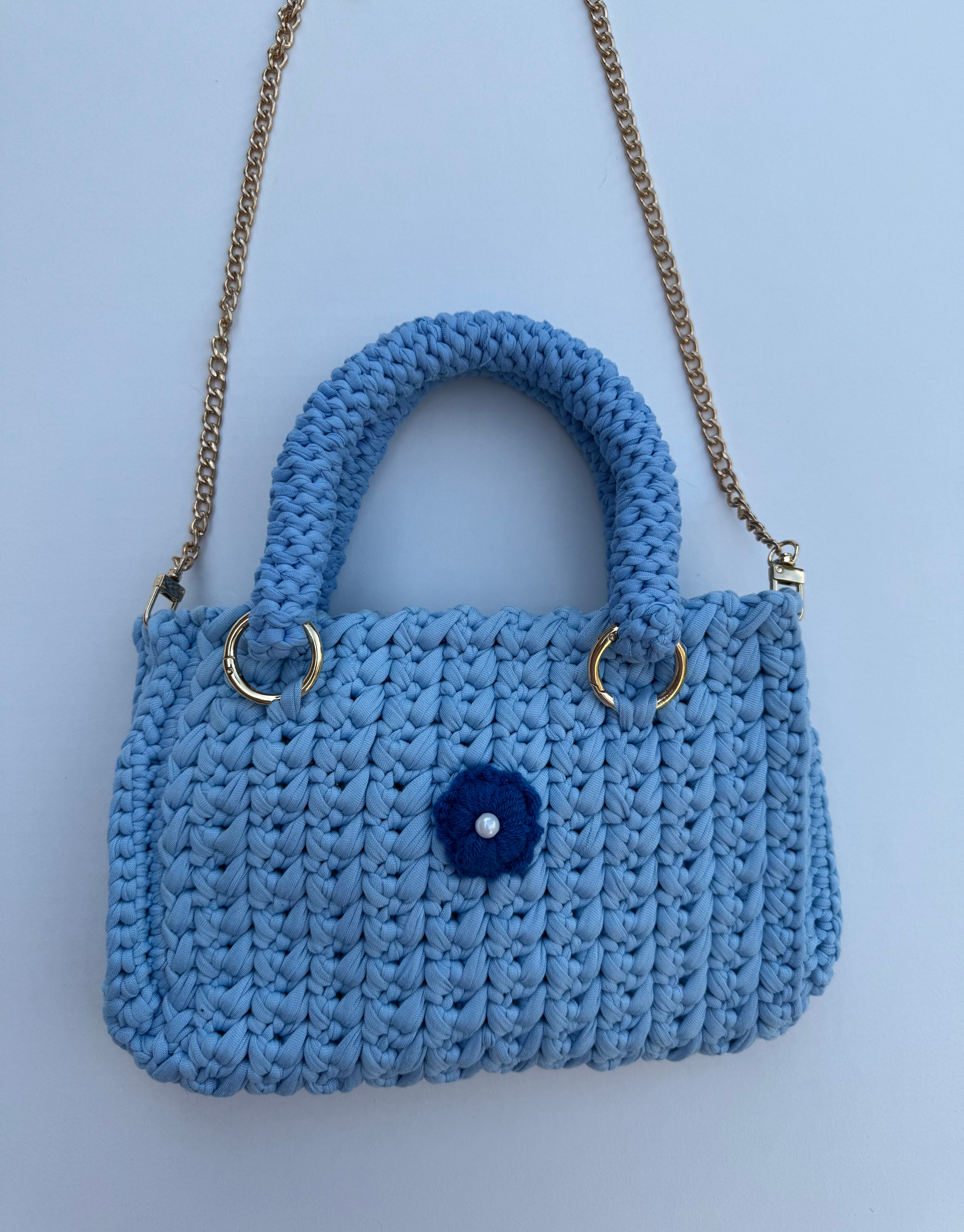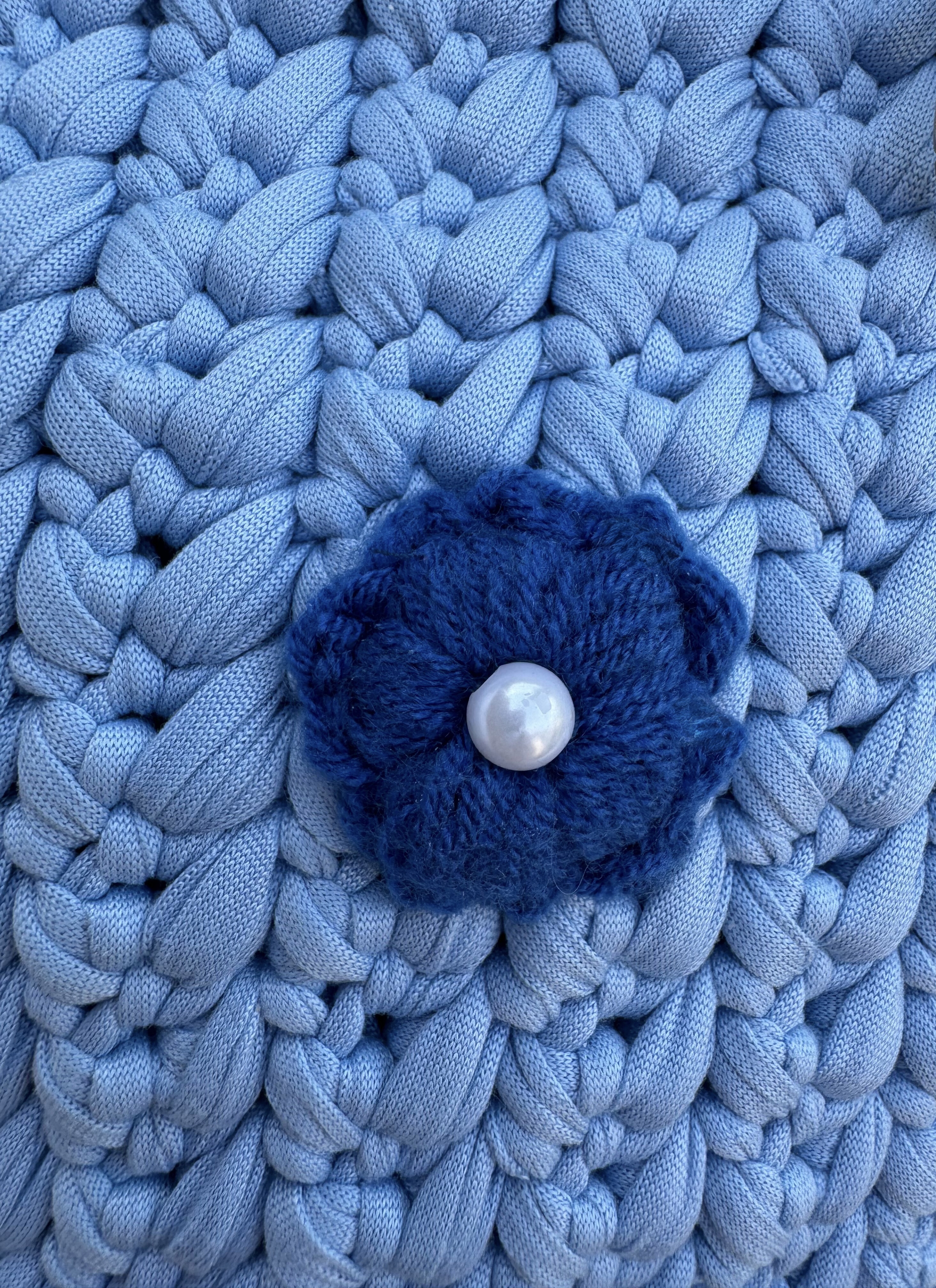 Carry elegance with a handmade touch. The Azzure Bloom Crochet Bag is crafted with soft, durable T - Shirt yarn and beautifully detailed with a small crocheted dark blue flower and pearl accent. Inside it's fully lined with smooth satin for a luxurious feel and extra protection for your essentials.