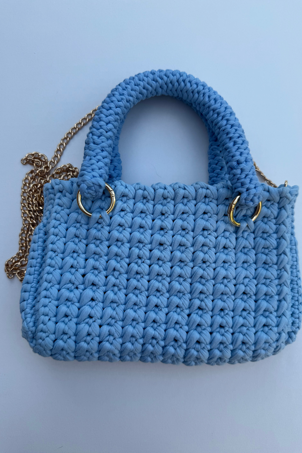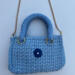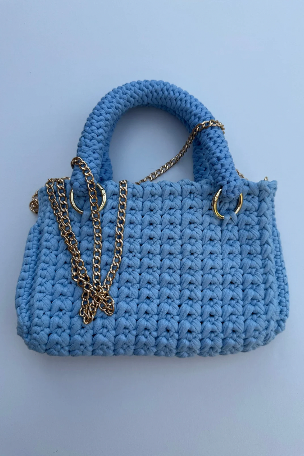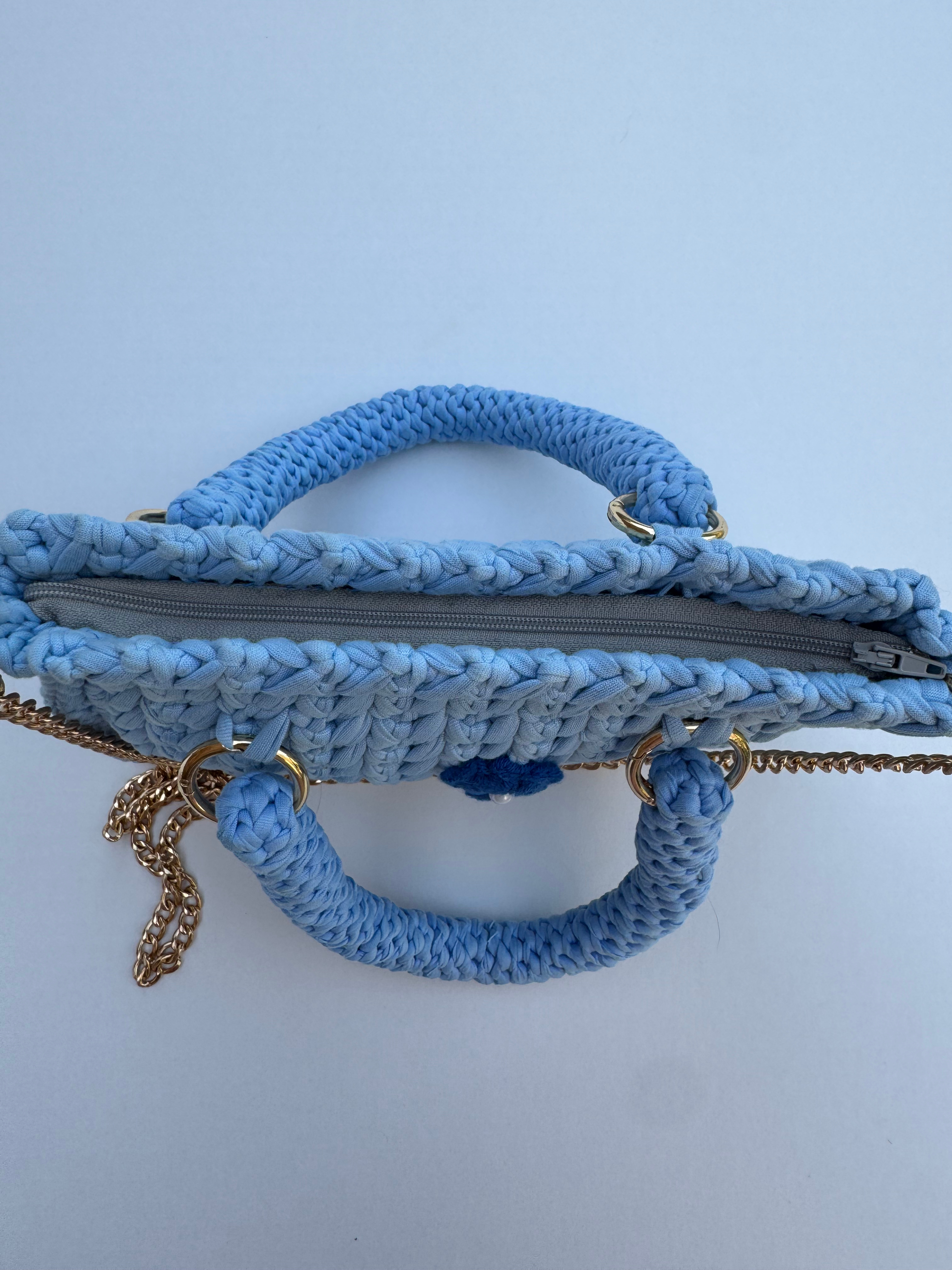 Carry elegance with a handmade touch. The Azzure Bloom Crochet Bag is crafted with soft, durable T - Shirt yarn and beautifully detailed with a small crocheted dark blue flower and pearl accent. Inside it's fully lined with smooth satin for a luxurious feel and extra protection for your essentials.