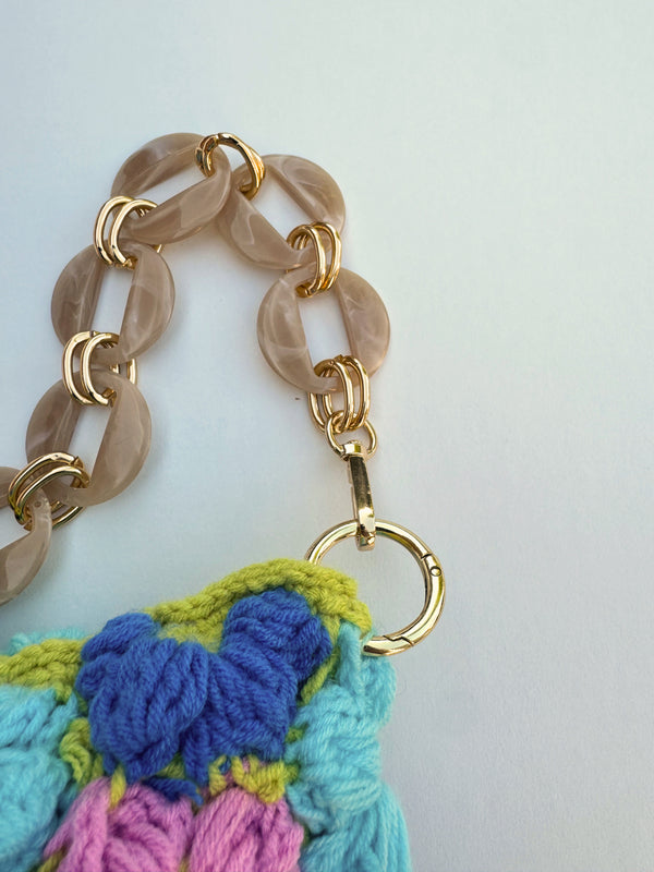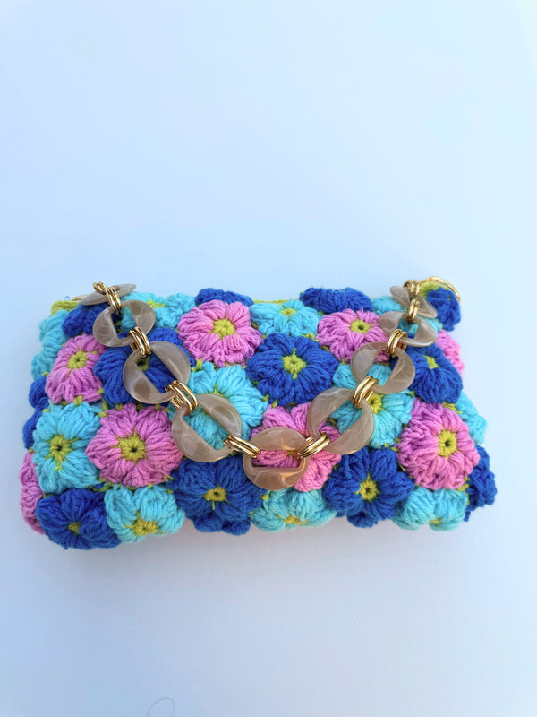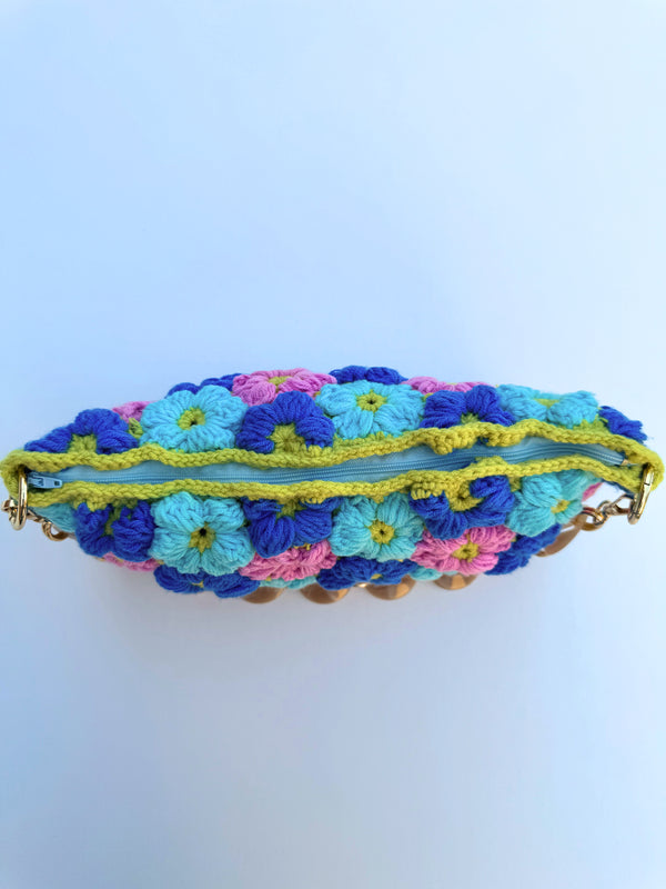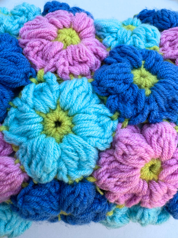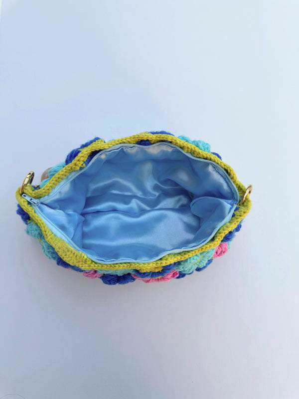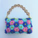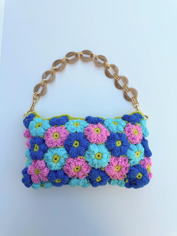 Add a burst of floral charm to your outfit with this handcrafted crochet bag, featuring a delightful arrangement of textured puff flowers in vibrant hues of blue, pink, and aqua . Each flower is carefully stitched for a unique mosaic look that's both playful and elegant.