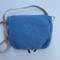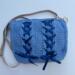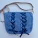 Designed in a soft blue yarn with satin ribbon details woven through the front, this bag has a delicate, romantic look that makes a stand out .