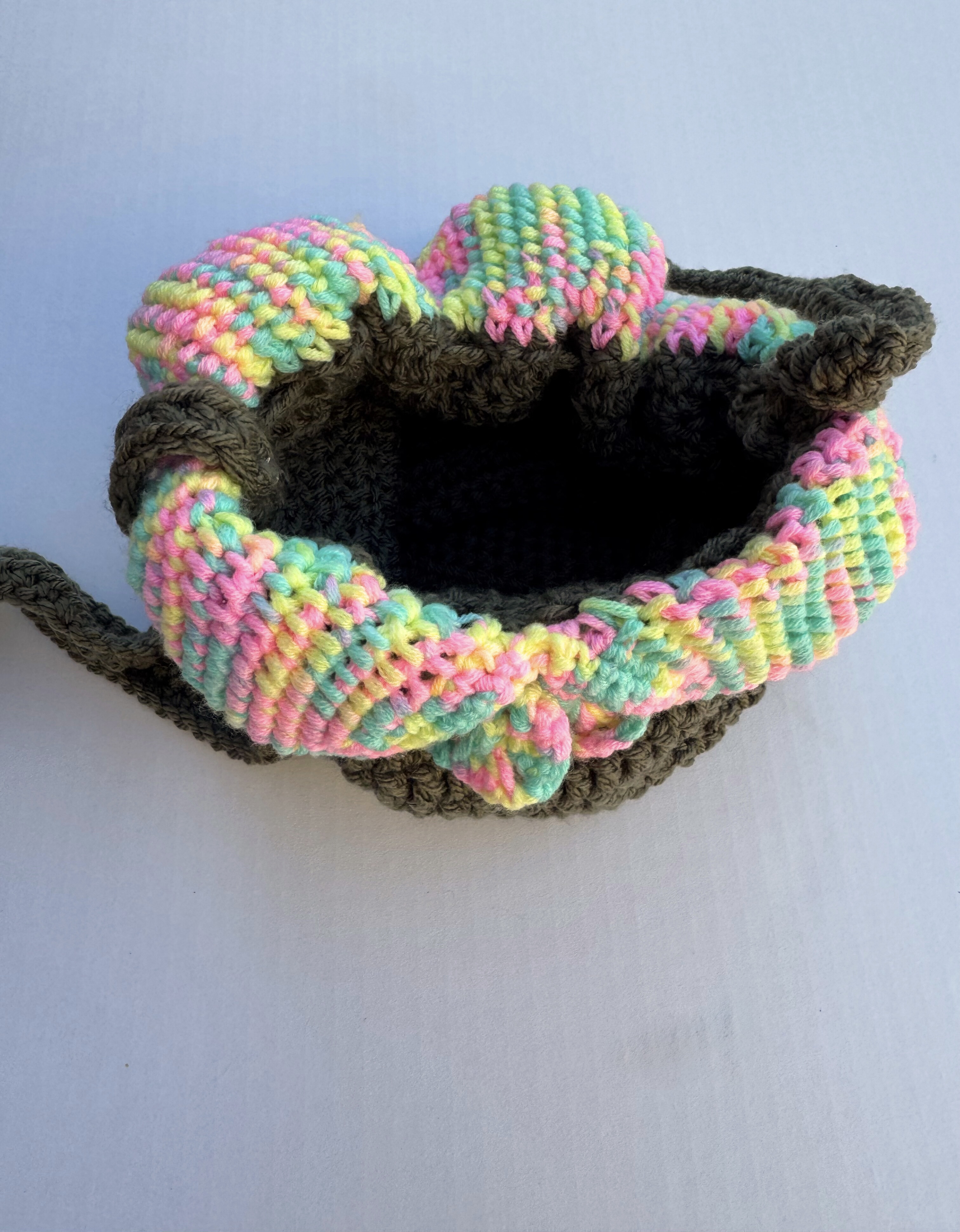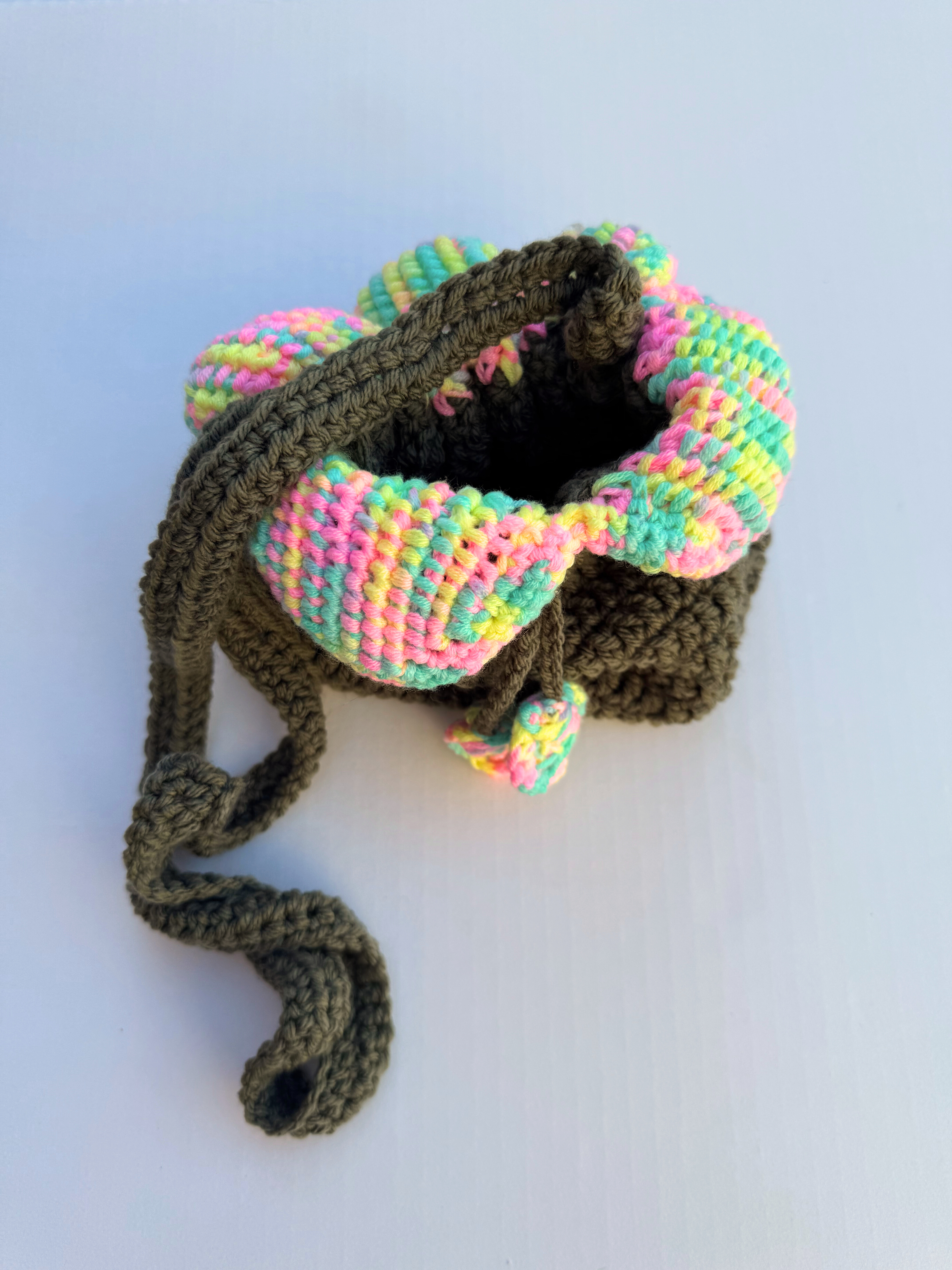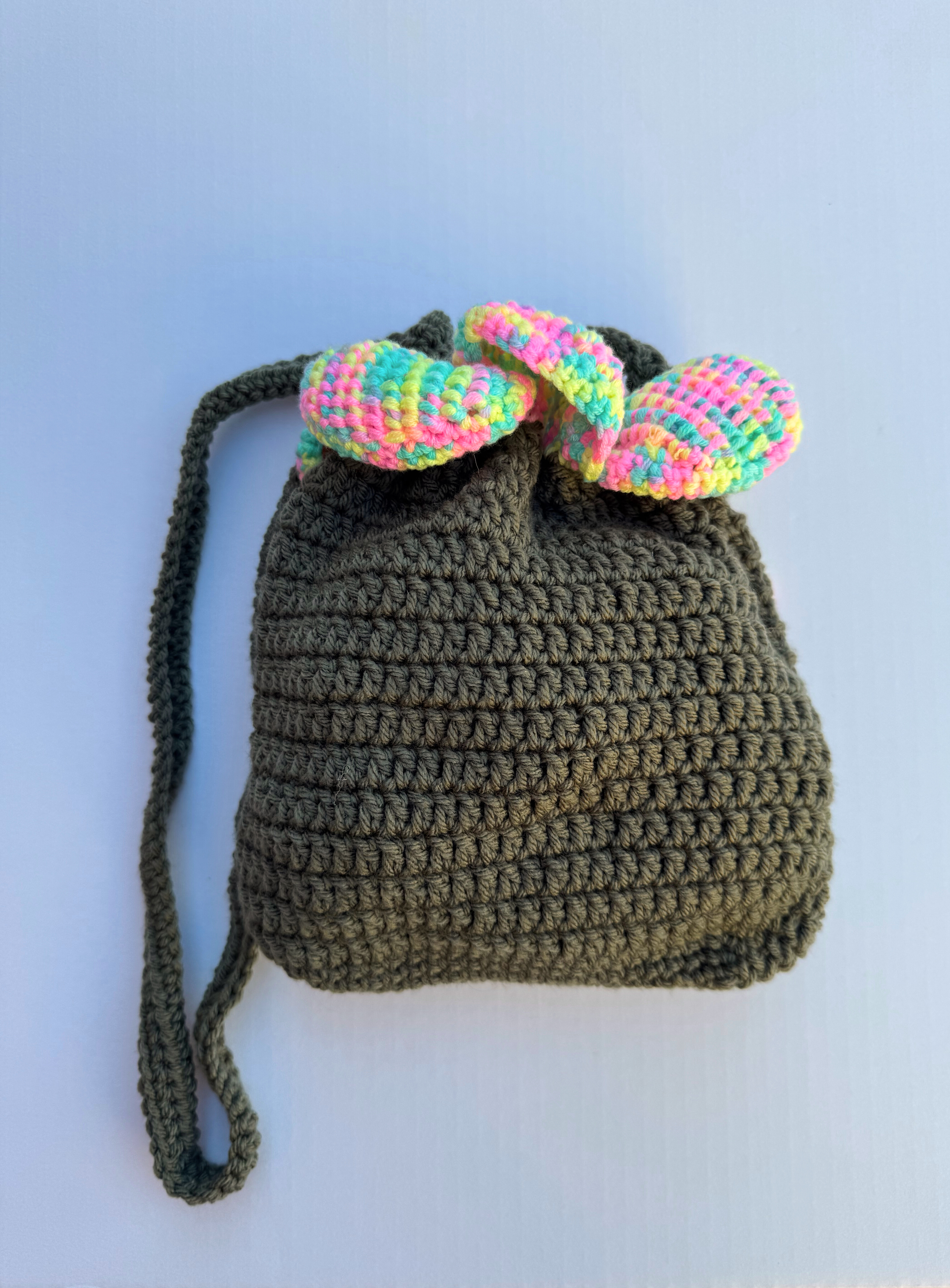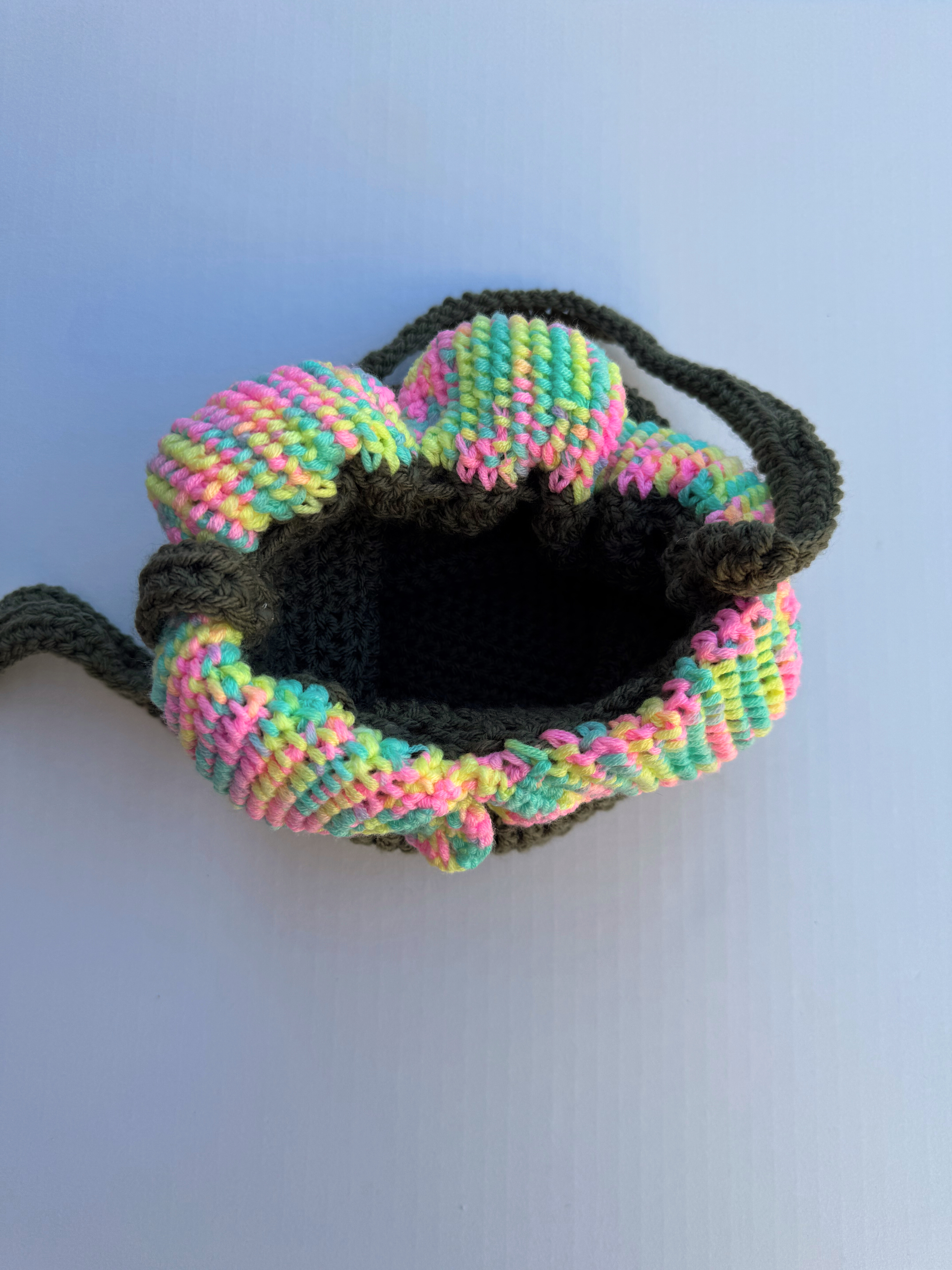 Carry a touch of handmade charm with this Drawstring Bag, crafted with dark olive yarn and a colorful pastel top that resembles a blooming flower, this bag brings both texture and creativity to your outfit.