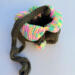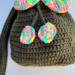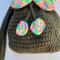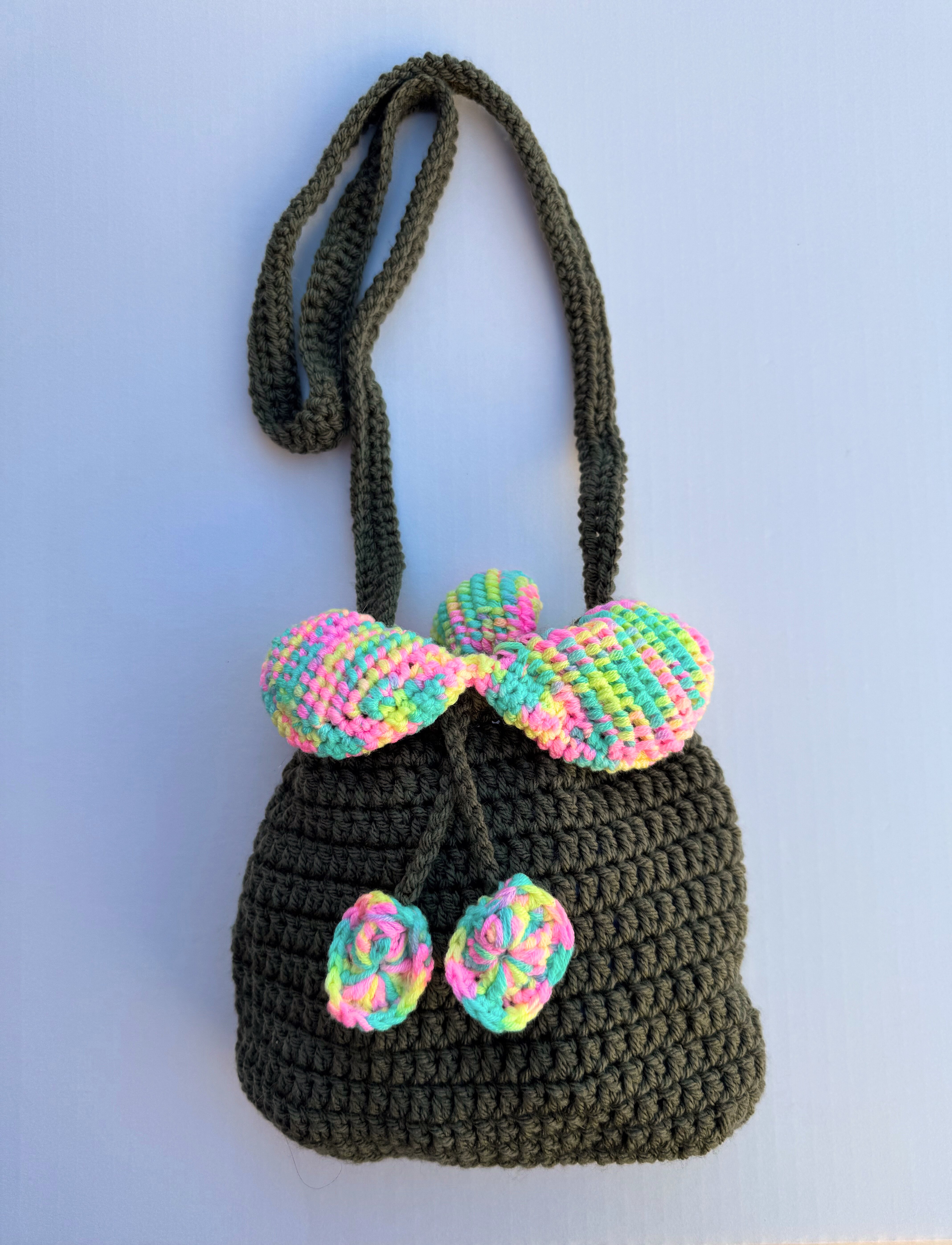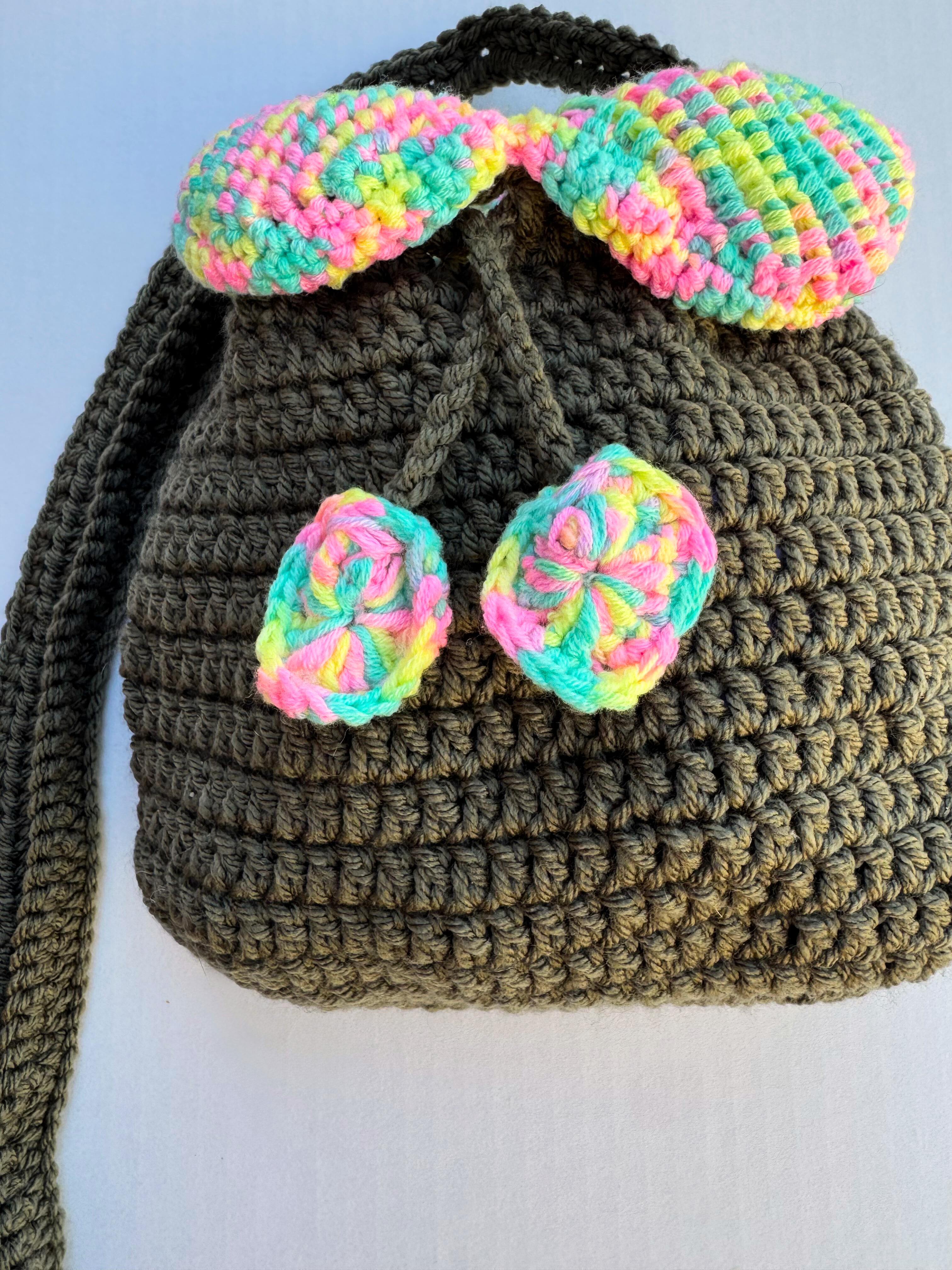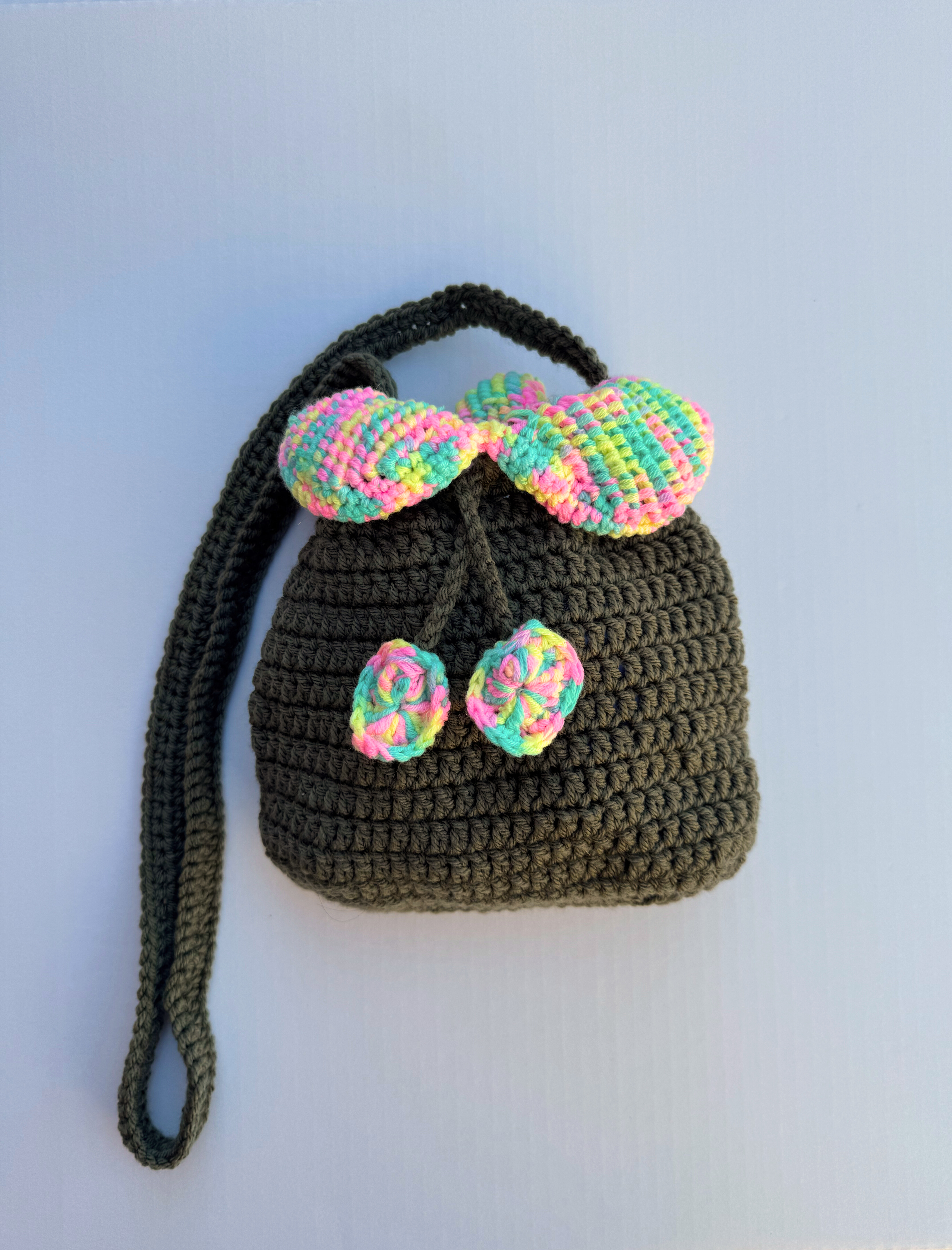 Carry a touch of handmade charm with this Drawstring Bag, crafted with dark olive yarn and a colorful pastel top that resembles a blooming flower, this bag brings both texture and creativity to your outfit.