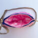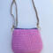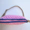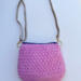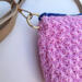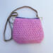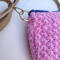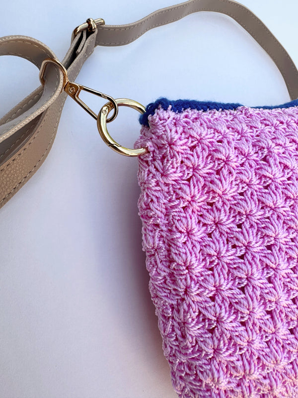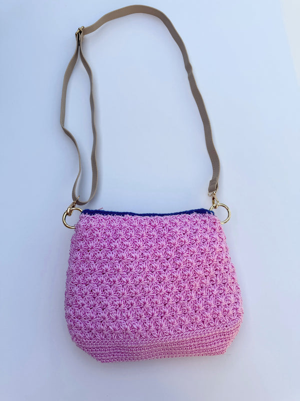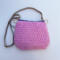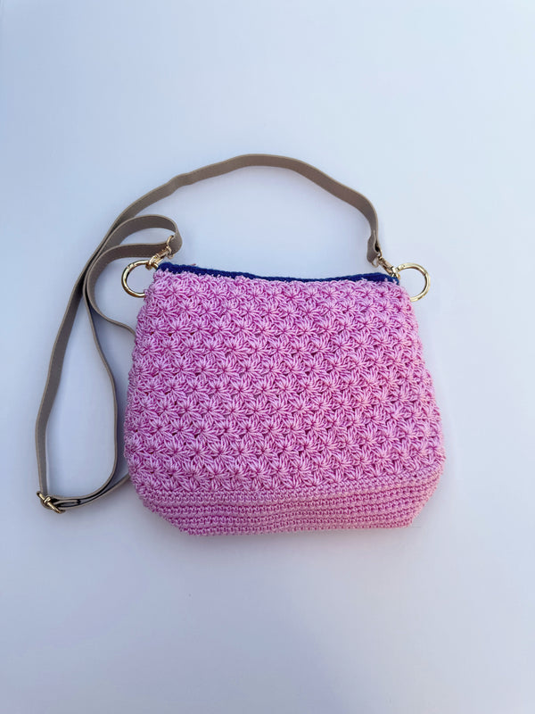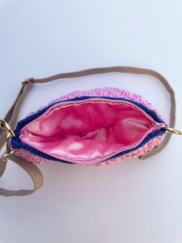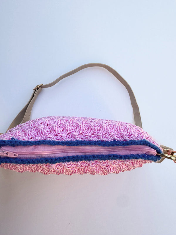 Add a pop of color and texture to your look with this beautiful handcrafted crochet bag . Made with durable nylon mesh cord in a delicate pink hue, this bag features an eye-catching star stitch pattern and a decorative blue yarn border along the top edge. It's fully lined with soft satin fabric for a smooth interior finish and secured with a zipper closure to keep your essentials safe.